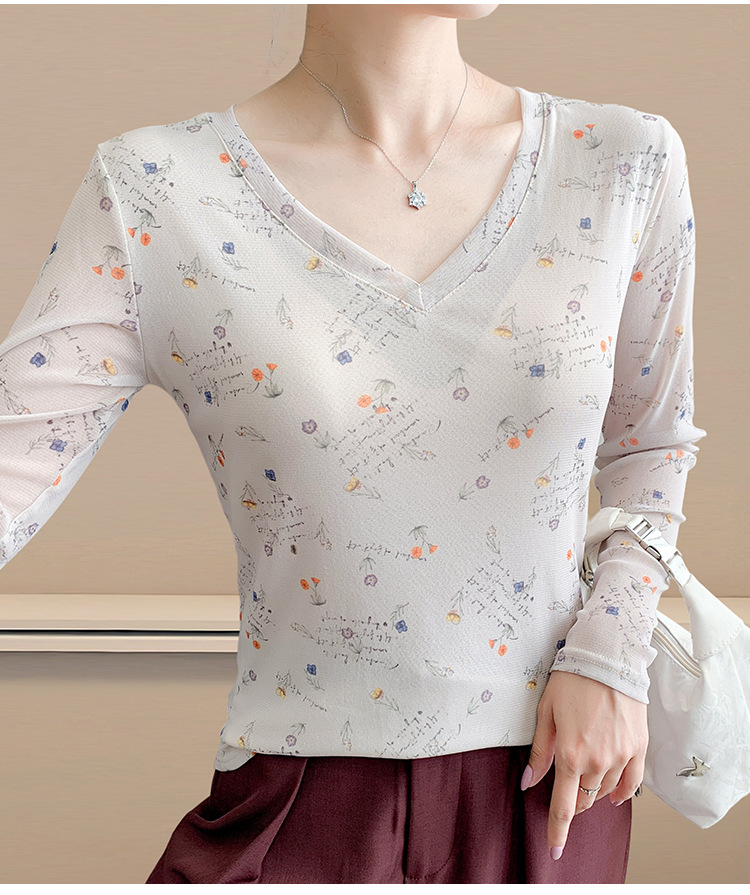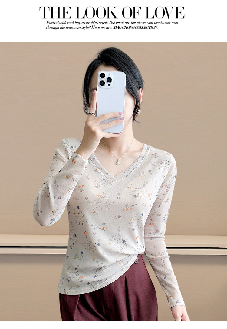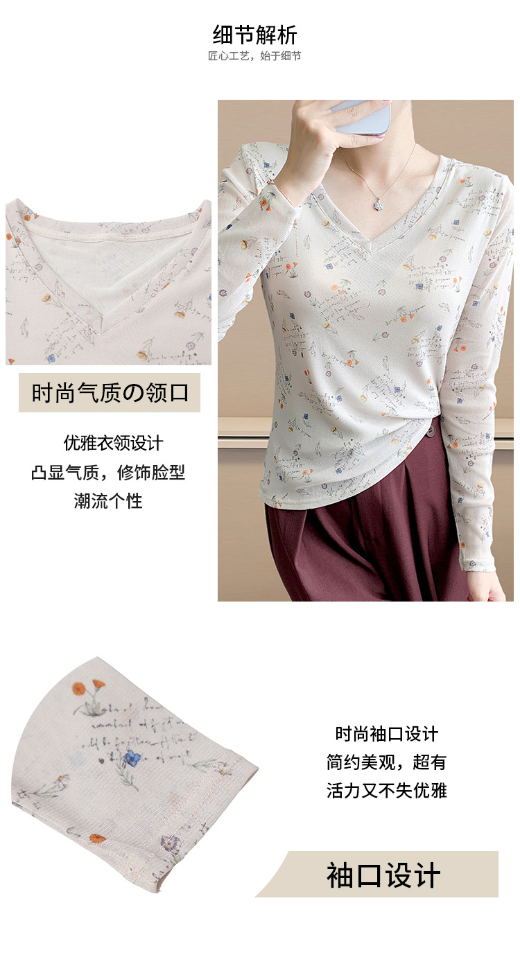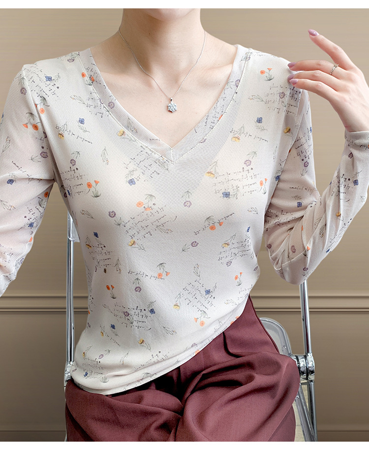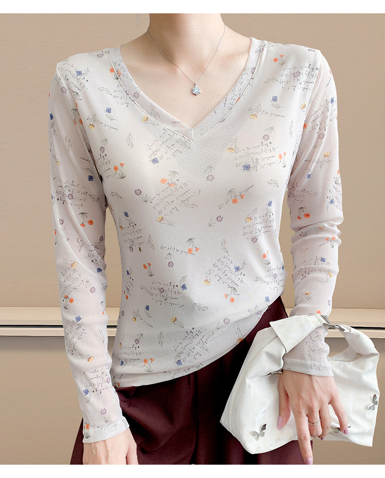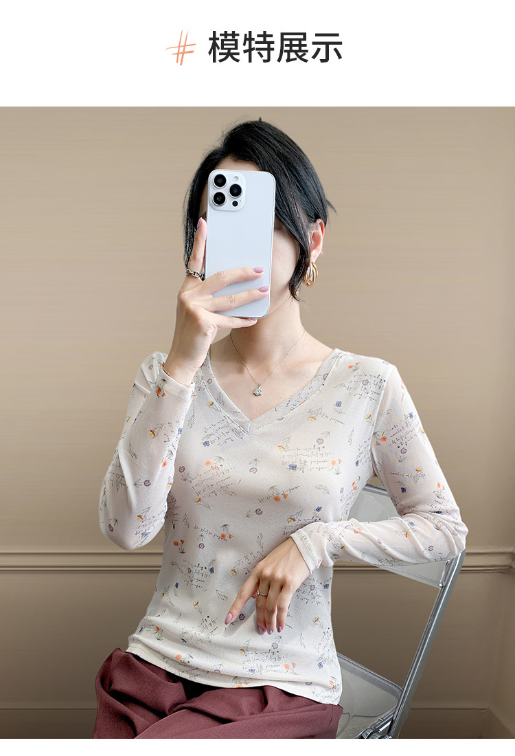 KQL A55F8588时尚洋气高弹网长袖印花V领T恤打底衫