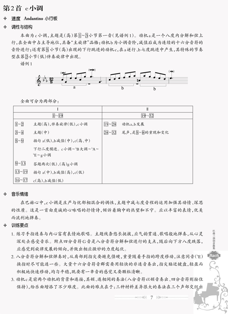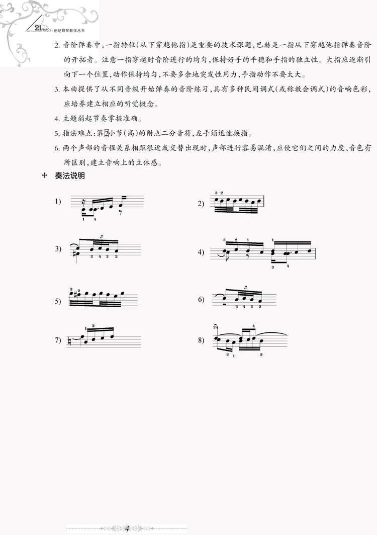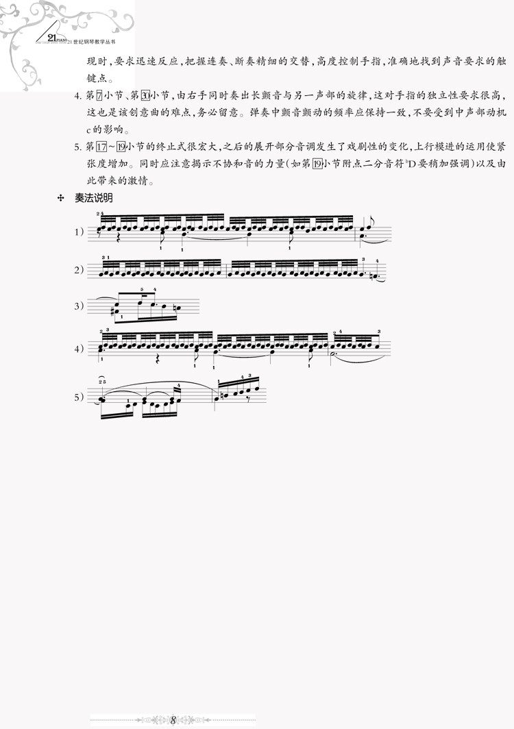在本书中,对乐曲的速度、音乐情绪、演奏方法等作了阐述,对创意曲的创作脉络即结构配以图表,使学习者一目了然的对乐曲的框架了如指掌。在每首乐曲的后面除了结构图表,本书还配有非常详细的速度分析、音乐情绪分析、训练要求、奏法说明等内容。特别是训练要求中尤为详尽,有旋律性的分析、手指进行的分析、调式调性的分析、节奏的处理分析、声部交替的分析、还有乐曲难点分析等内容,这些内容给学习者提供了更多的方便与帮助。