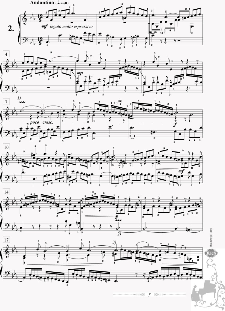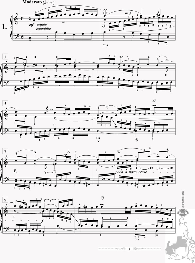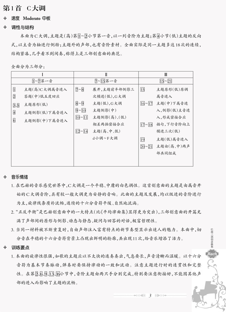 巴赫《三部创意曲》是指三个声部自由对位的复调性钢琴短曲,采用了在四升四降之内的大小调,并省略了在当时极少使用的几个调。全书一共分为15首乐曲,如C大调、c小调、D大调、d小调、降E大调等。《三部创意曲》对学生的立体式思维训练、双手的协调能力、各个手指的独立性以及多声部的听辨能力提出了更高的要求。