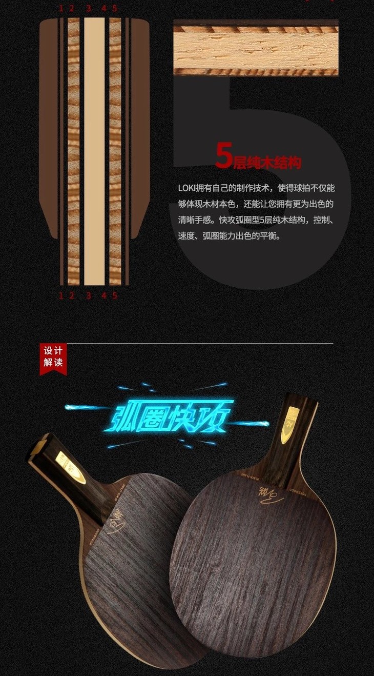 LOKI雷神黑炎乒乓球拍底板烈焰系列王皓代言5层纯木弧圈快攻正品