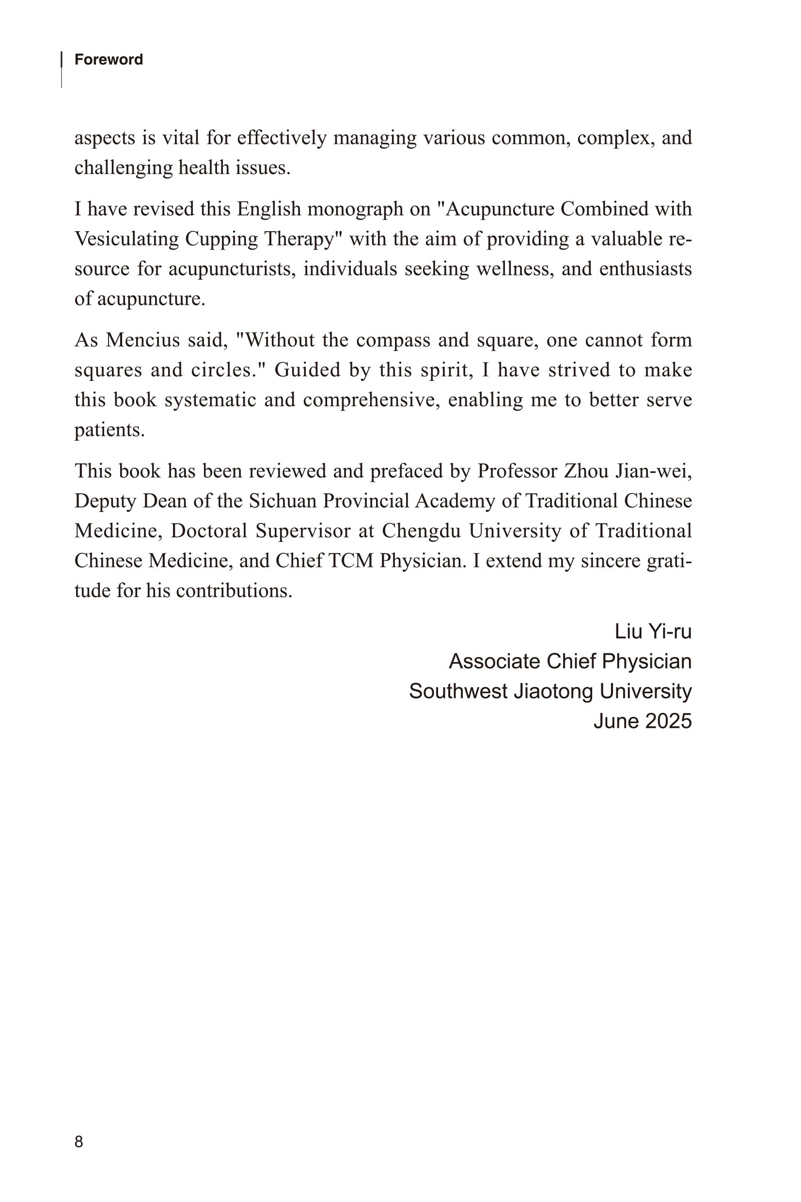 西南交通大学峨眉校区医院刘一儒副主任中医师,四代业医,自身从事中医工作也有40余载。她酷爱中医事业,敏而好学,踏实勤奋,锐意进取,刻苦钻研针灸之术,医疗技艺娴熟,临床经验丰富,尤其对采用针刺拔罐疗法治疗疾病的应用颇具心得。在临床工作中,她大胆创新,不断探索,系统整理,潜心研究,创立“针刺拔罐发泡疗法”“拔罐发泡疗法”,是对传统拔罐疗法的创新、丰富和发展。