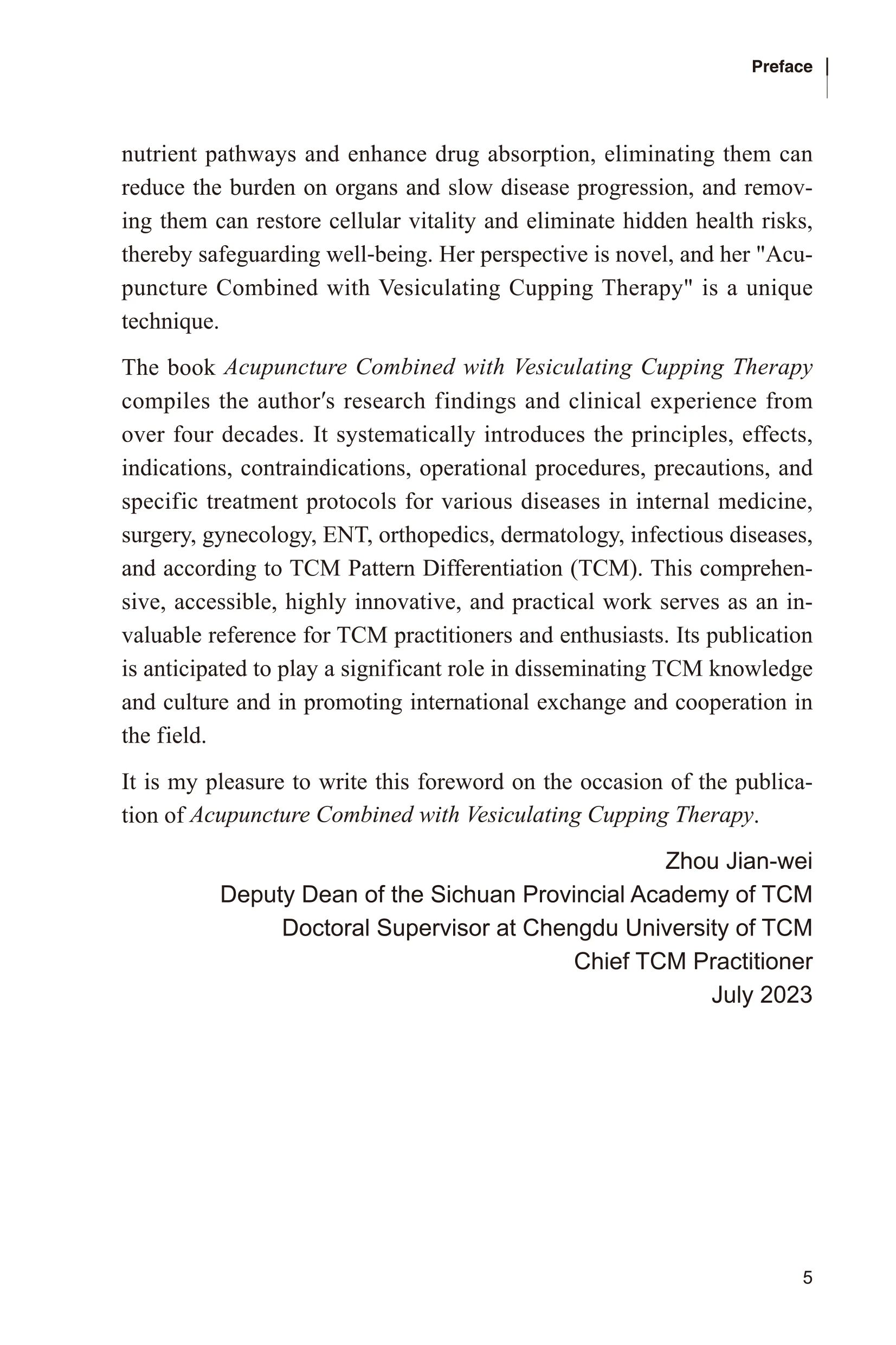 《针刺拔罐发泡疗法》(英文版)凝聚了作者四十多年的研究成果与临床经验,系统阐述了该疗法的治病原理、作用、适应证、禁忌证、操作方法与注意事项等技术规范,并针对内科、外科、妇科、五官科、骨科、皮肤科、传染科及各类中医证候的病因与具体治疗方法进行了深入浅出的介绍。全书内容通俗易懂,兼具新颖性与实用性,对广大中医药工作者及爱好者具有重要的参考价值。该书的出版,对传播中医药知识与文化、促进中医药国际交流与合作,必将发挥积极作用。
