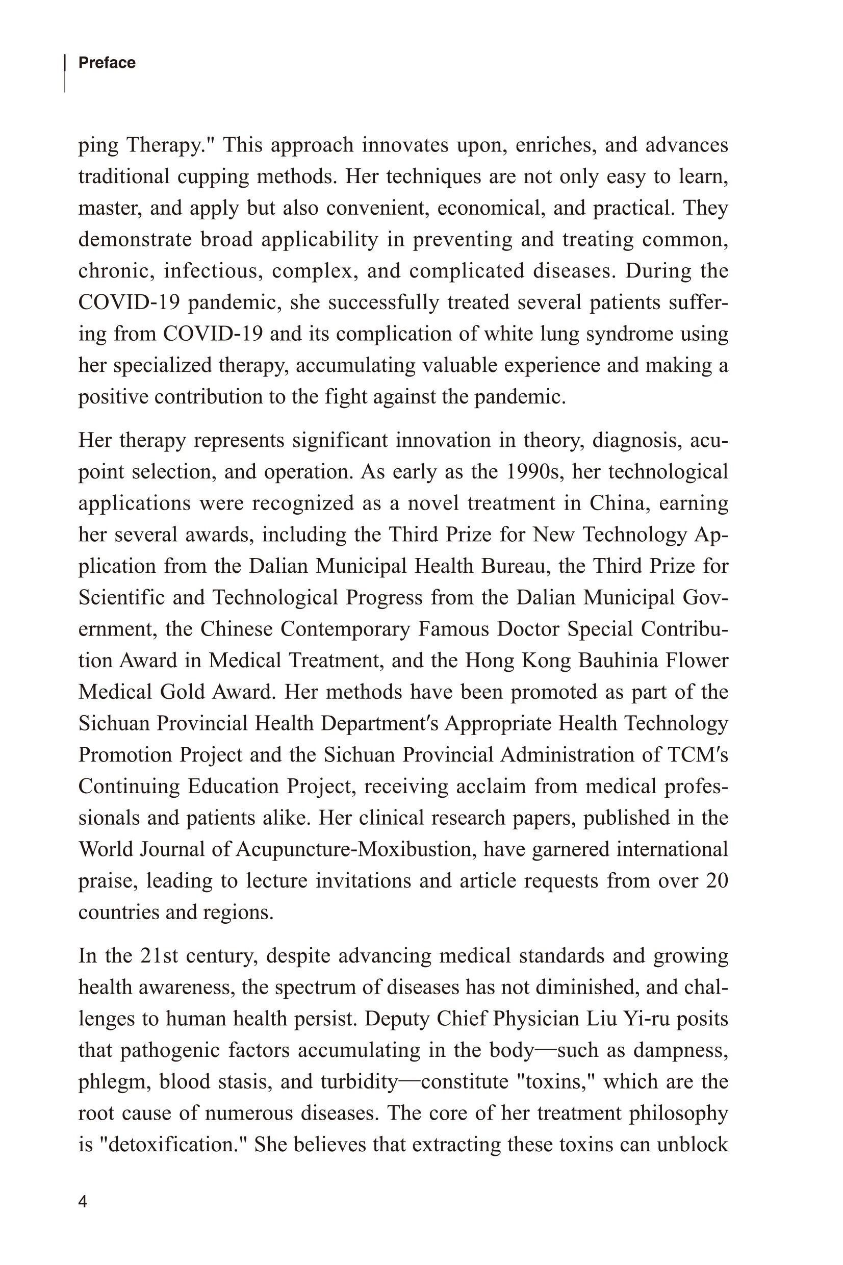 进入21世纪,随着社会进步,人们越来越重视健康,医疗水平也不断提升,然而疾病种类并未减少,人类面临的健康挑战依然复杂多样。刘一儒副主任中医师认为,蓄积于人体内的水湿、痰饮、瘀血、沫等病理产物皆属“毒邪”,为百病之源。治疗的关键在于“排毒”:通过拔除体内病毒,可畅通营养通道,增强药物吸收;通过排出体内毒素,能减轻脏腑负担,延缓疾病进展,恢复细胞活力,消除健康隐患,从而为人类健康保驾护航。其观点新颖,所采用的“针刺拔罐发泡疗法”也独具特色。