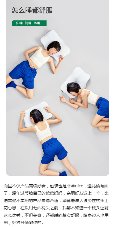 1、独家首创创新分区,枕面贴合脸部曲线,改善法令纹及睡眠静态纹