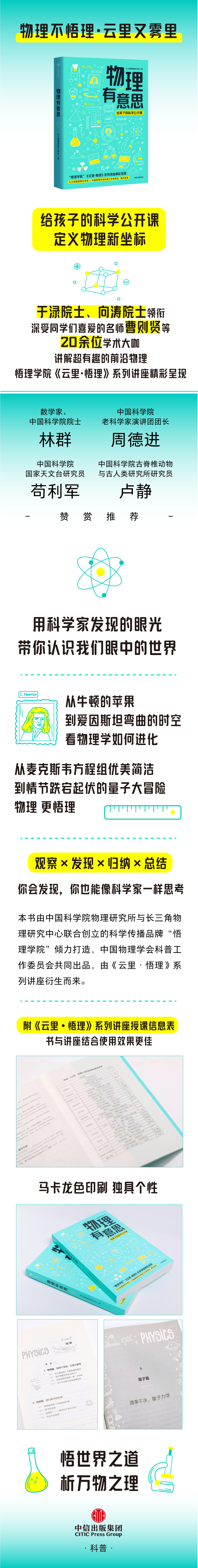 这是一本给中学生的物理学课外科普读物,由中国科学院物理研究所众多院士、研究员打造的线上讲座《云里•悟理》衍生而来。《云里 悟理》系列微课,由中科院20余位学术大咖讲解有趣的严肃物理,力图将物理学规律与日常生活紧密结合起来,用诙谐生动的语言把重要的物理概念和物理知识展示出来,用充满趣味的“微课”形式,丰富物理爱好者的网络学习资源,促进物理教育的可持续发展,为打赢疫情阻击战贡献一份力量。悟世界之道,析万物之理,《云里 悟理》,给你有趣的严肃物理!物理是一门研究世界客观存在的学问,是如今科技发展的重要根基。这本书用有趣平实的语言,推开了通往奇妙物理世界的大门:书中用生动的例子解释物质、运动、能量等概念,读者可以举一反三了解物理学科如何看待世界;当书中深入探讨量子世界时,读者又仿佛跟随着光子的脚步,体会物理师们的深邃思想,感受量子计算的神奇。这本书不仅仅是一本科普读物,更是一场充满惊喜和启发的物理探索之旅,和读者一起探讨什么是物理、现代物理学将如何发展,在探索的过程中培养和激发对科学的无限热爱和好奇心。
