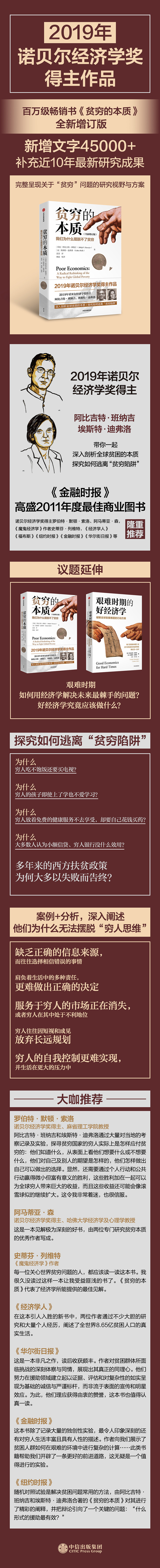 《 贫穷的本质》为我们带来了远离党派之争的清醒之音。这本书凝结 了麻省理工学院两位著名经济学家15 年遍及全球的实证研究与随机对照试验的心血。他们系统检视了贫困对个人与社会的多重影响,颠覆了政府、援助组织及非政府组织普遍持有的传统认知,而这些认知正深刻影响着援助资金与人道救助的分配方式。