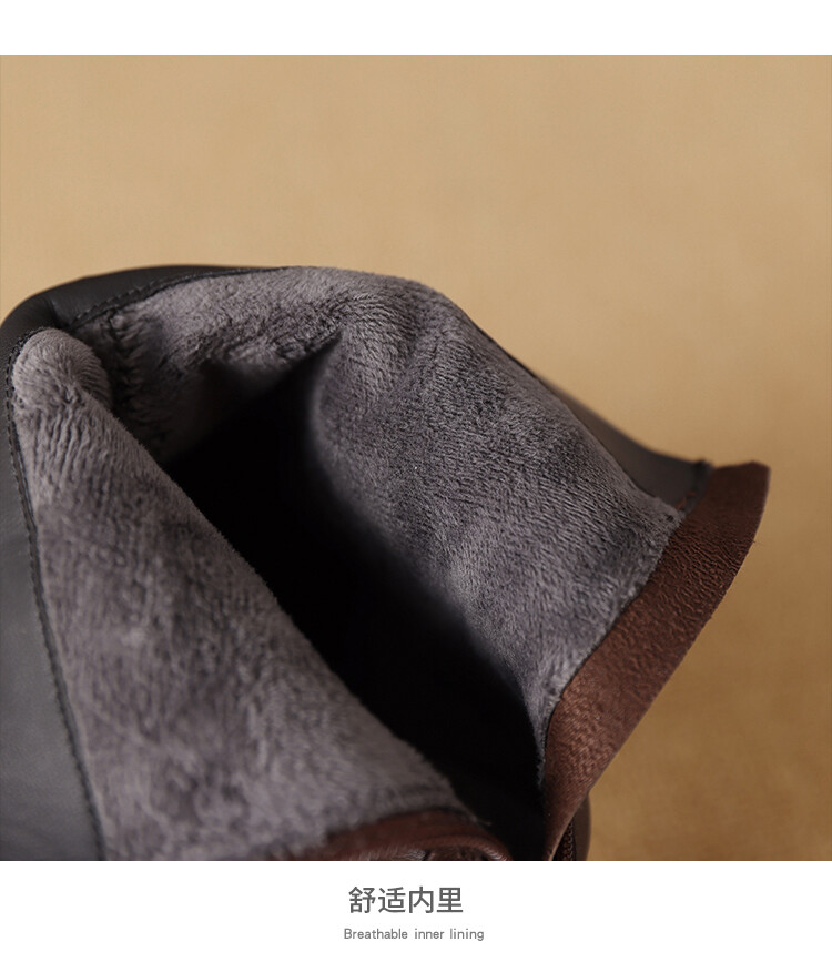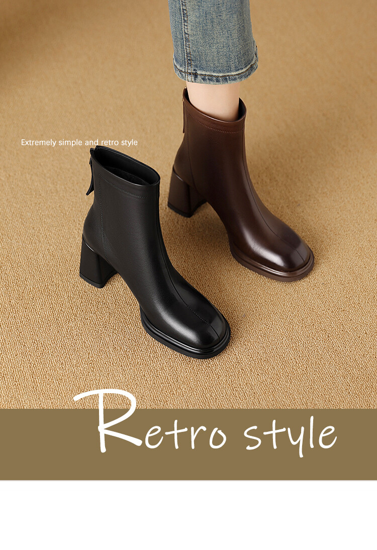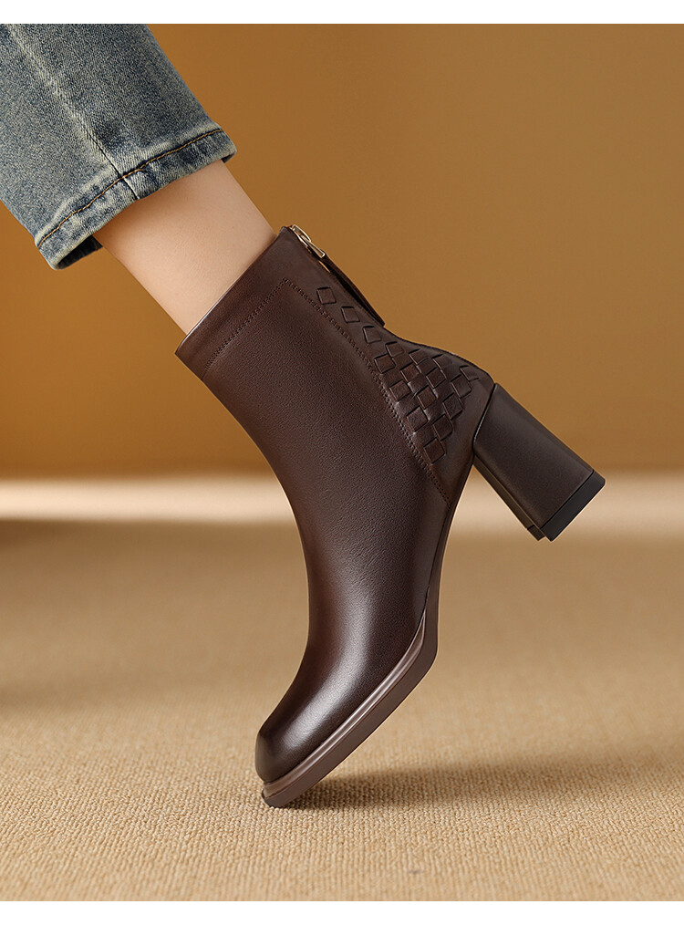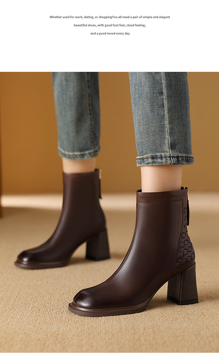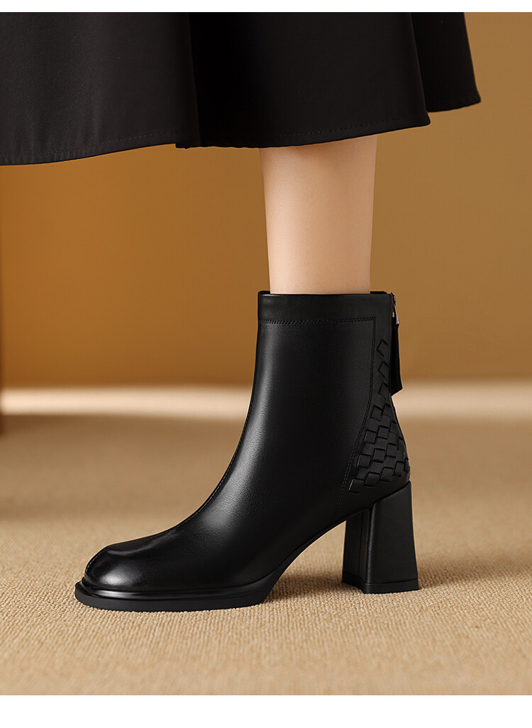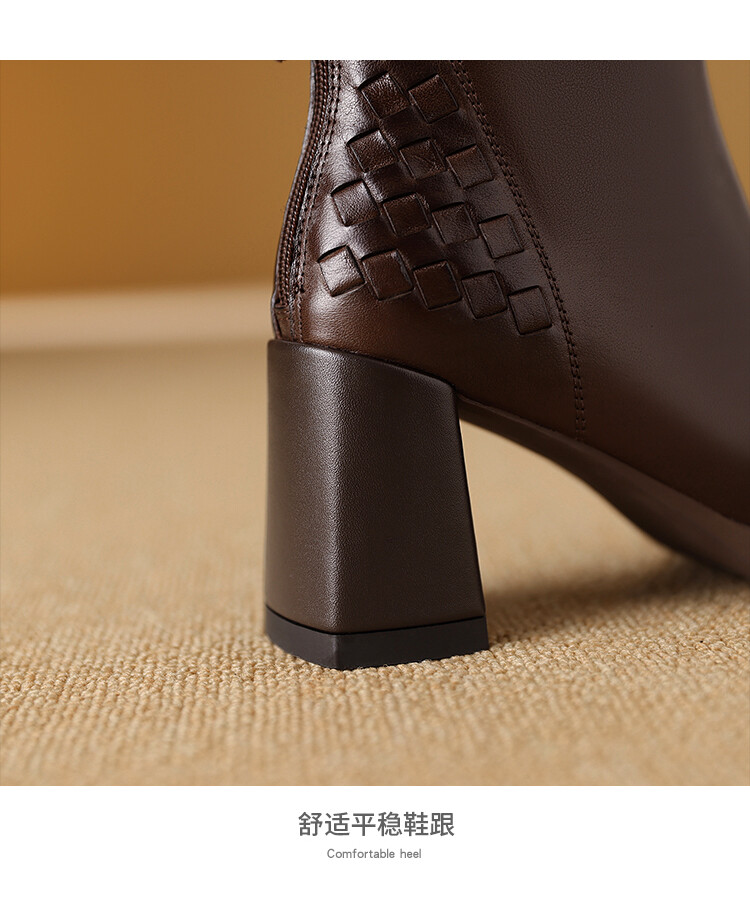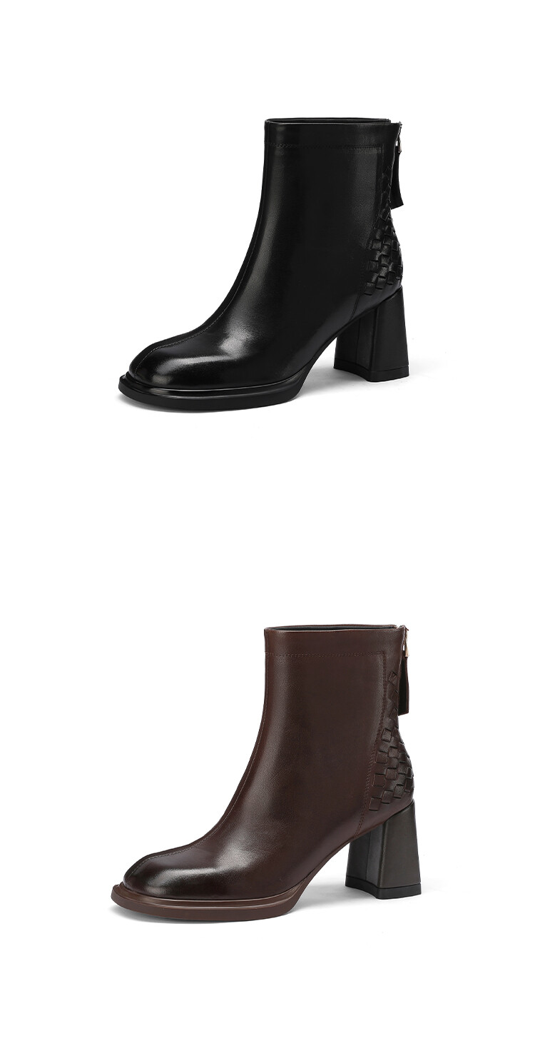 【预售5天】秋冬时尚复古真皮编织拼接方头粗跟后拉链简约百搭高跟短靴AAA&H131-1