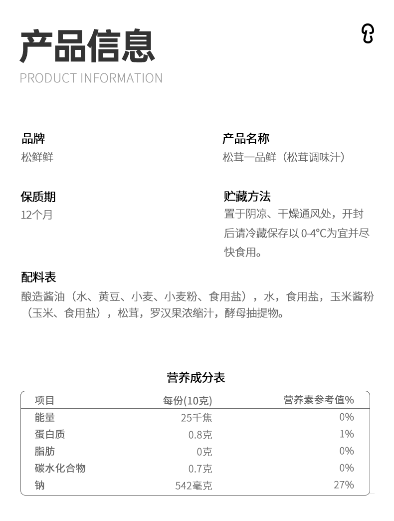 【品名】松鲜鲜松茸一品鲜 【保质期】:12个月 【生产日期】:2024.12 【产地】:浙江 【发货仓库】:江苏无锡自营仓,安徽郎溪,广东东莞仓,天津九邦(随机发) 【发货快递】:中通、圆通、申通、韵达,邮政随机发货 【发货时间】:48-72小时(如遇天气或爆单原因会有一定延迟,急单慎拍) 【发货区域】:港澳台不发,新疆,西藏,内蒙,甘肃,宁夏,青海,海南+12元/件 【是否支持七天无理由退换】:食品类,不支持七天无理由退换 【售后标准】:质量问题或发错货签收后24小时内联系客服处理:问题产品和快递单【合影拍照(照片+视频)】 【储存方法】:置于阴凉干燥处,避光储存,开封后需冷藏,以0-4℃为宜 【⚠️致敏物提示】本品含有大豆及其制品、含有麸质的谷物及其制品。