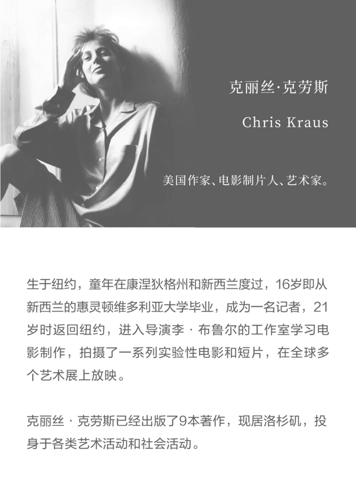 克丽丝·克劳斯(Chris Kraus,1955— ),美国作家、电影制片人、艺术家。生于纽约,童年在康涅狄格州和新西兰度过,16岁即从新西兰的惠灵顿维多利亚大学毕业,成为一名记者,21岁时返回纽约,进入导演李·布鲁尔的工作室学习电影制作,拍摄了一系列实验性电影和短片,在全球多个艺术展上放映。