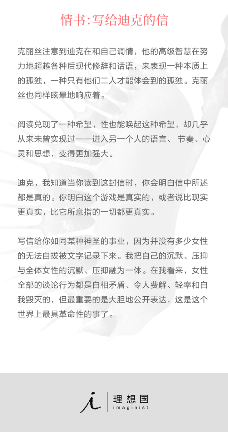 “所以难道你没发现吗?”我说,“相比游戏,这更像是个项目。 我在给你的那些信里写下的每个字都是真心的,但同时,我开始将其看作一次最终能了解爱情和迷恋的机会。因为你让我想起了很多自己在新西兰时爱过的人。你不觉得在做某件事的同时对它进行研究,也是可能的吗?要是给这个项目起个名字,它就叫《我爱迪克: 一个案例研究》。”