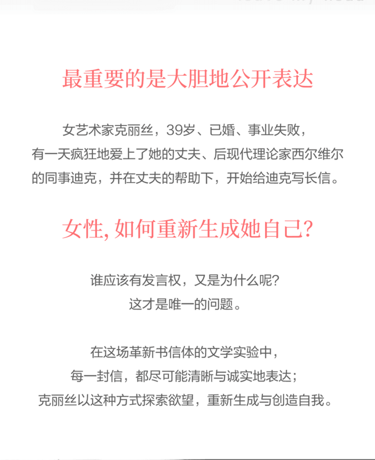 “我爱迪克”——这是一句炽热而坦荡的单恋声明,也是一场革新书信体的文学实验,更是一份英勇的女性主义宣言——关于如何使用第一人称来言说,以及女性如何重新生成她自己。