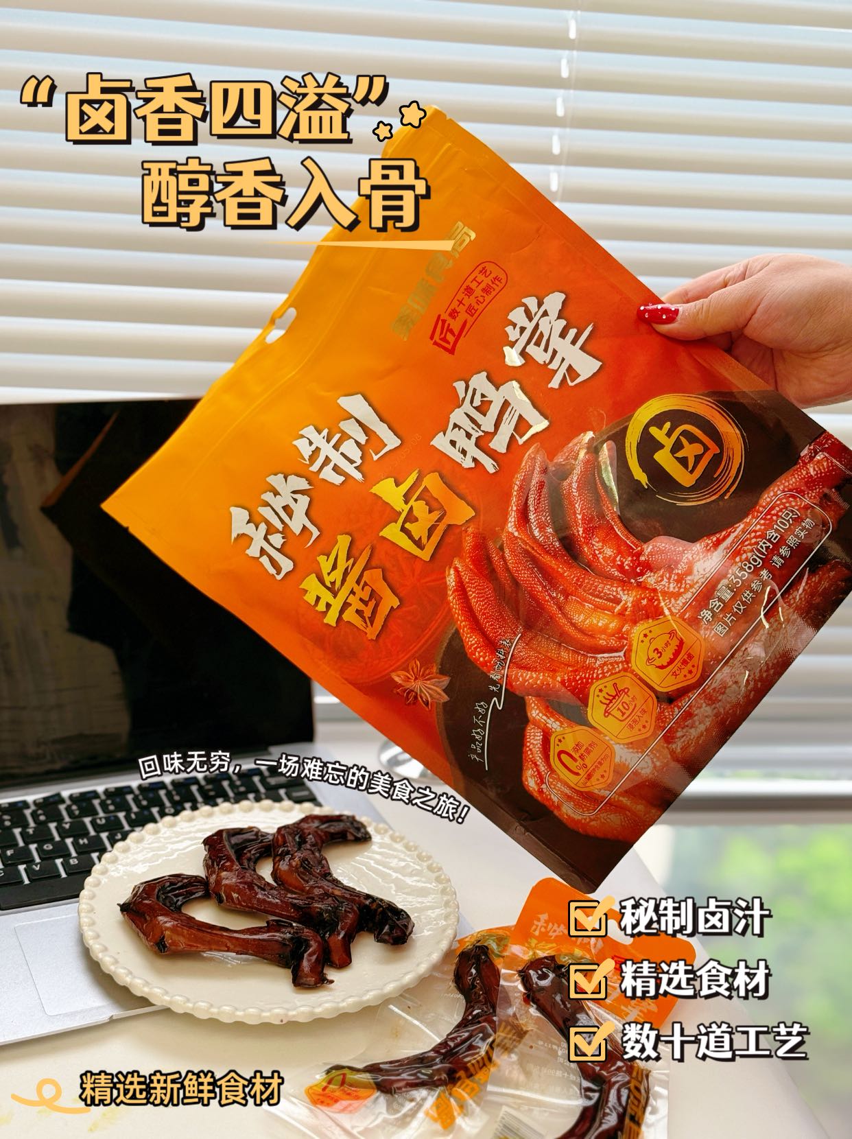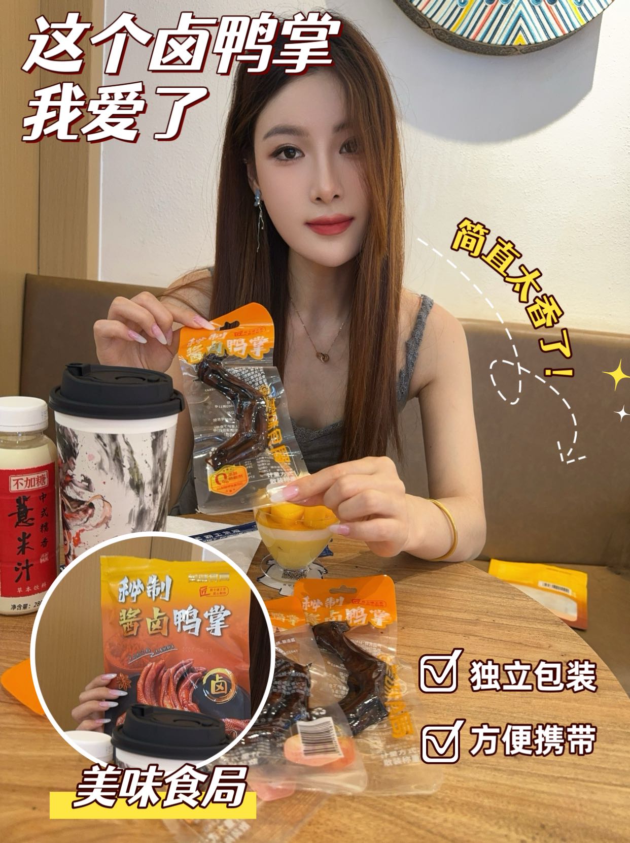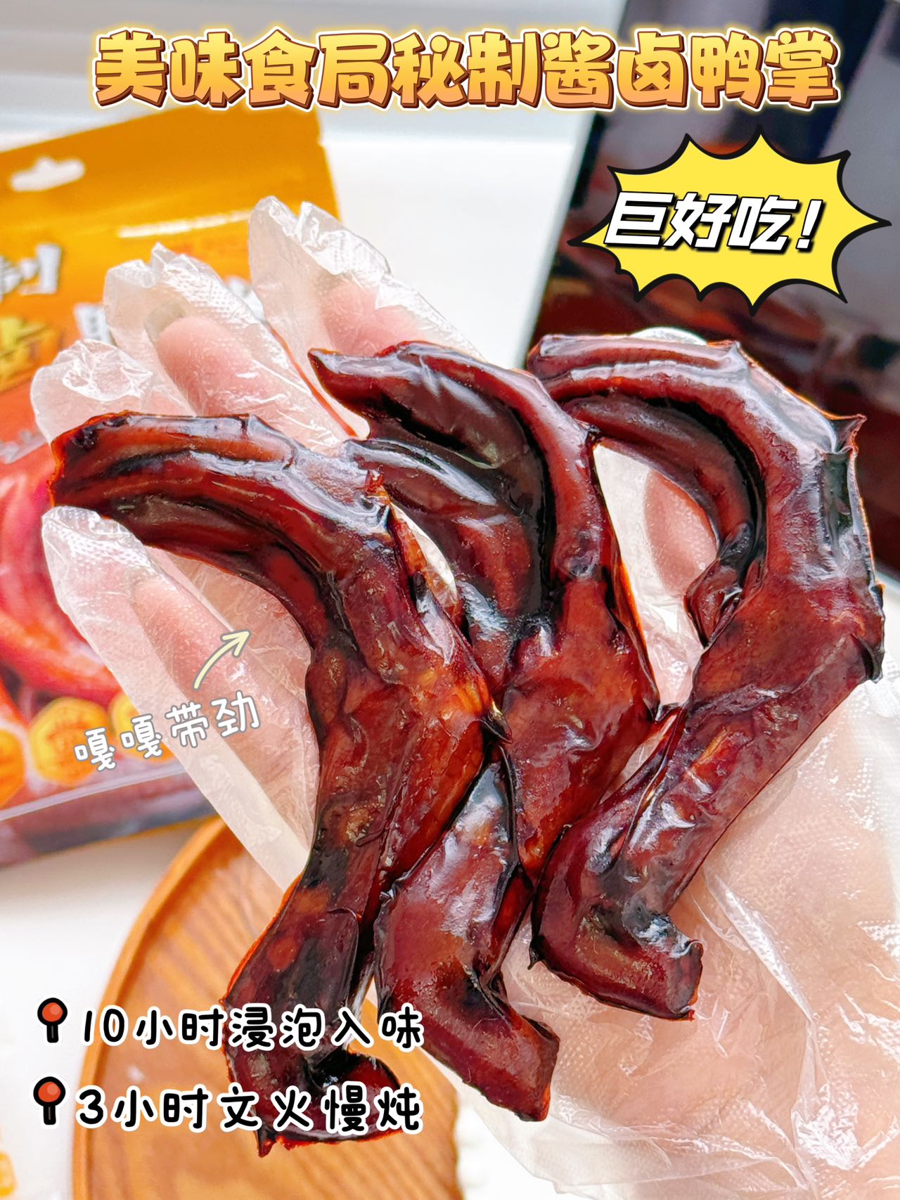 美味食局秘制酱卤鸭掌358g🧡 数十道工艺匠心制作,10小时浸泡入味 3小时文火慢炖 🧡精选上等鸭掌,确保品质卓越,新鲜无异味🥰 🧡独立包装,方便携带,闲暇时刻来一包,满足宝子们的味蕾