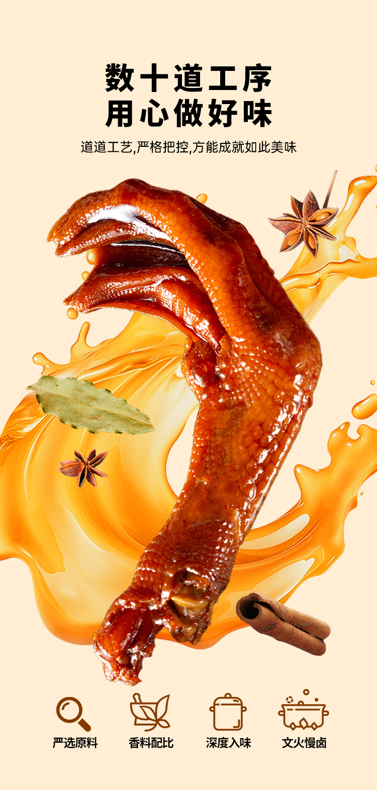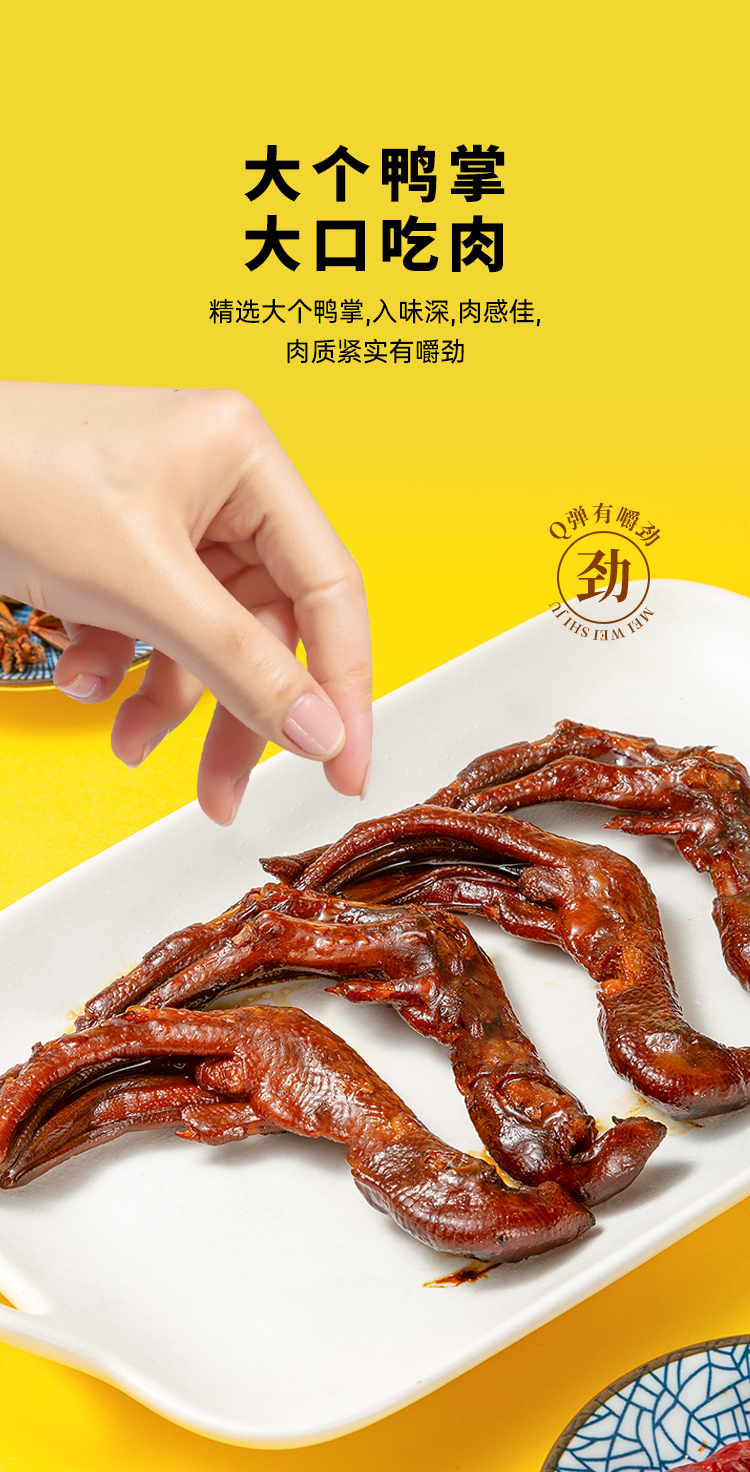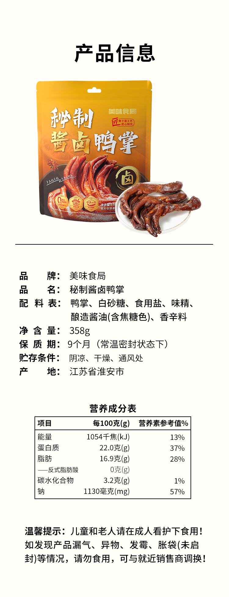 美味食局秘制酱卤鸭掌358g🧡 数十道工艺匠心制作,10小时浸泡入味 3小时文火慢炖 🧡精选上等鸭掌,确保品质卓越,新鲜无异味🥰 🧡独立包装,方便携带,闲暇时刻来一包,满足宝子们的味蕾
