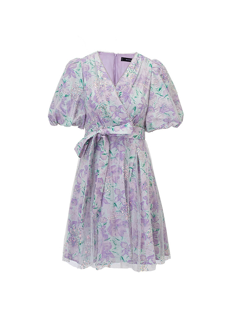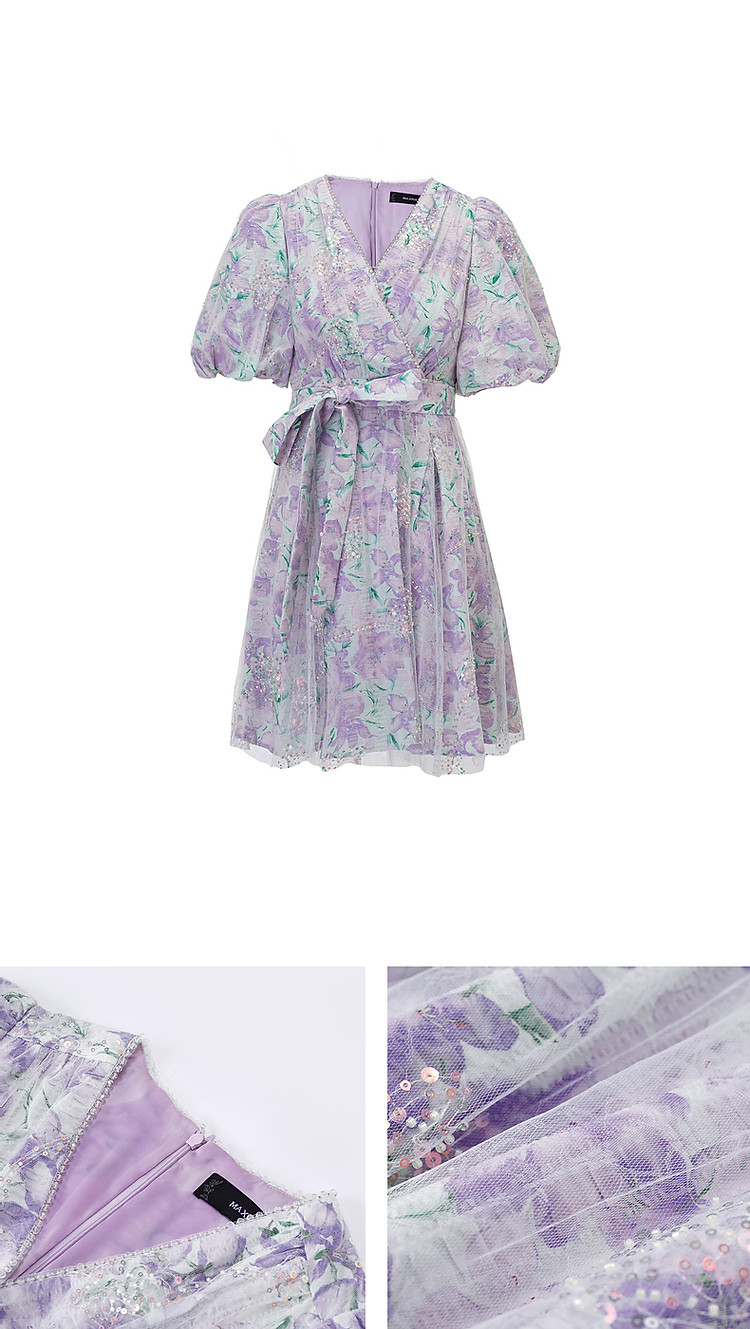 复古浪漫紫花茶歇V领显瘦连衣裙MS85DR069