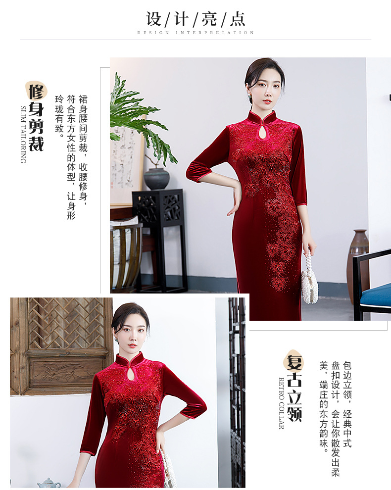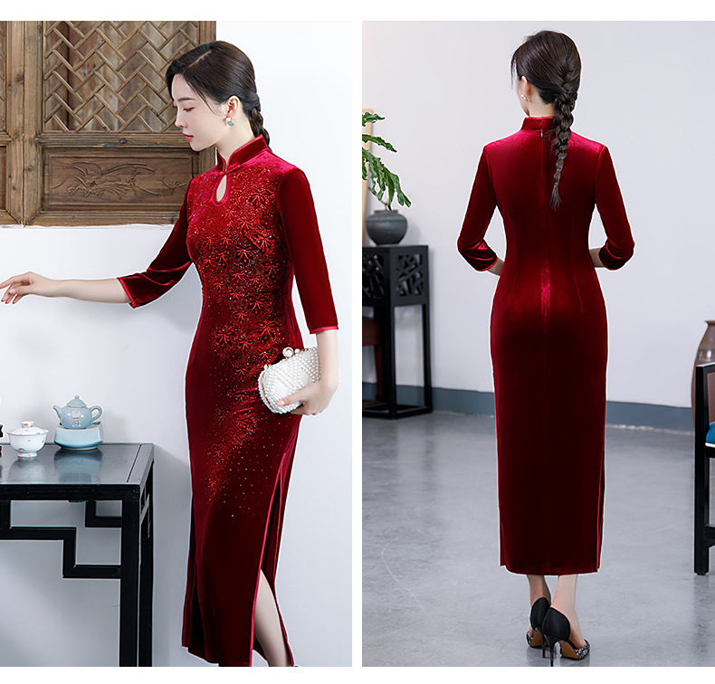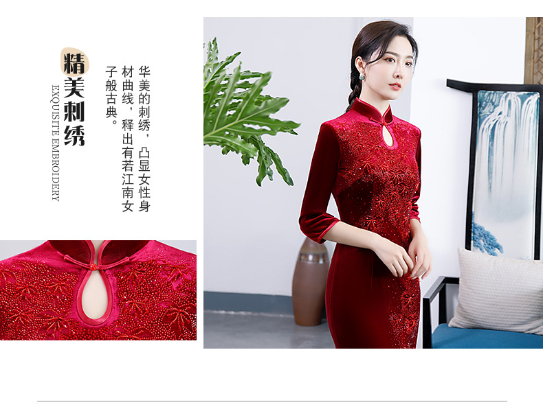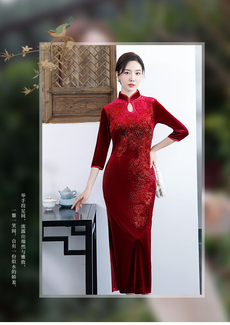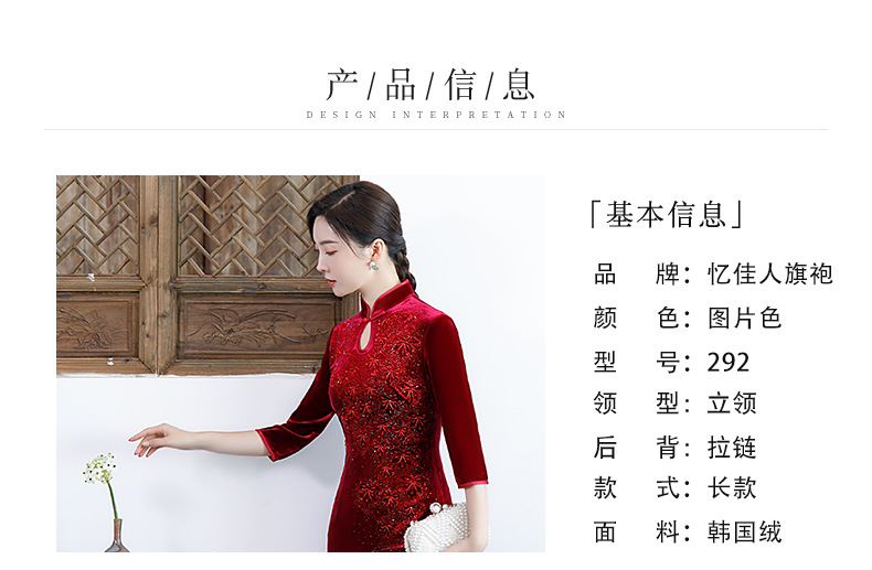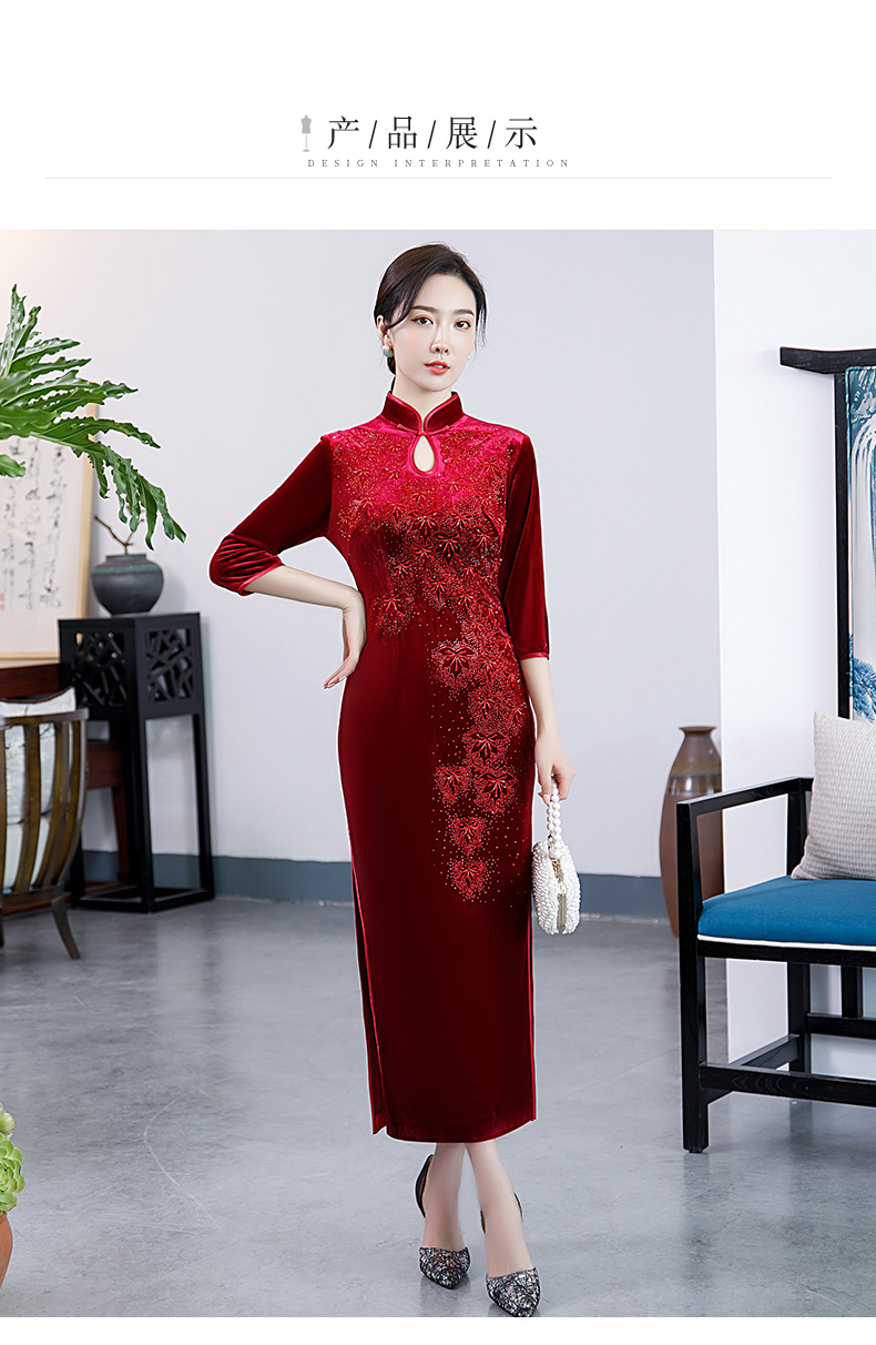 上海旗袍厂BJ-292秋冬新款韩国绒长款改良旗袍 复古优雅名媛版立领旗袍连衣裙