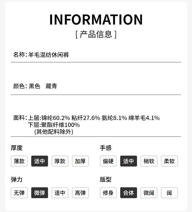 面料:上层:60.2%锦纶27.6%粘纤8.1%氨纶4.1%绵羊毛