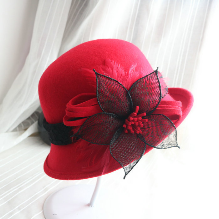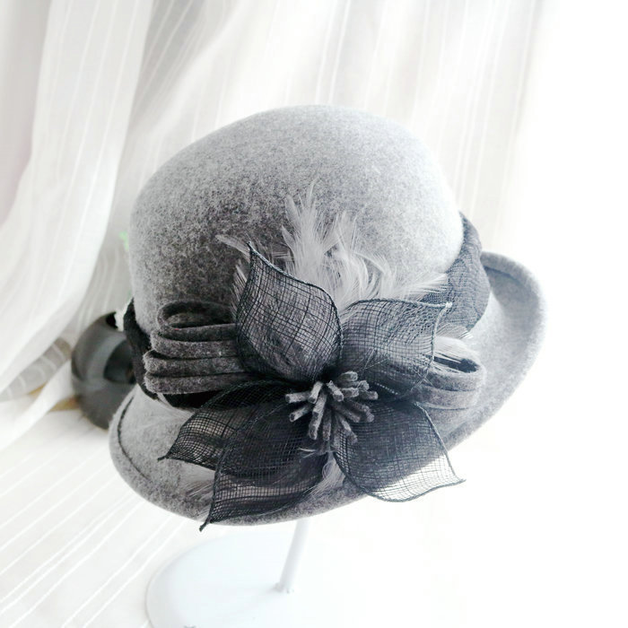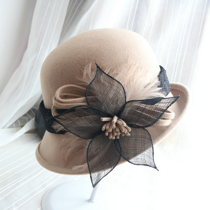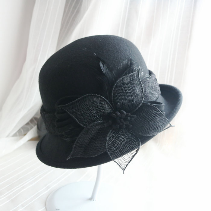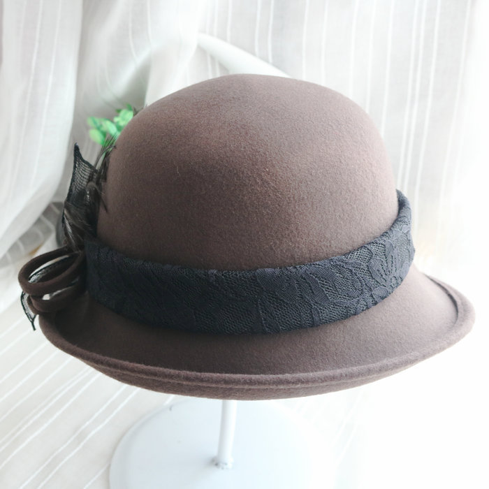 韩国秋冬新版羊毛呢礼帽麻纱羽毛花朵卷边盆帽女士优雅遮阳时装帽