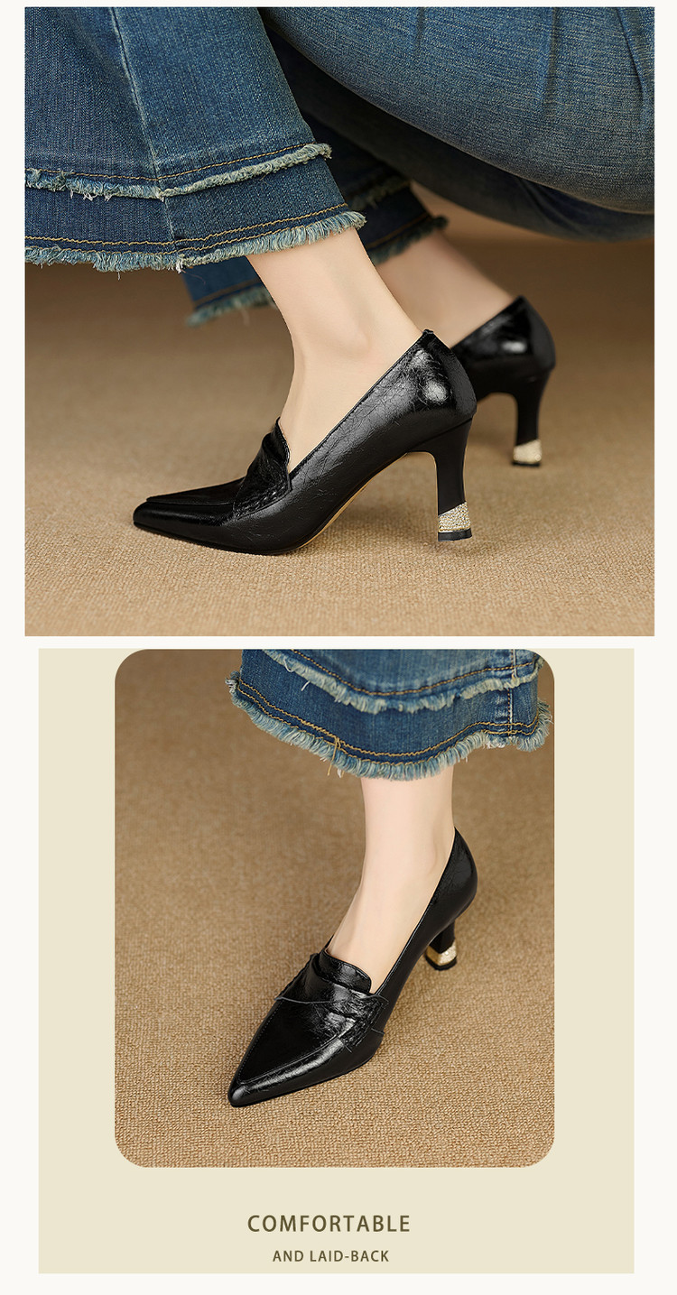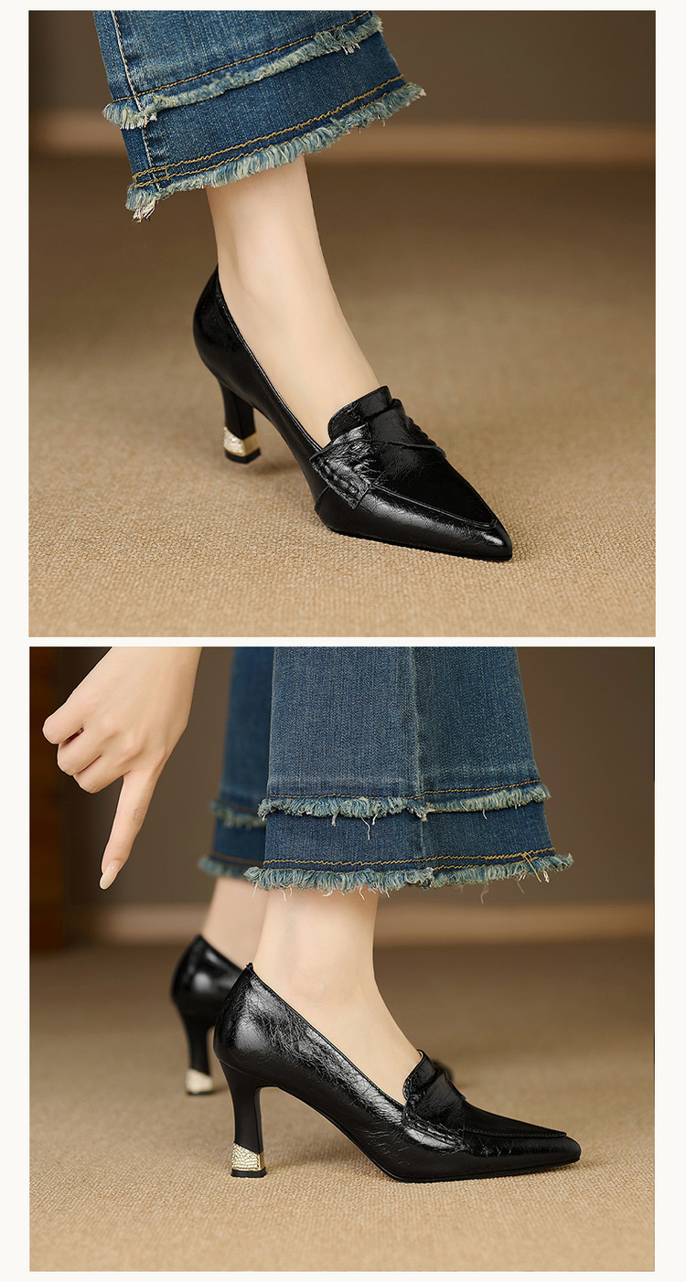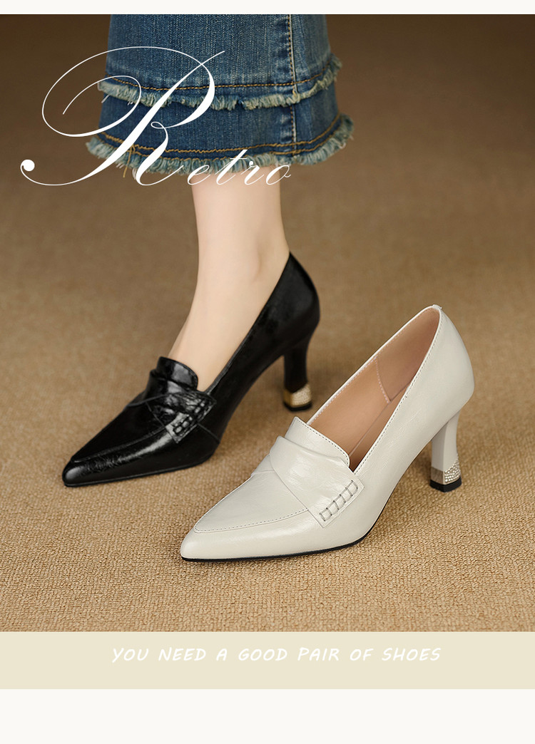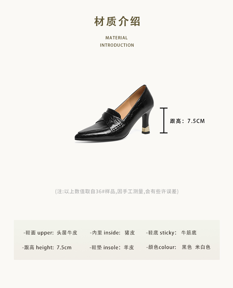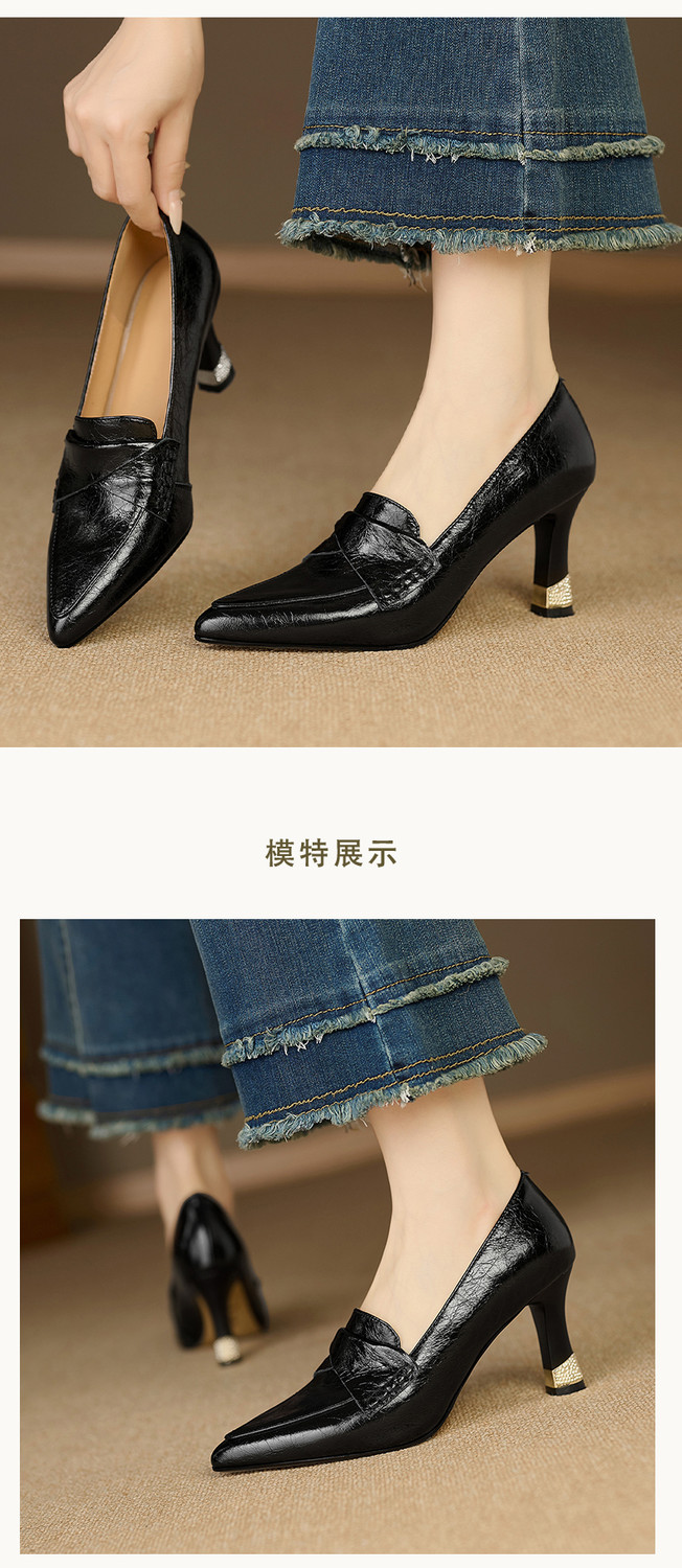 【预售5天】法式优雅气质尖头高跟鞋女春季小皮鞋新款浅口水钻粗跟单鞋RS&7077