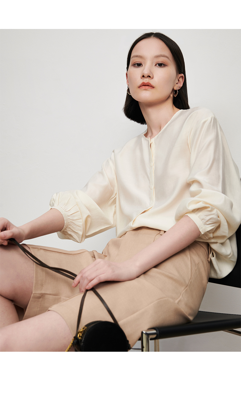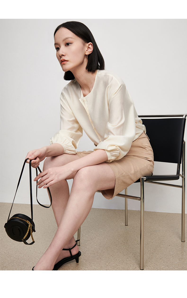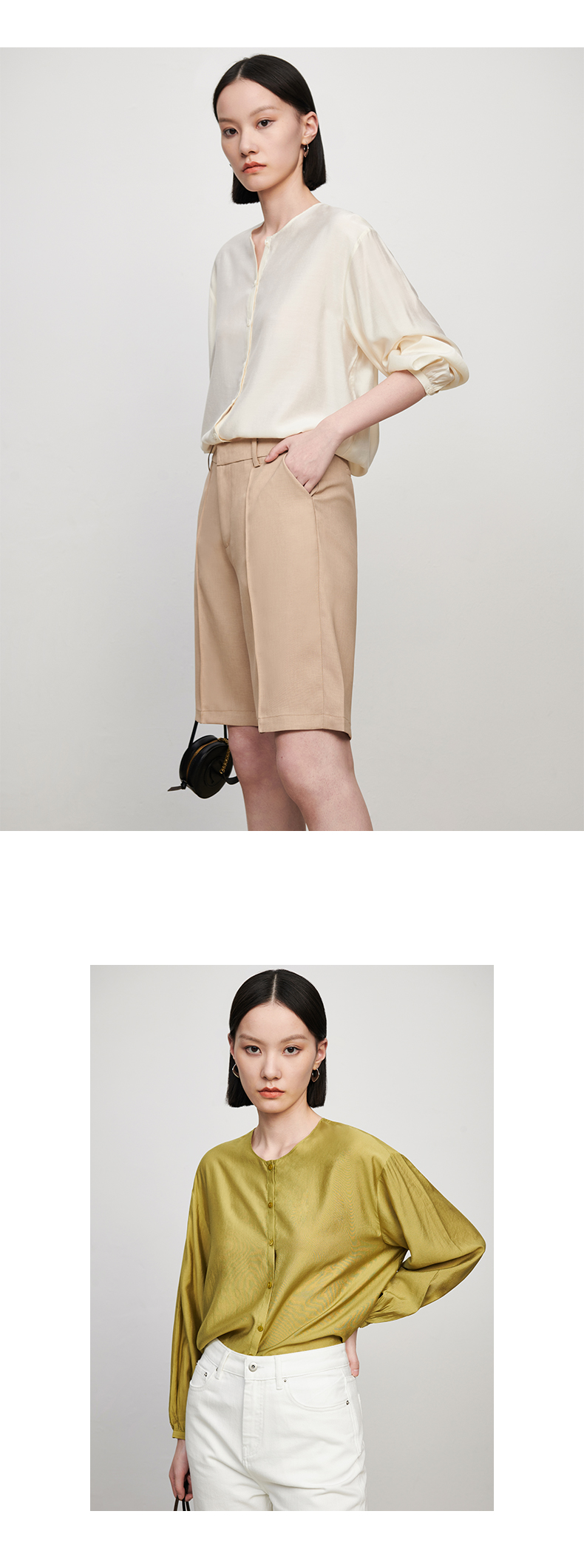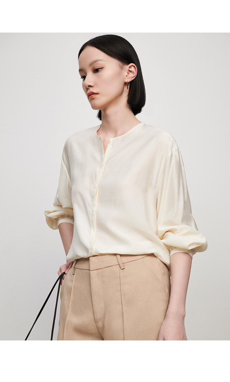 IN AND ON21289春季新款超柔丝棉圆领衬衫女超薄透气宽松上衣