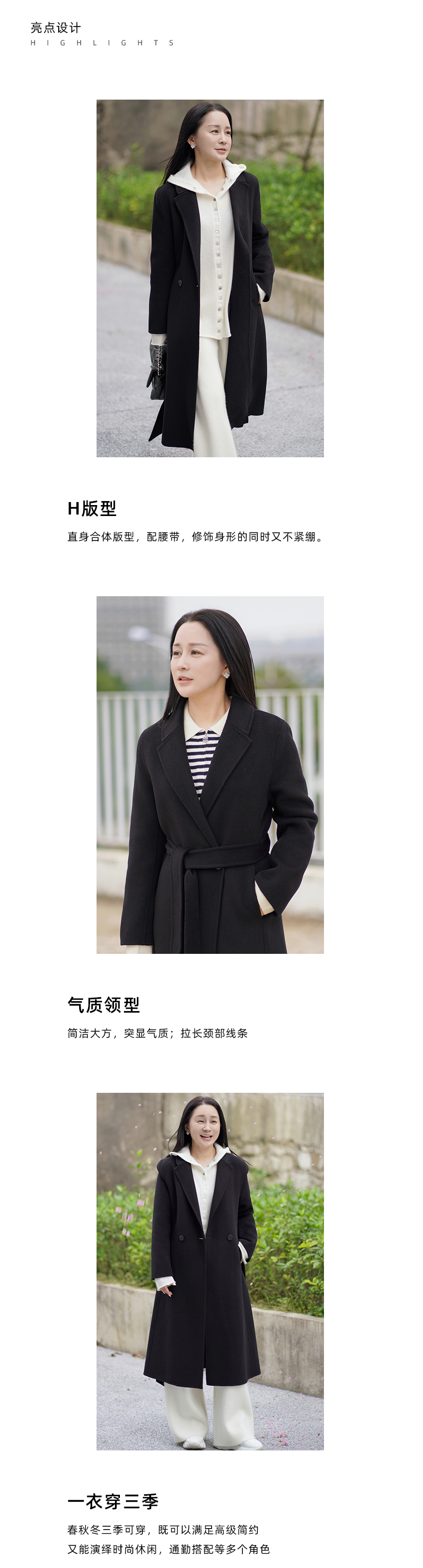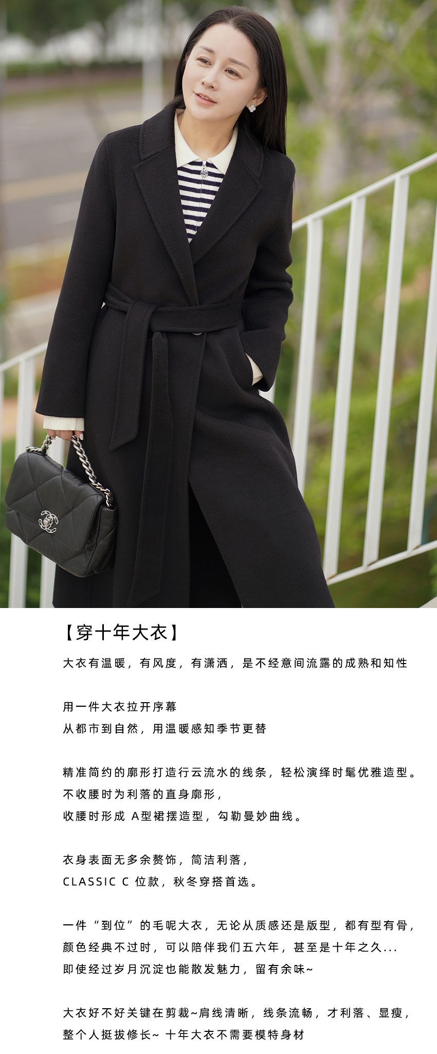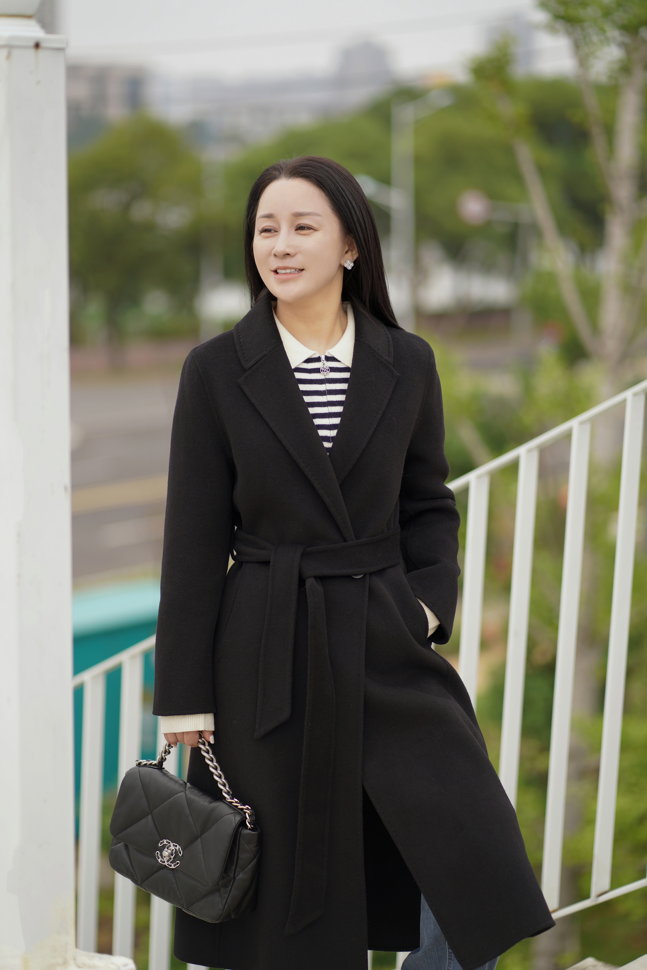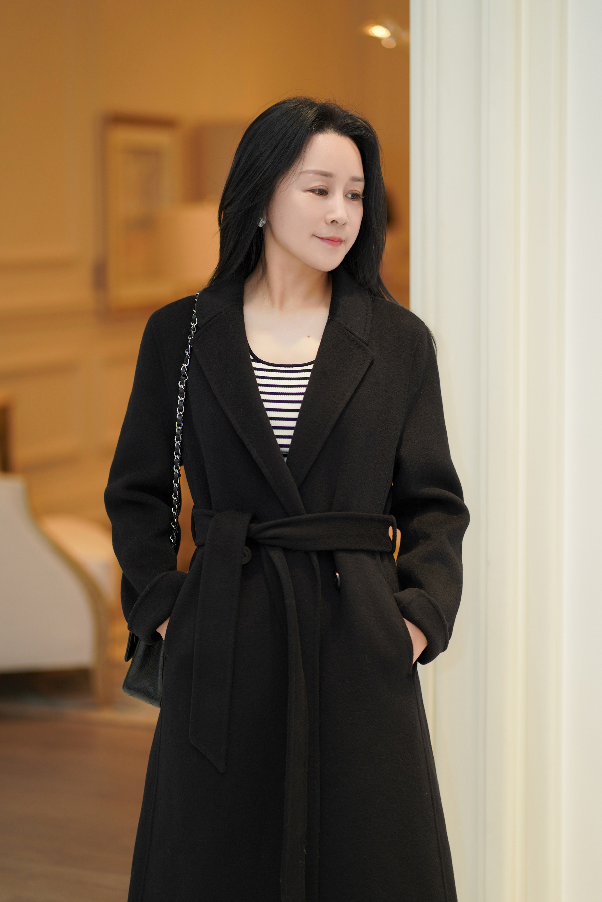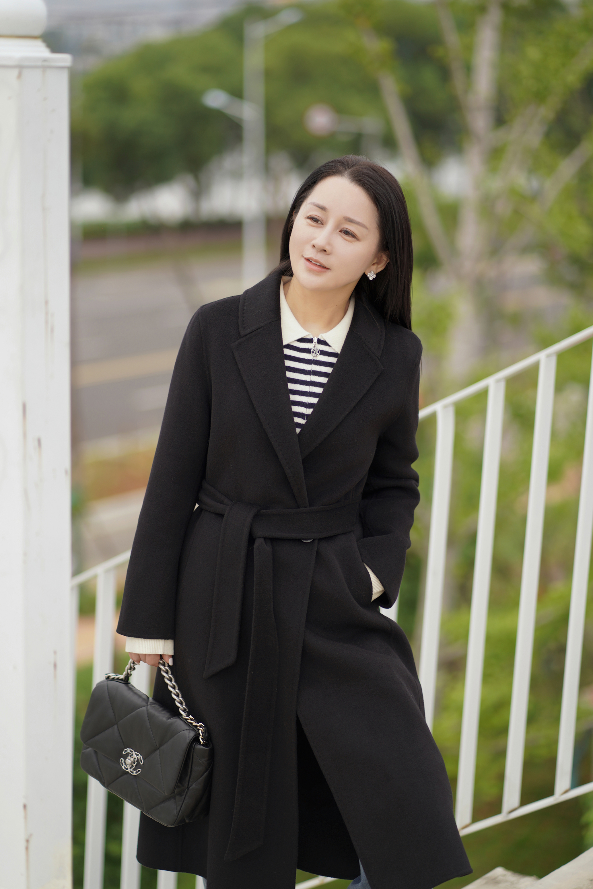 M1L1臣禾 气质黑毛呢大衣 系腰带【100%绵羊毛 】气质毛呢外套9234080380 现货
