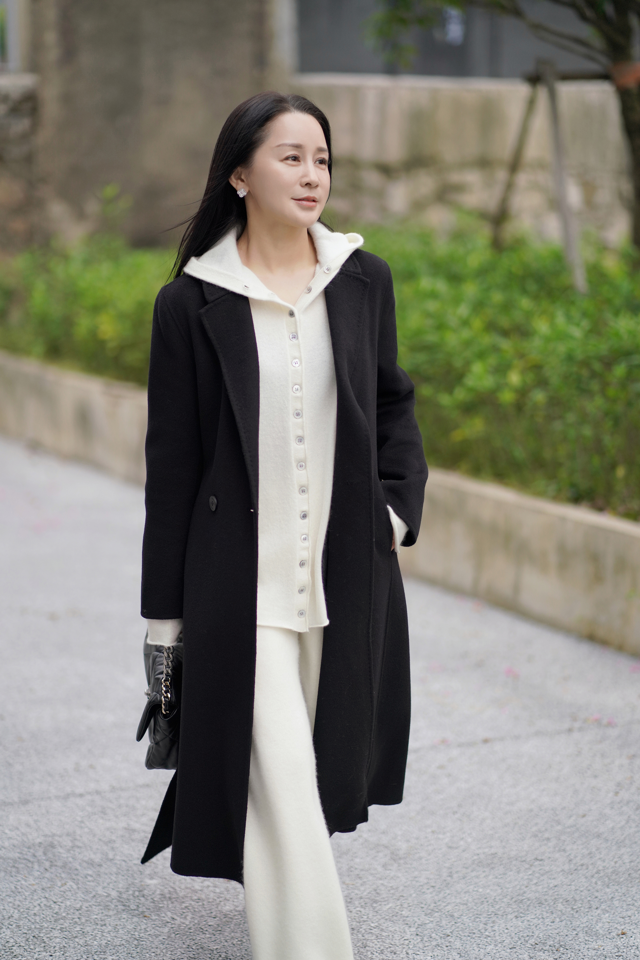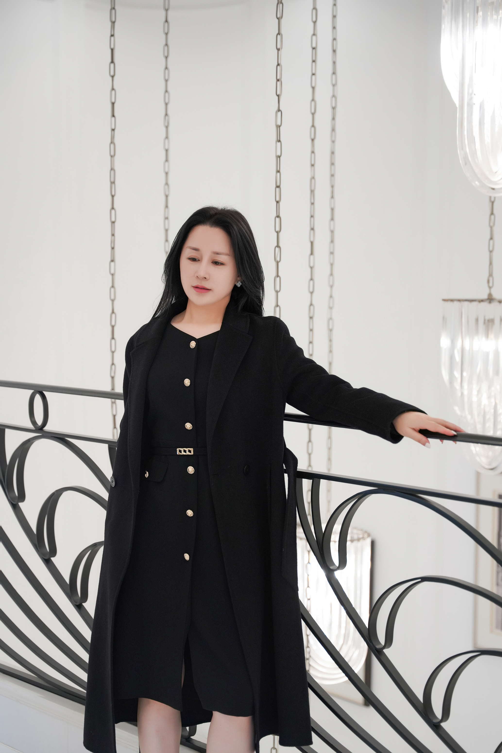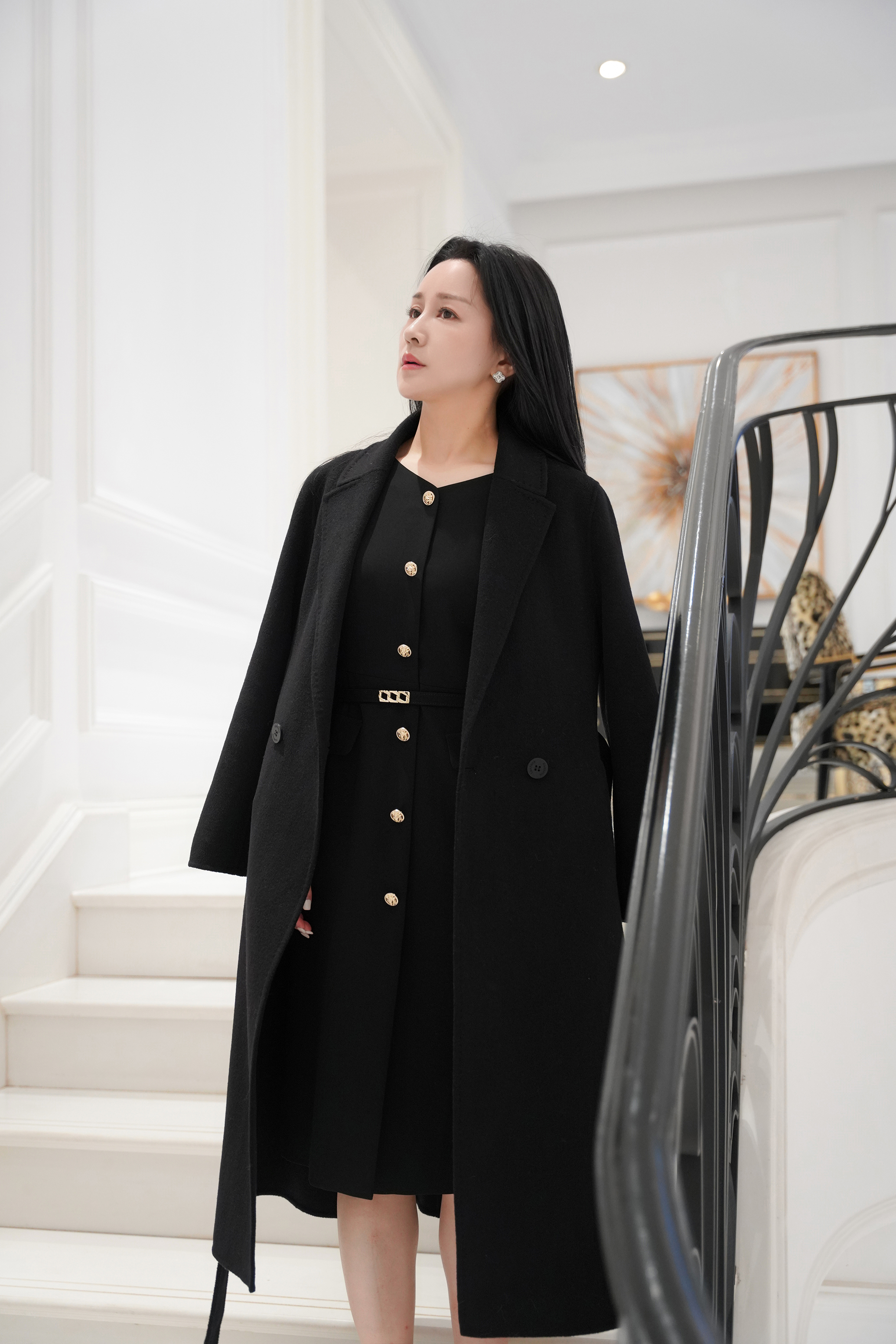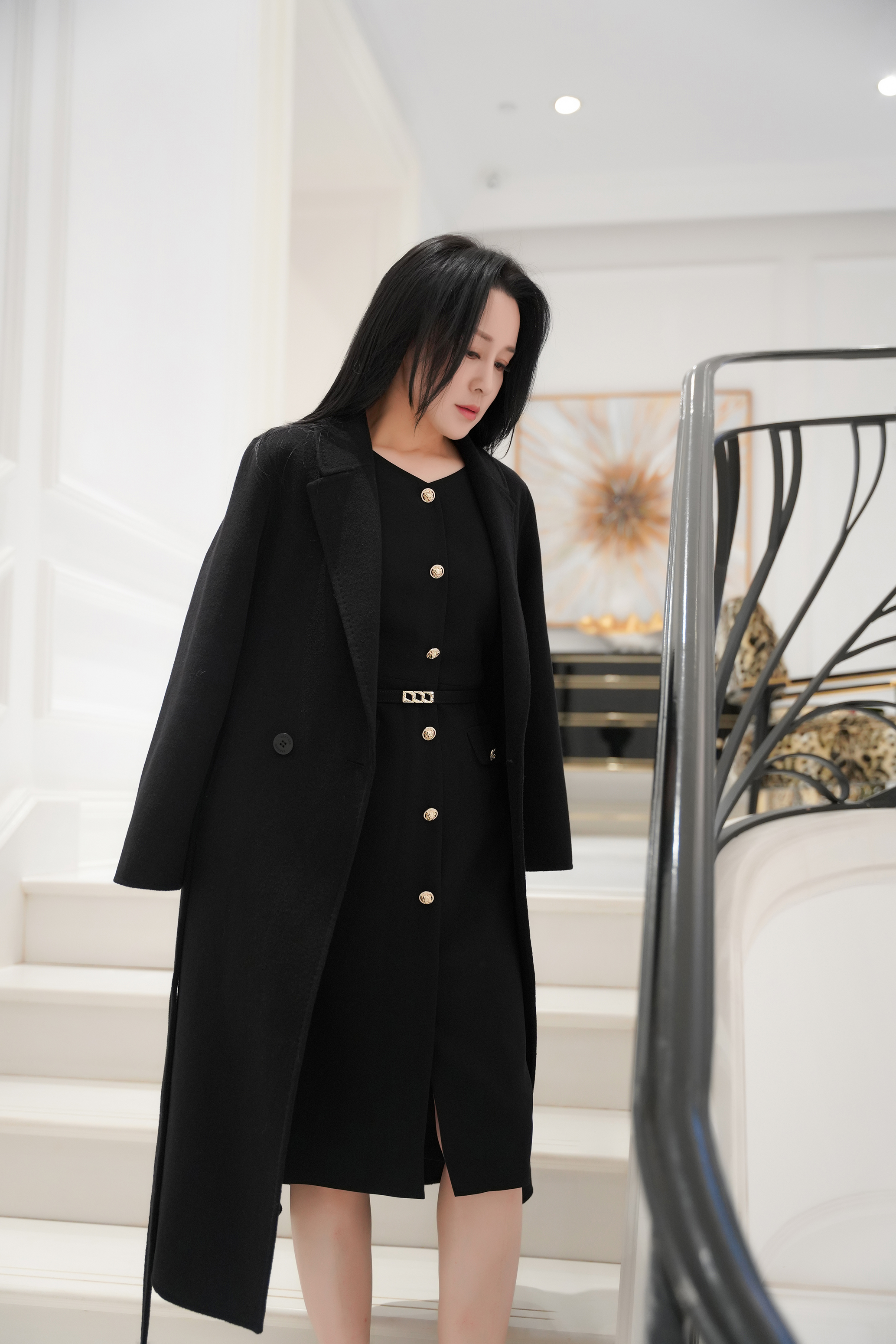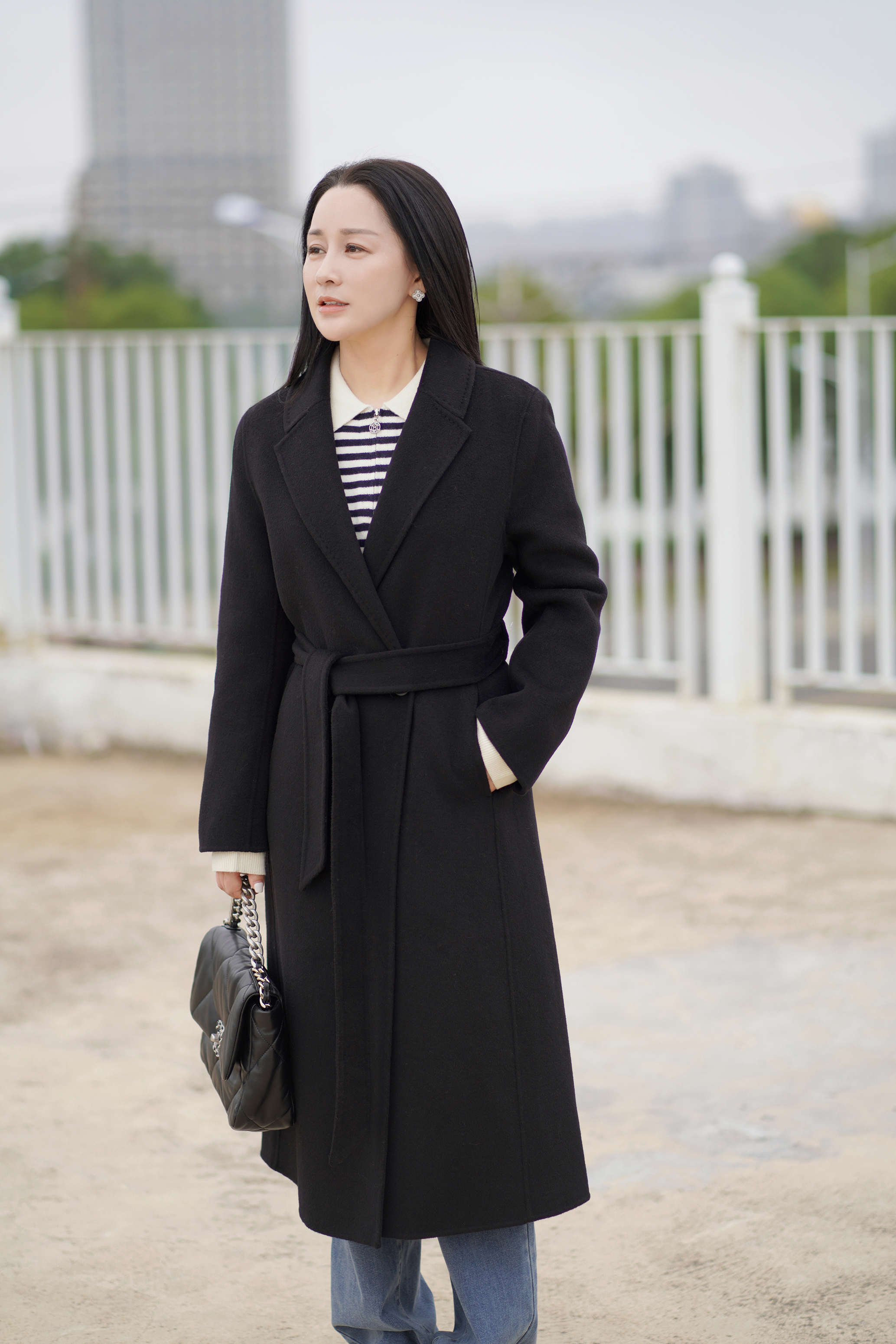 M1L1臣禾 气质黑毛呢大衣 系腰带【100%绵羊毛 】气质毛呢外套9234080380 现货