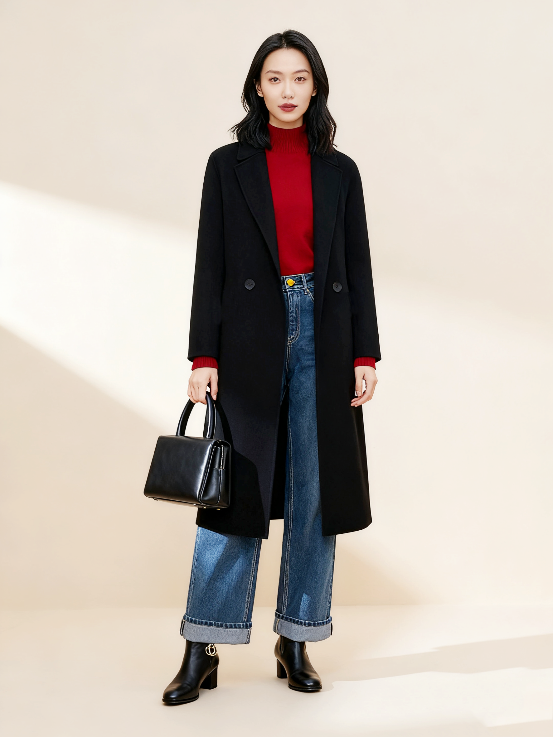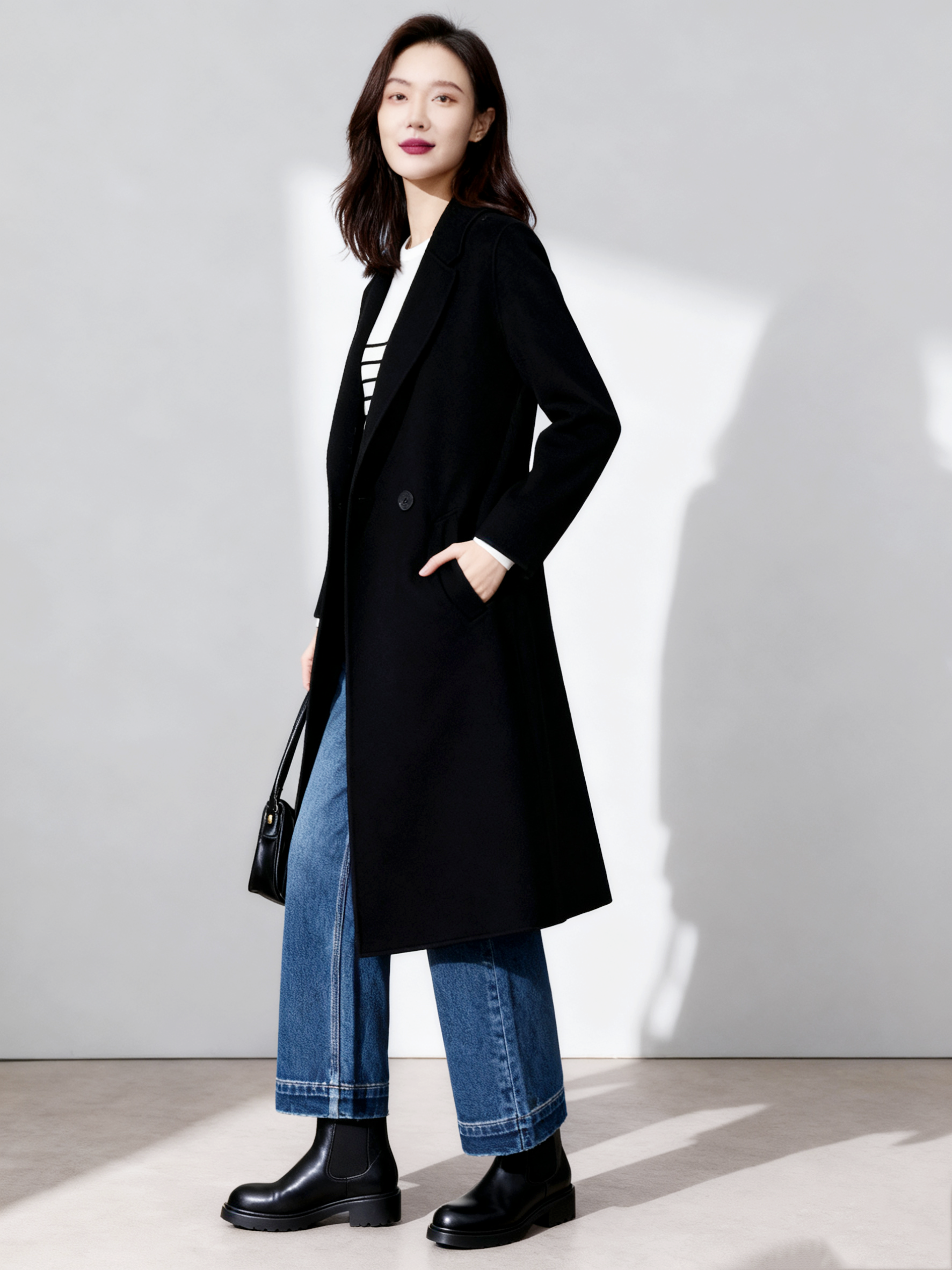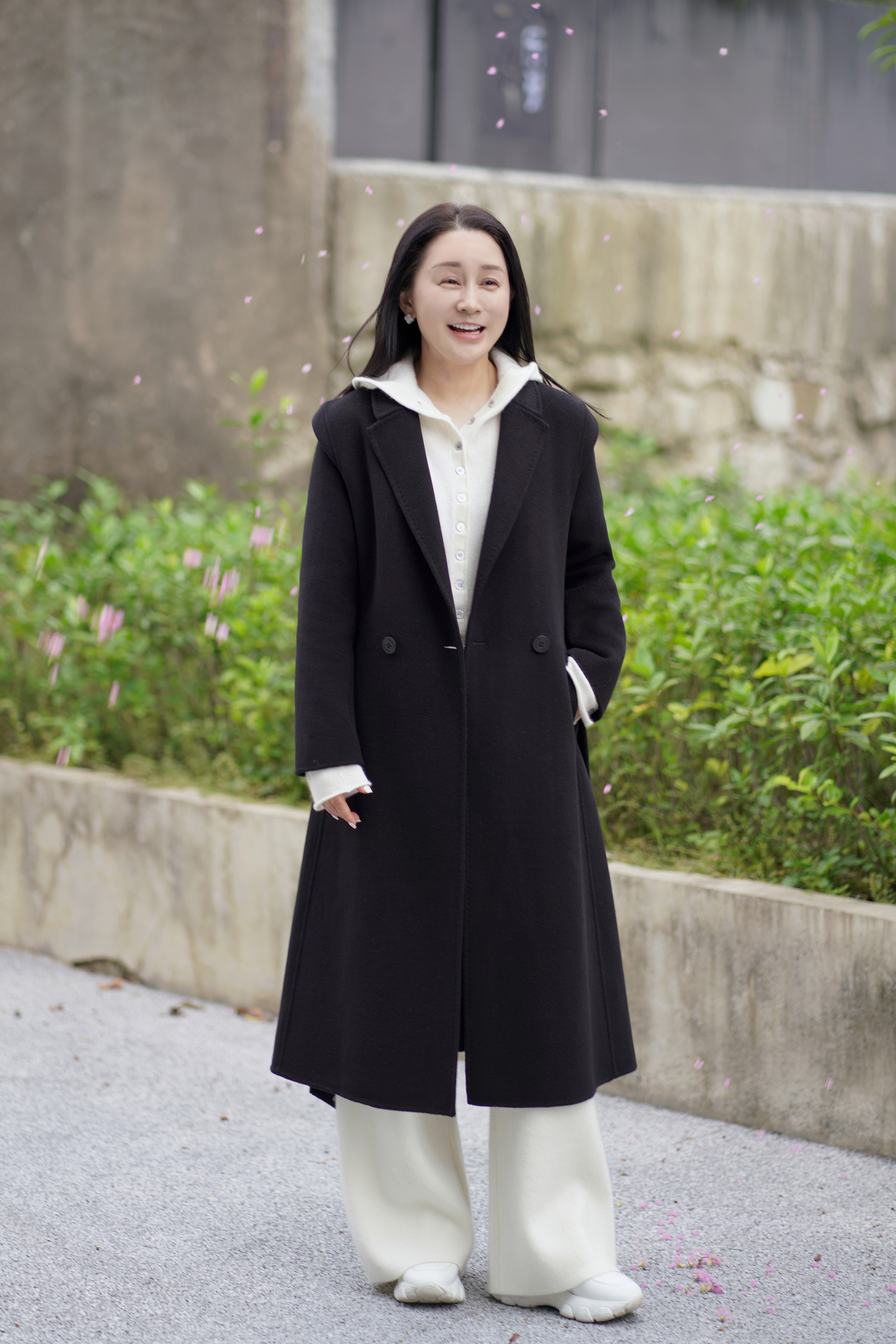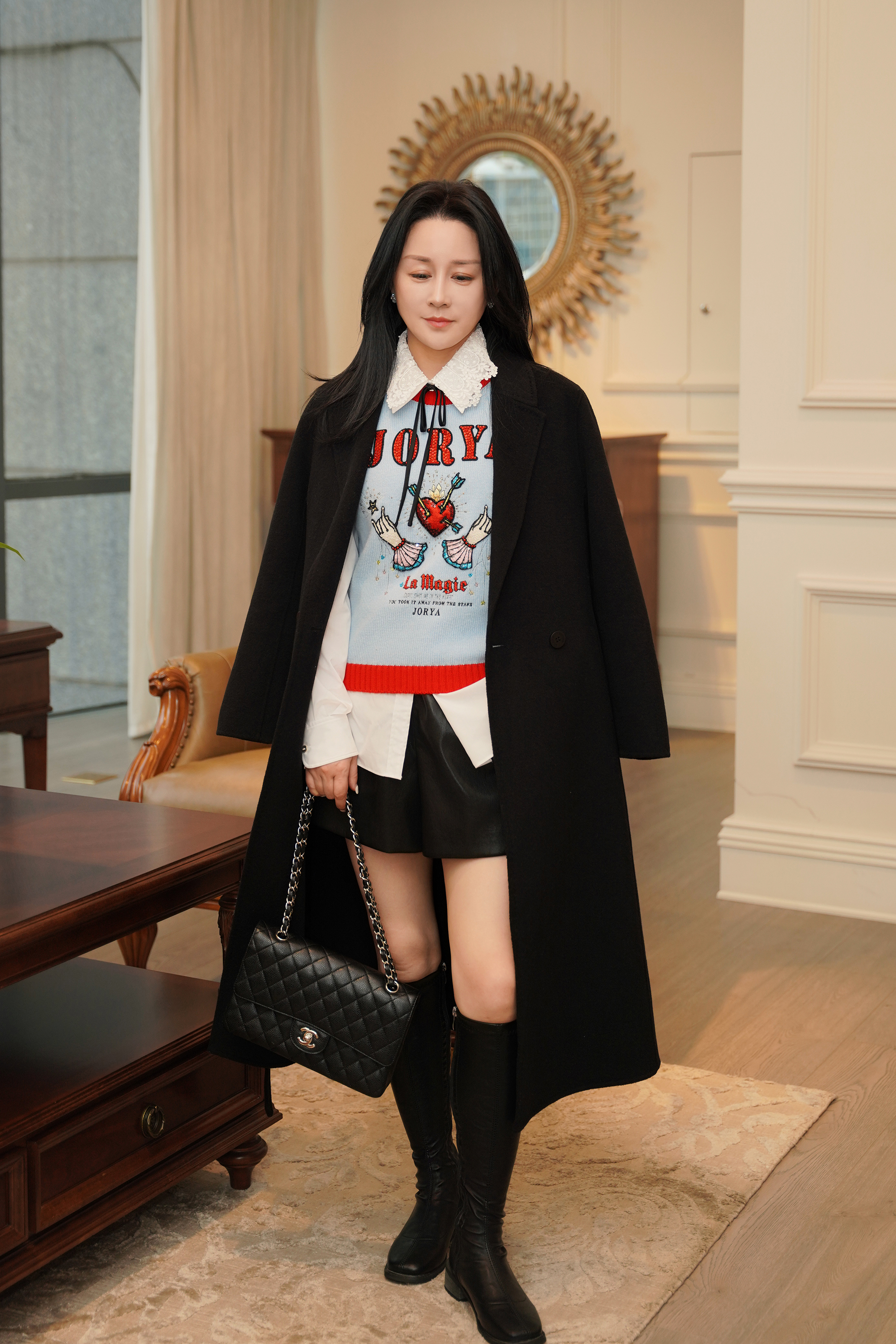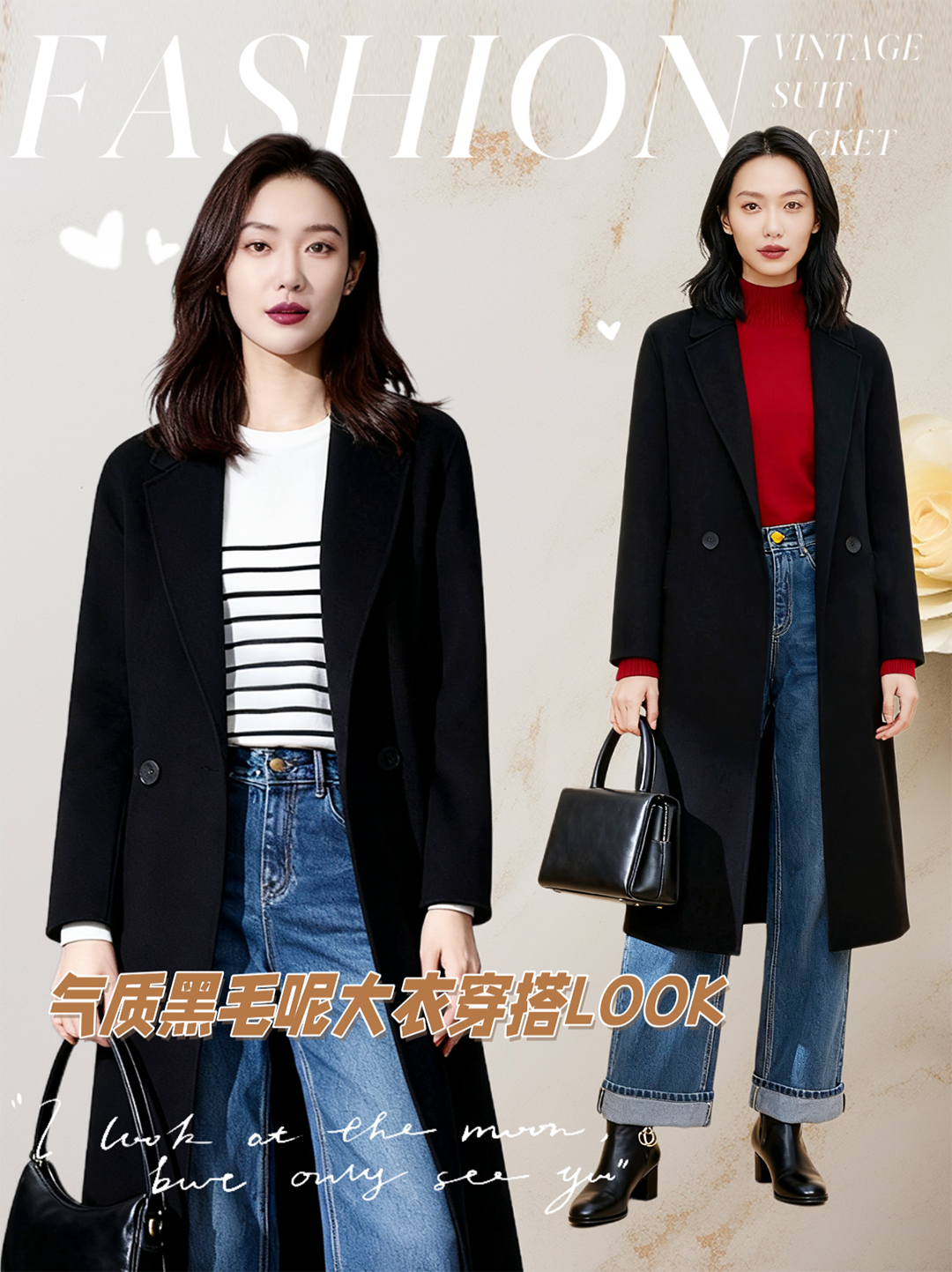 M1L1臣禾 气质黑毛呢大衣 系腰带【100%绵羊毛 】气质毛呢外套9234080380 现货