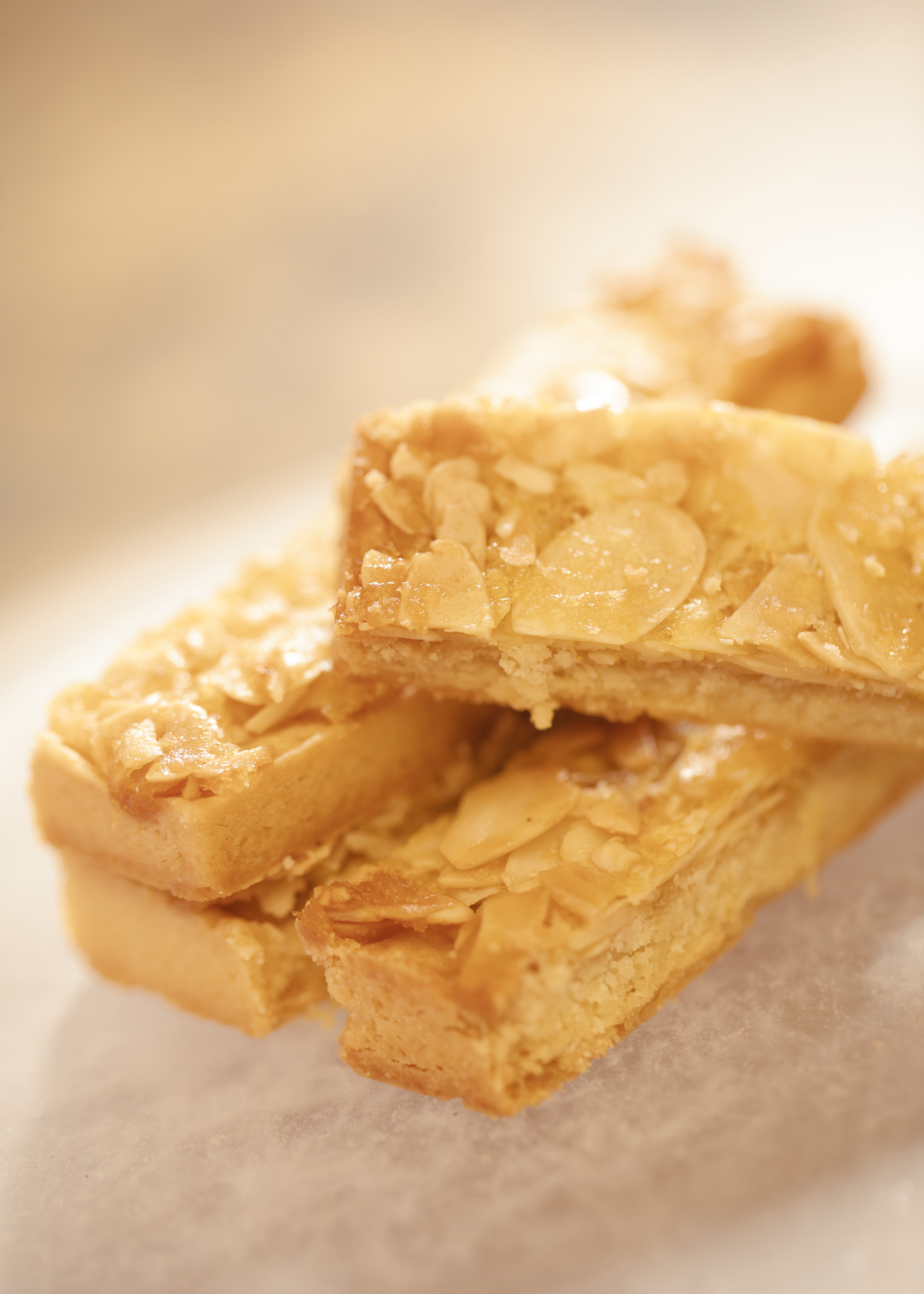 表面布满厚厚的一层杏仁片,保证每一口都能吃到满足。“橙”的使用更是点睛之笔,酸甜适度的橙味融入,让这道一向以“酥脆”悦人的点心的口感和层次提升,平均每一盒饼要耗费 2 只橙子、1 只柠檬。