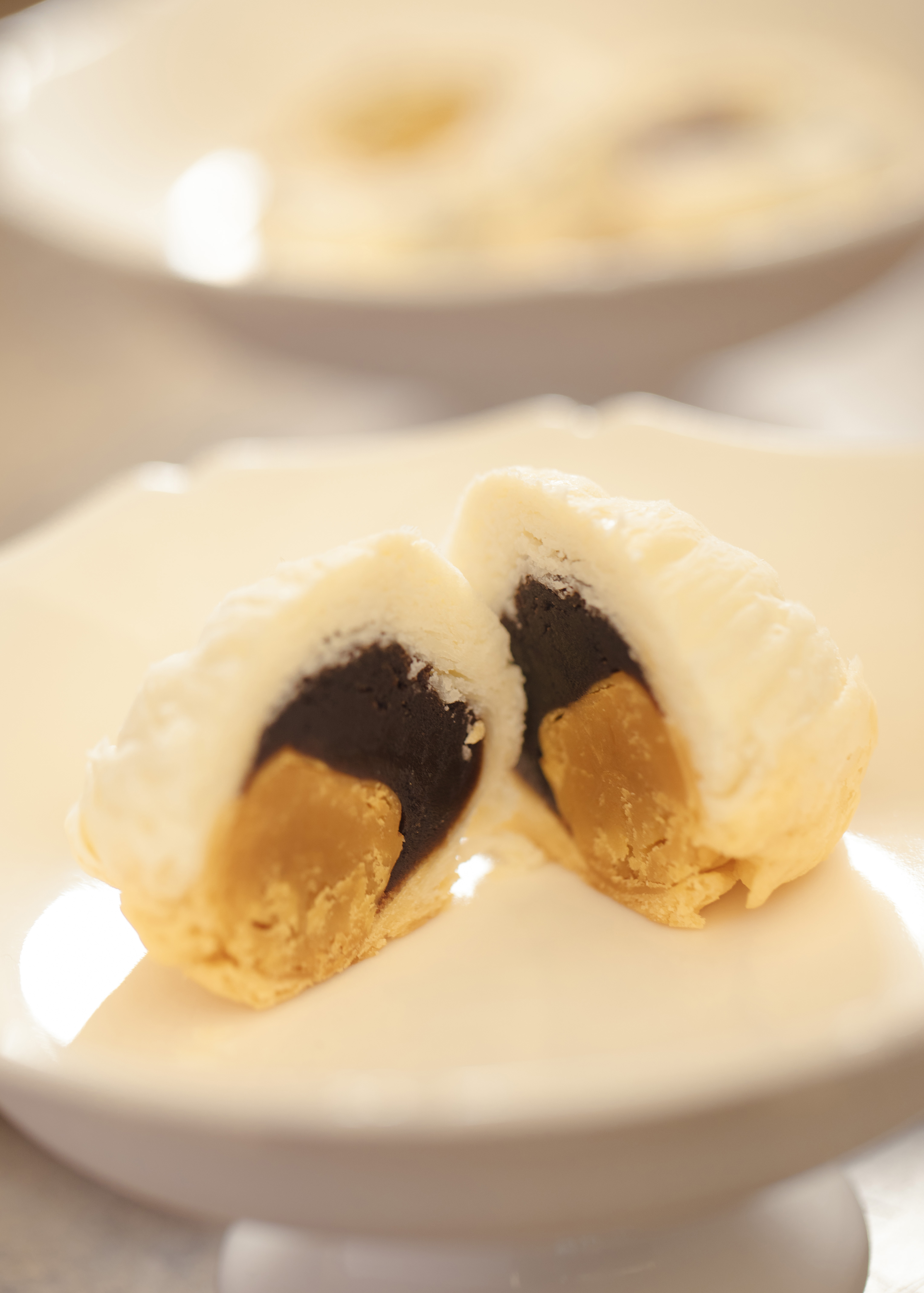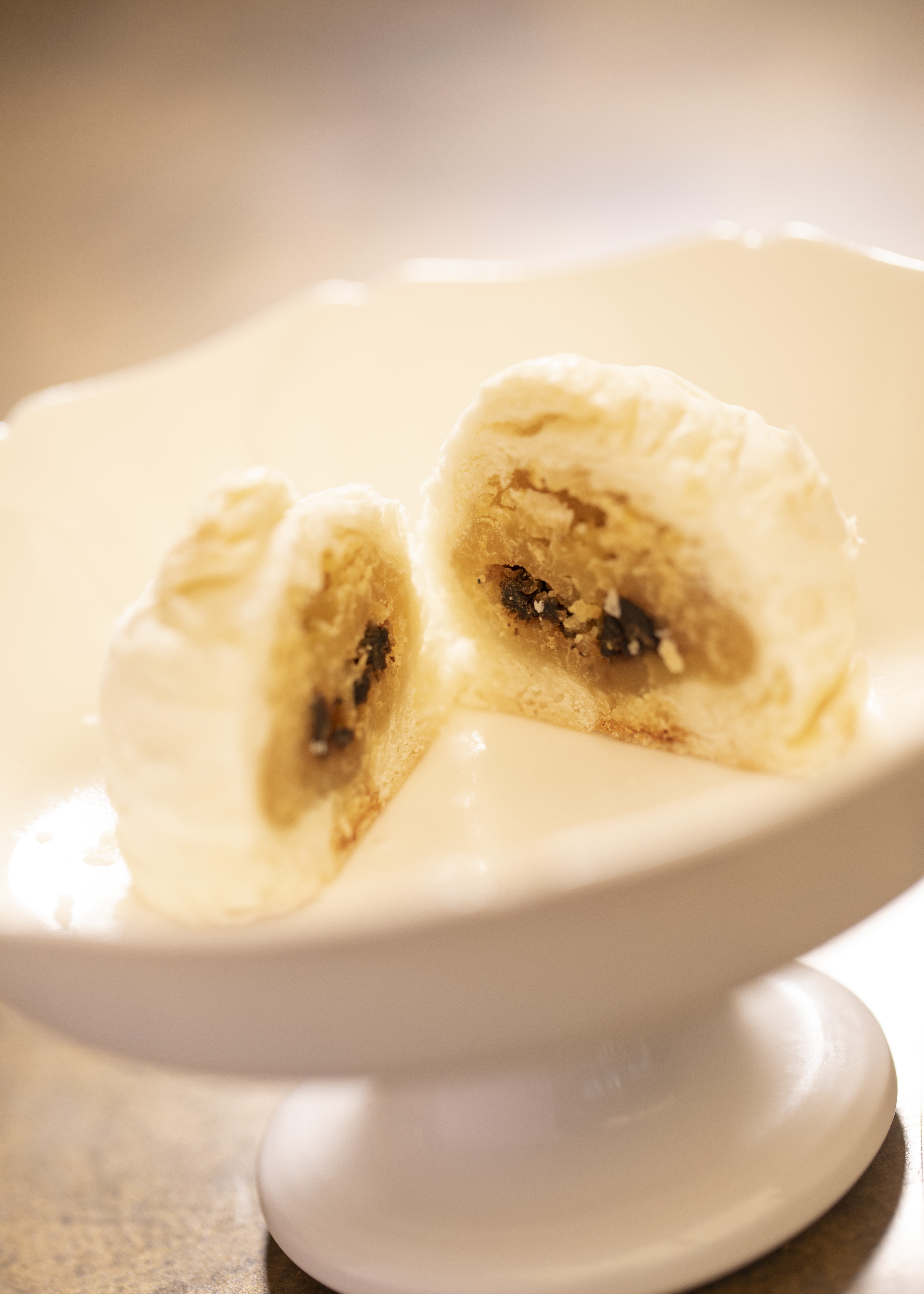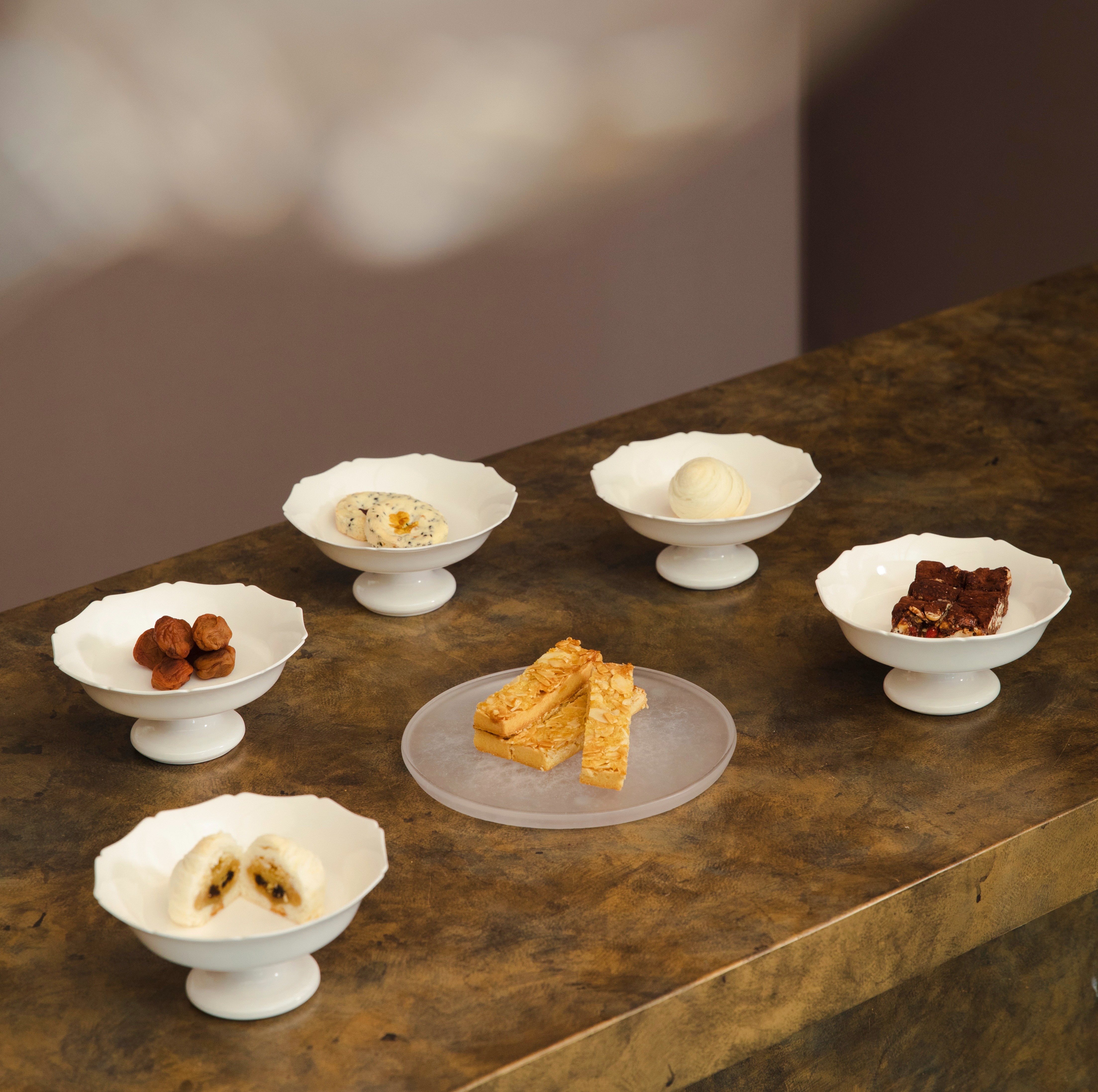 「遇·楼春」中的绿豆老香黄饼,毫不吝啬地加入被誉为“潮汕三宝之一”、瓮藏陈放近20年的老香黄,滋味醇厚高级,酸甜生津,略带俏皮的清凉感,类似于老物件的陈韵。与绿豆泥拌和,轻盈淡雅,又增加风味层次。
