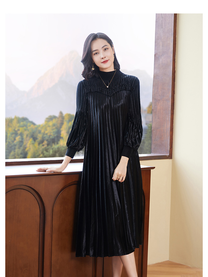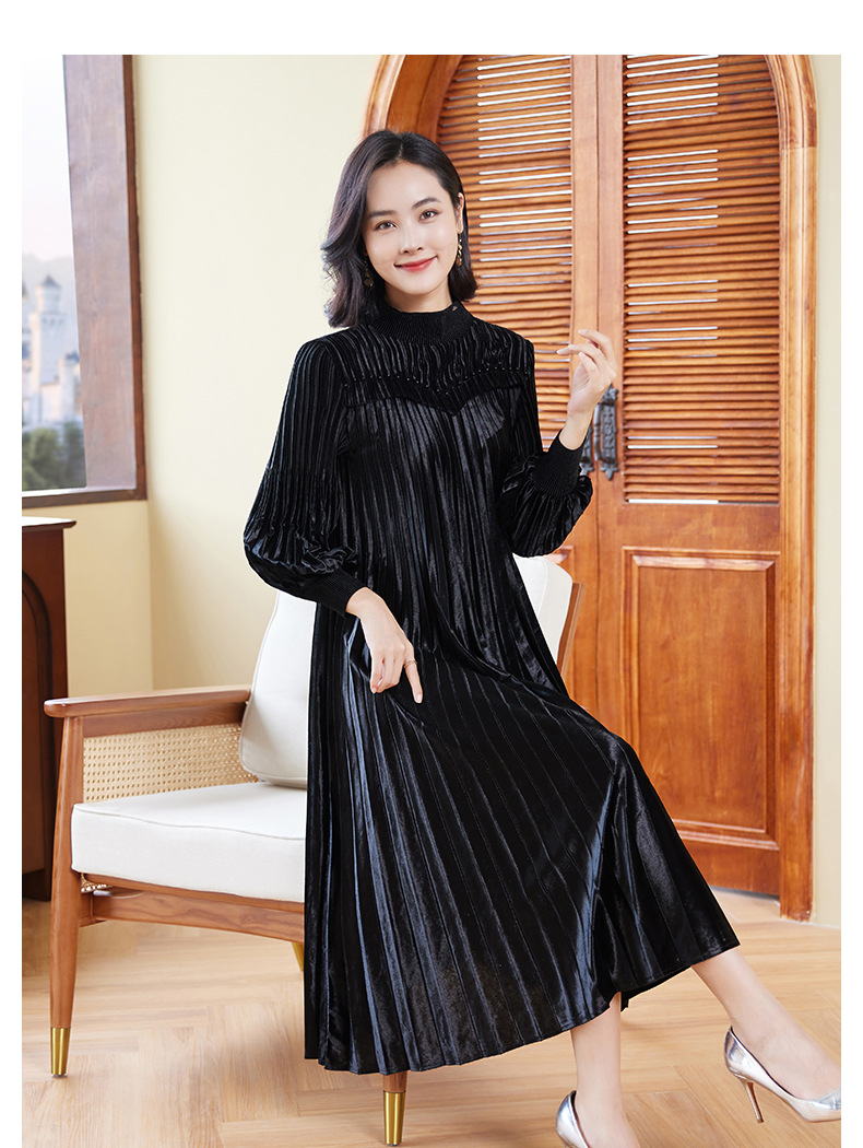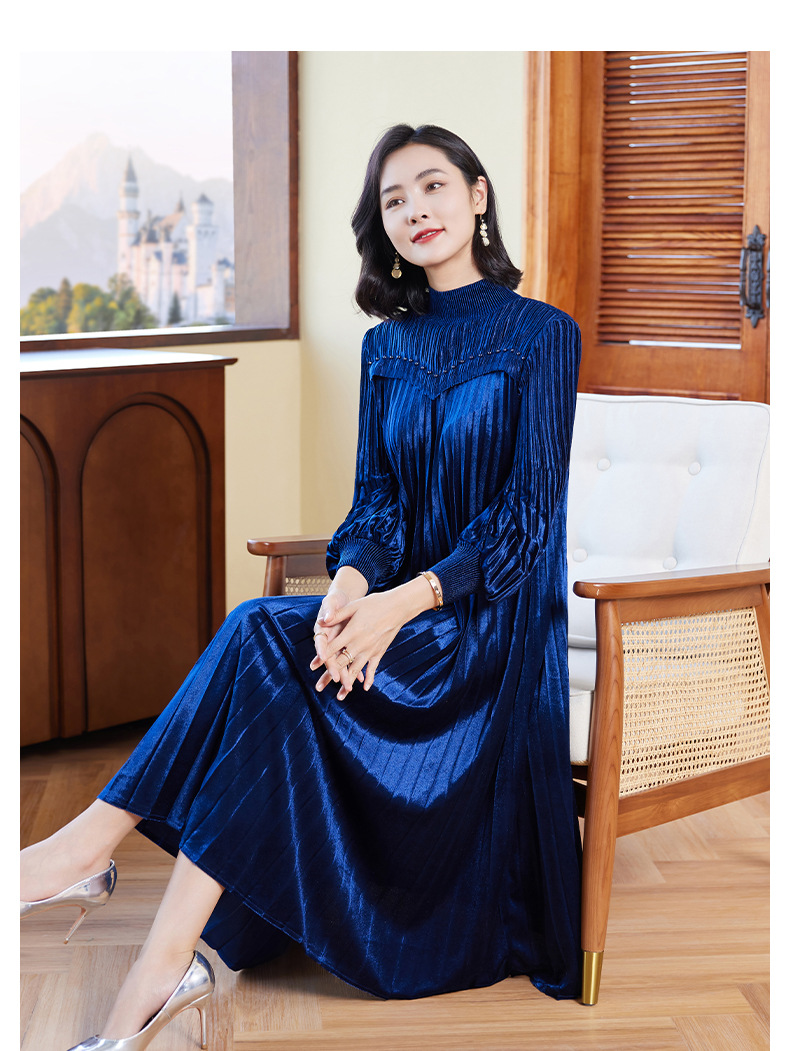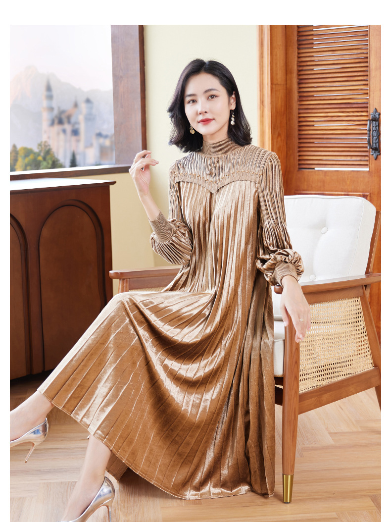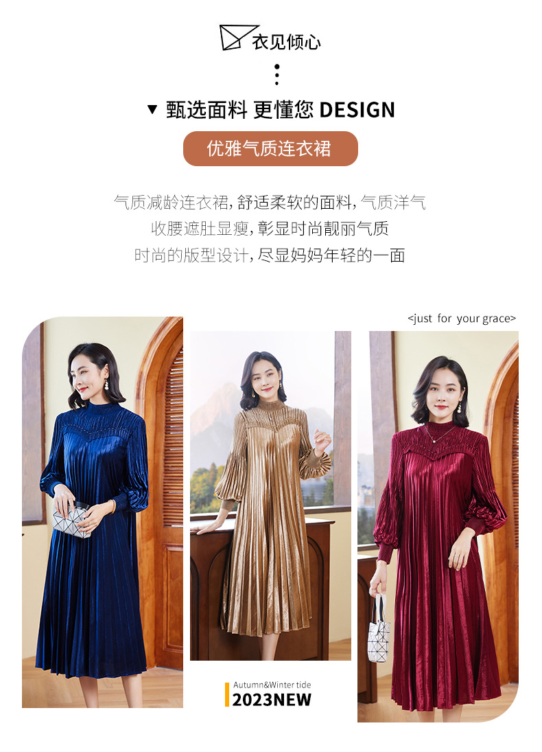 XSLS3346高端丝绒连衣裙妈妈秋冬装长袖新款百褶长裙胖mm大码女装婚宴礼服