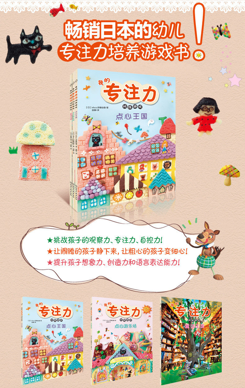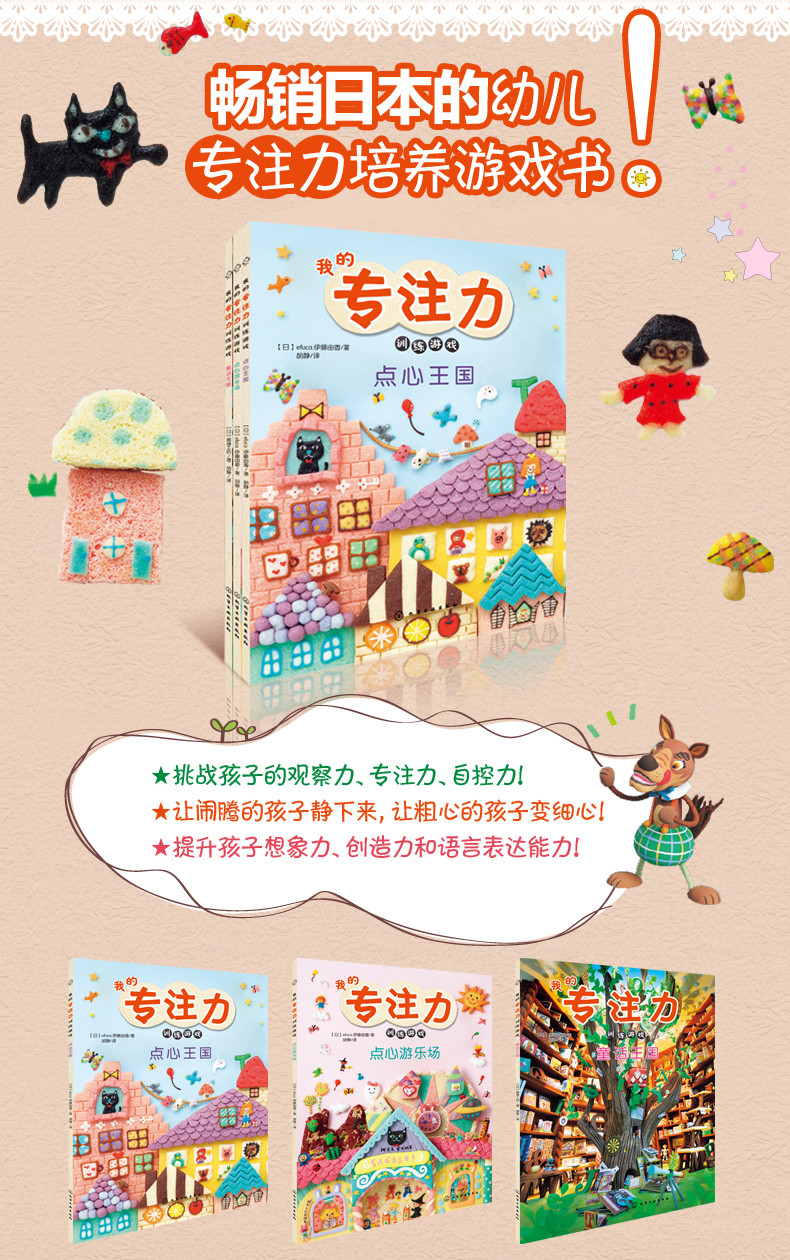 1.这是一套畅销日本的幼儿专注力培养游戏书,每个游戏只需5分钟左右的时间,让孩子在轻松好玩的游戏中提升专注力。