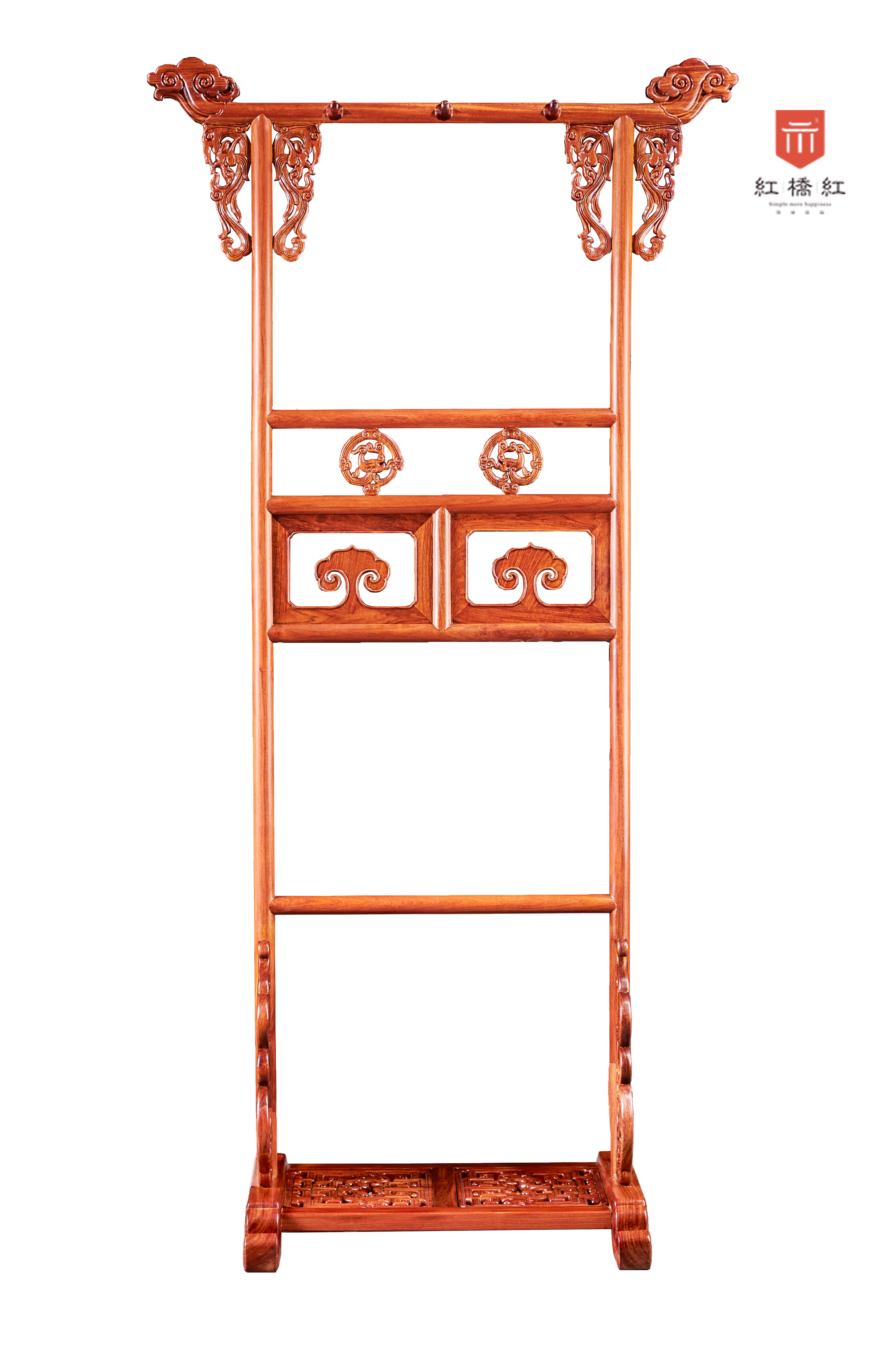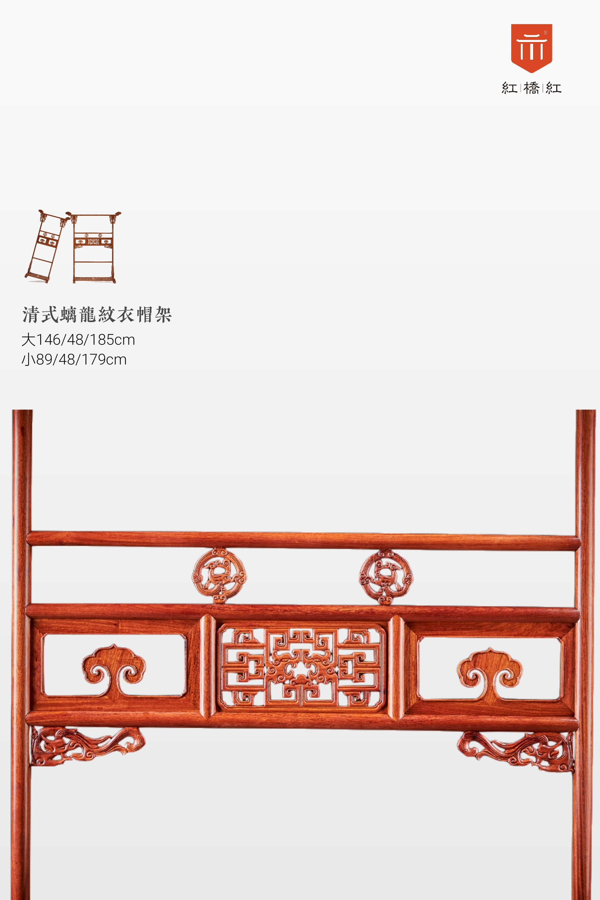 这款清式螭龙衣架,如意云纹至顶部两侧飞天而起,吉祥之意升腾,中牌子镂雕见光,与之呼应,繁中忽简,精美绝伦,各处牙板、卡子等纹饰,均取螭龙纹样,整体装饰统一,威而不严,庄而不重,琳琅相协,墩座厚实稳重,鞋置处加饰回纹,富贵不断,是雕花衣架是代表作品,唯加挂钩以适当代需求。