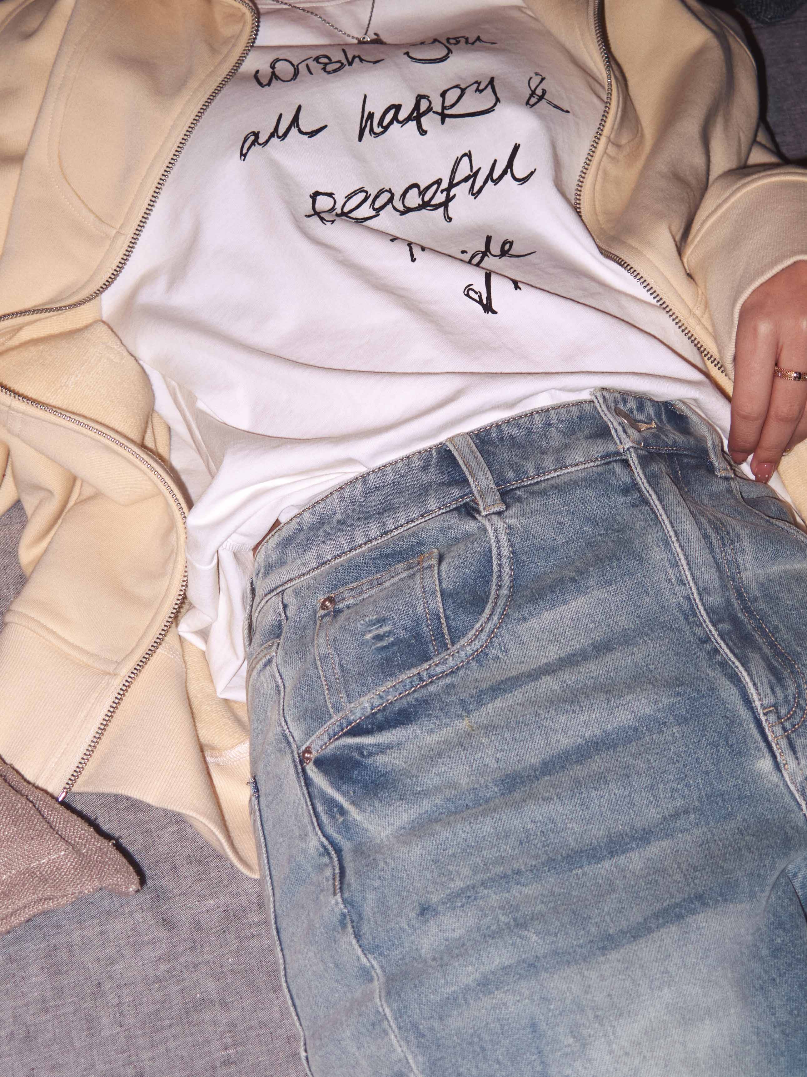 胸前字母印花(意在祝大家幸福安康)、侧边小细节标,打破单调沉闷感。