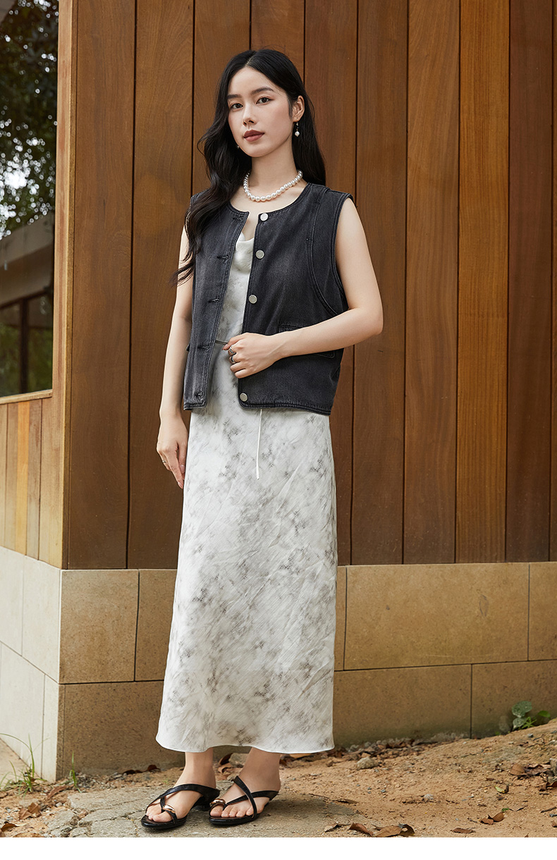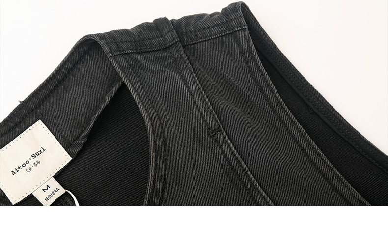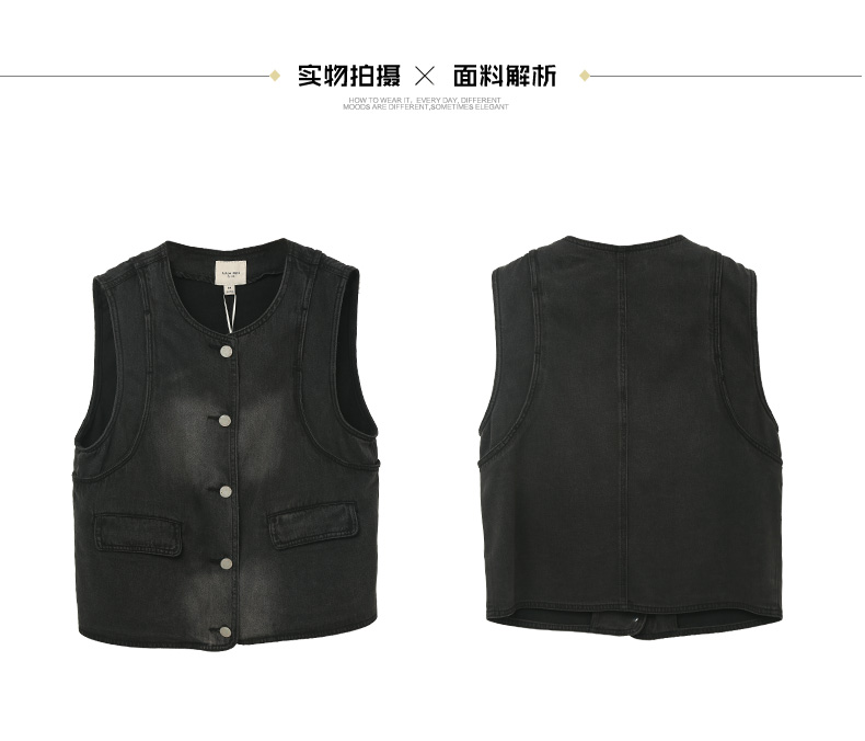 黑灰做旧牛仔马甲女 圆领无袖单排扣背心 复古宽松叠穿外搭坎肩