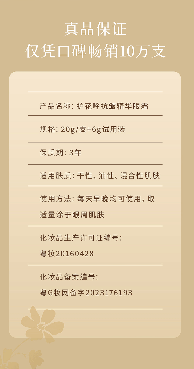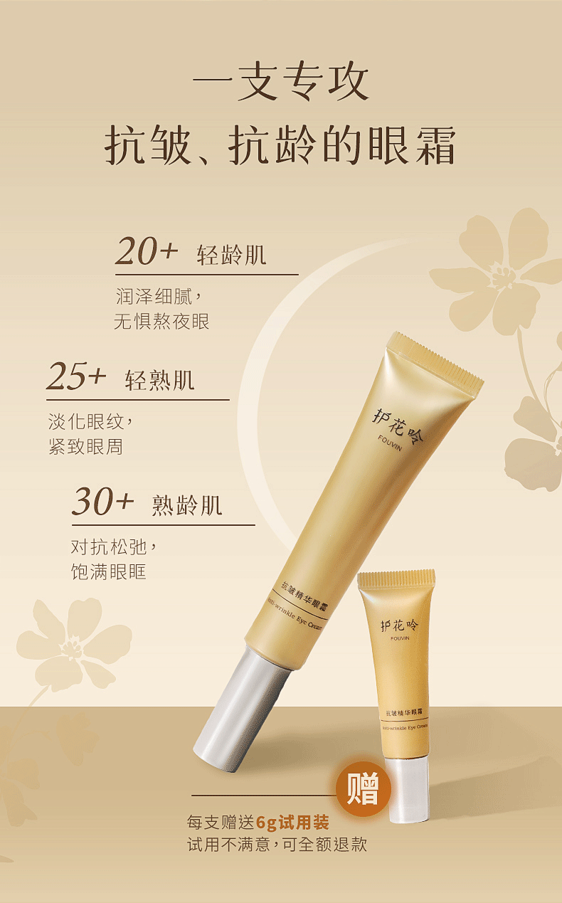 温馨提示:护花呤眼霜赠送6g试用装;试用装使用不满意,正装塑封未拆,支持7天无理由退货;非质量问题退货运费客户自理。
