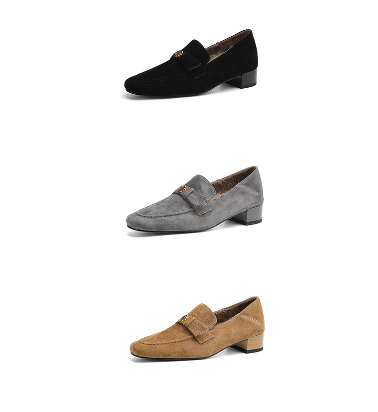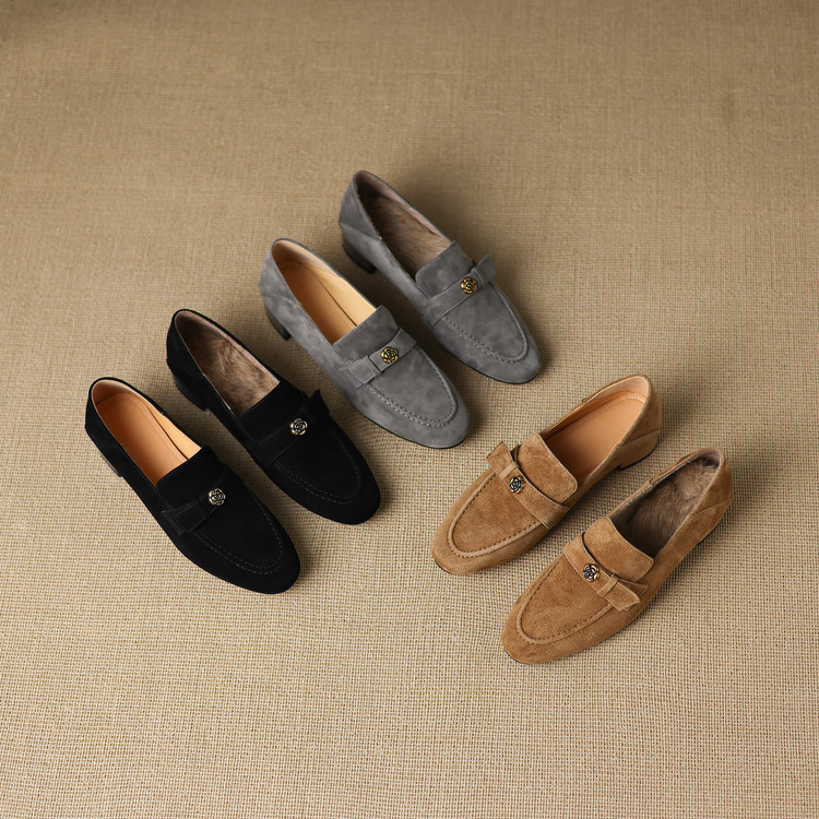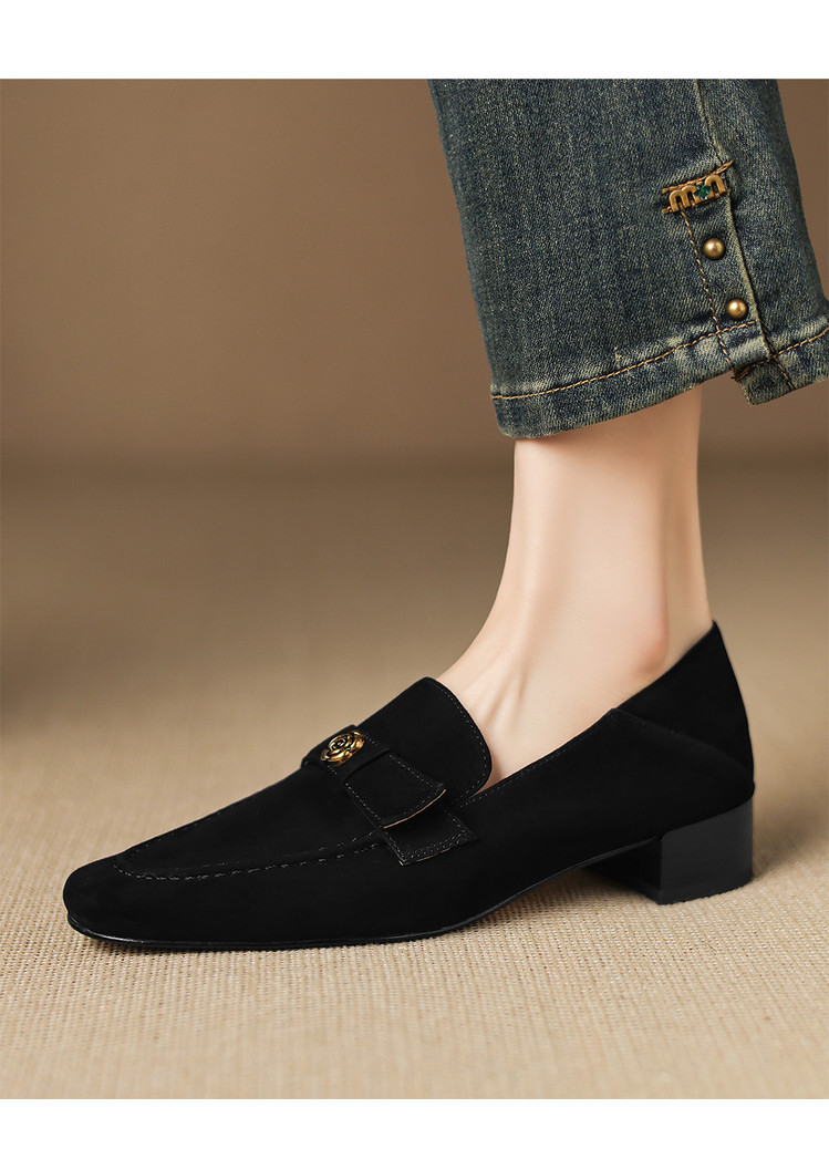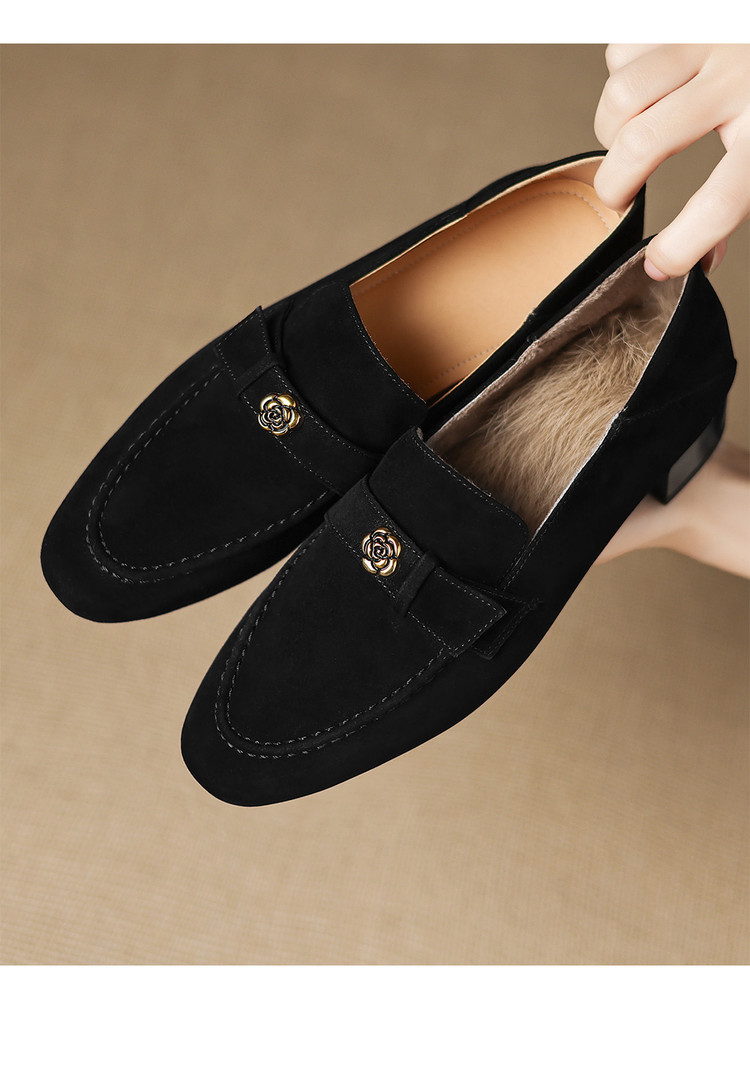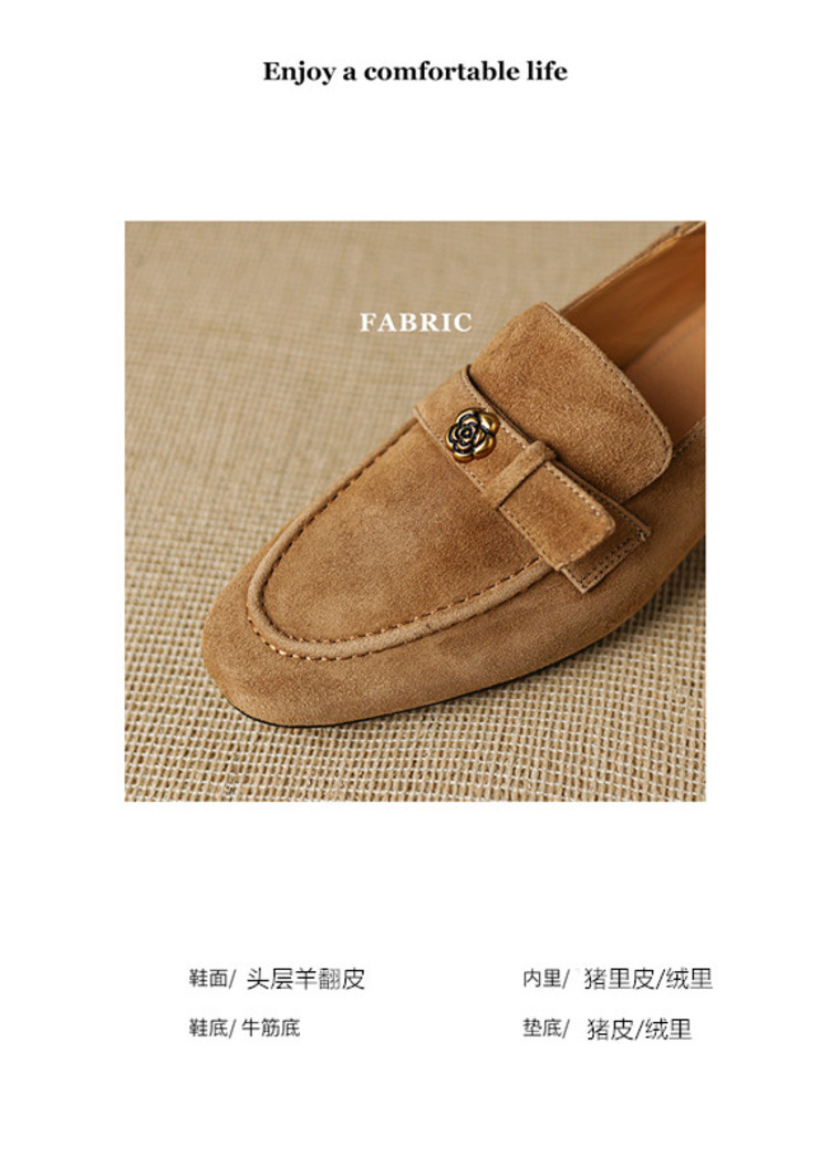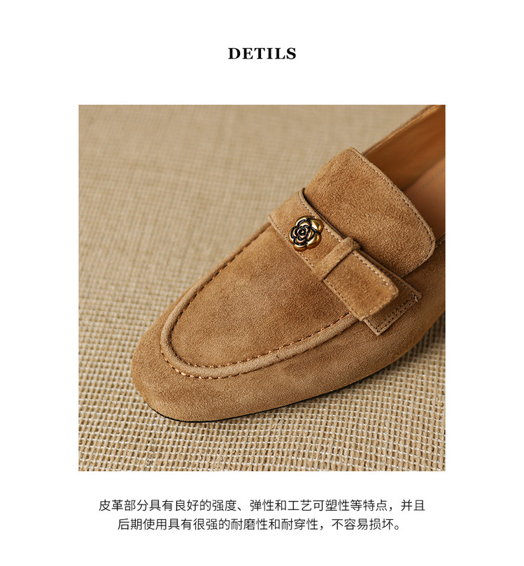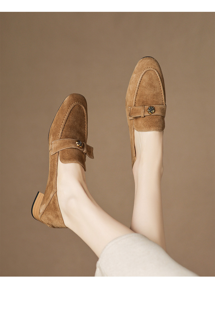 【预售5天】羊皮版~复古法式美拉德山茶花乐福鞋女一脚蹬粗跟浅口单鞋小皮鞋NGMZR&72-237