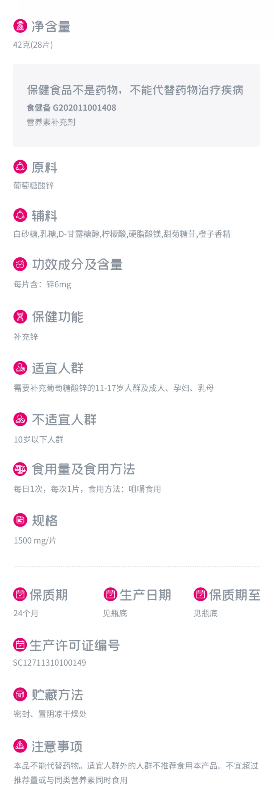 葆婴葡萄糖酸锌咀嚼片42g(28片)