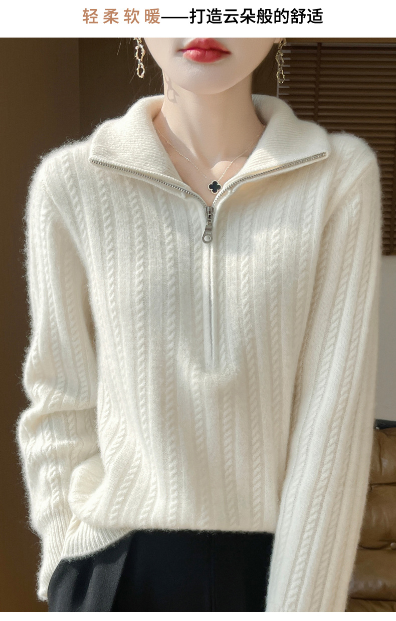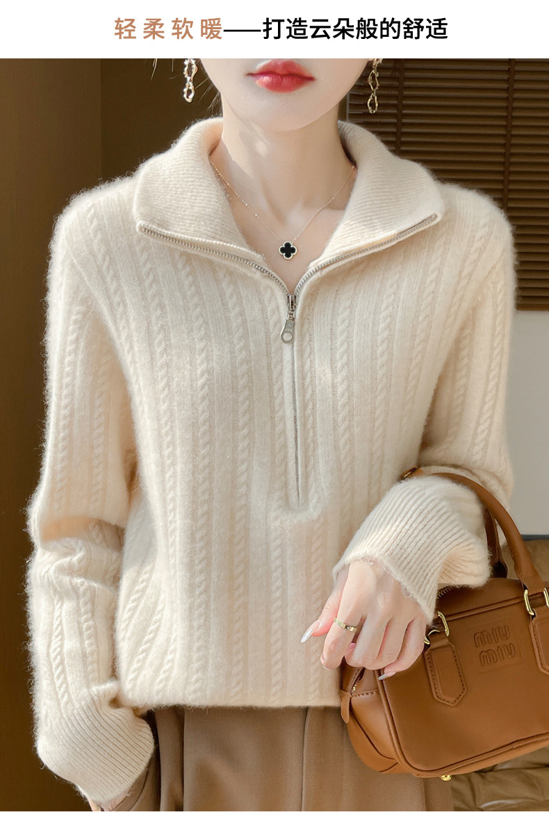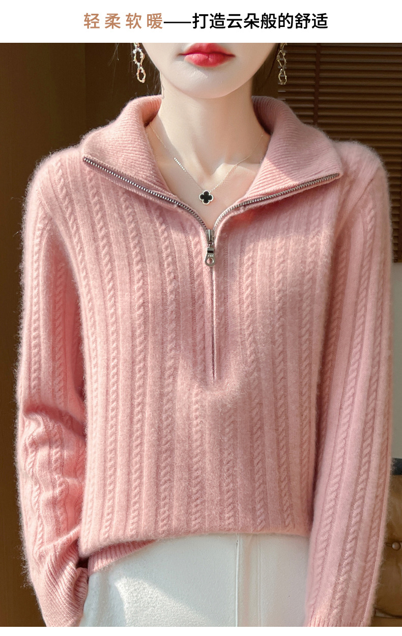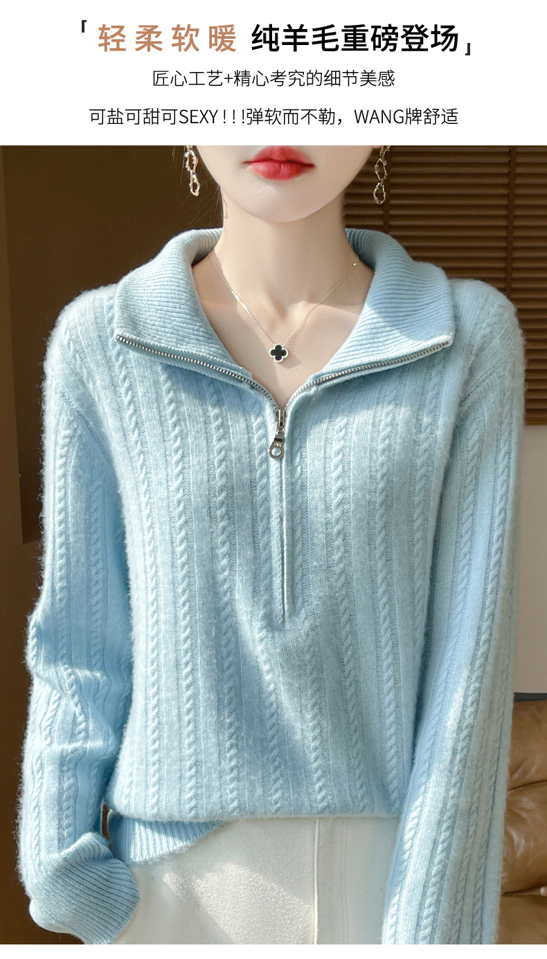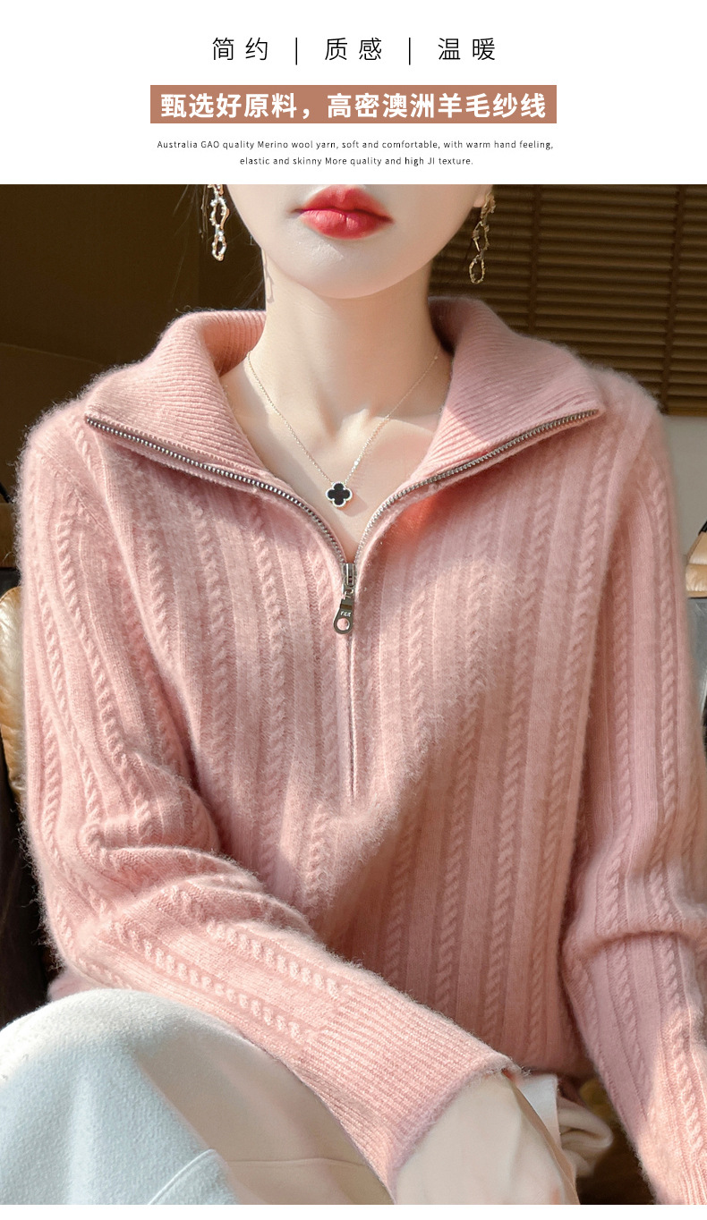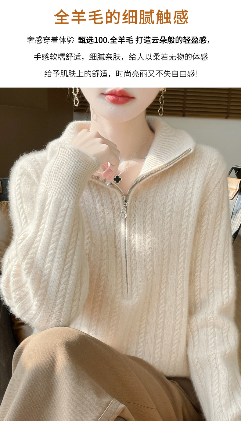 丁摩 秋冬新款翻领针织全羊毛衫女士半拉链扭花毛衣时尚气质长袖外套4ZF-367