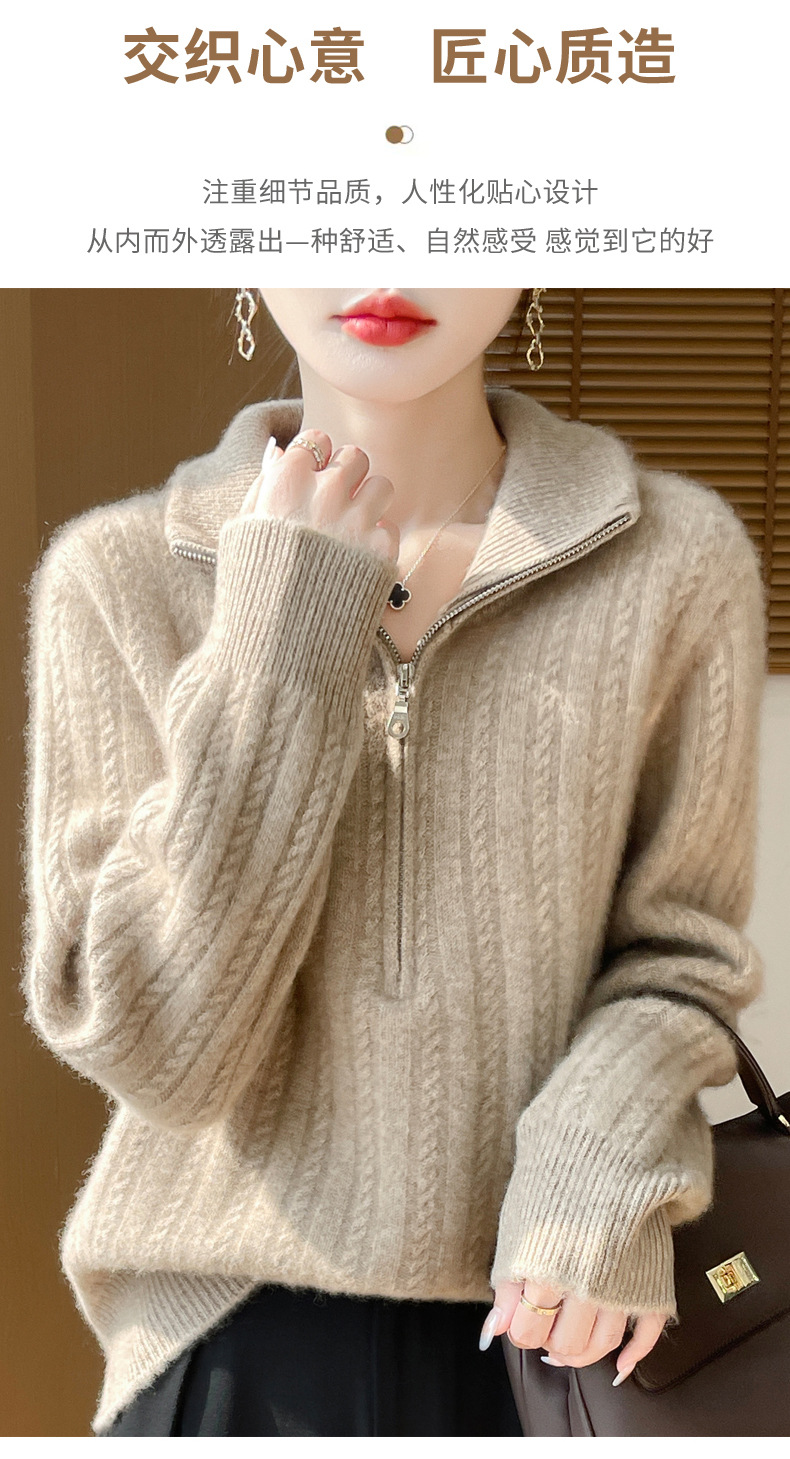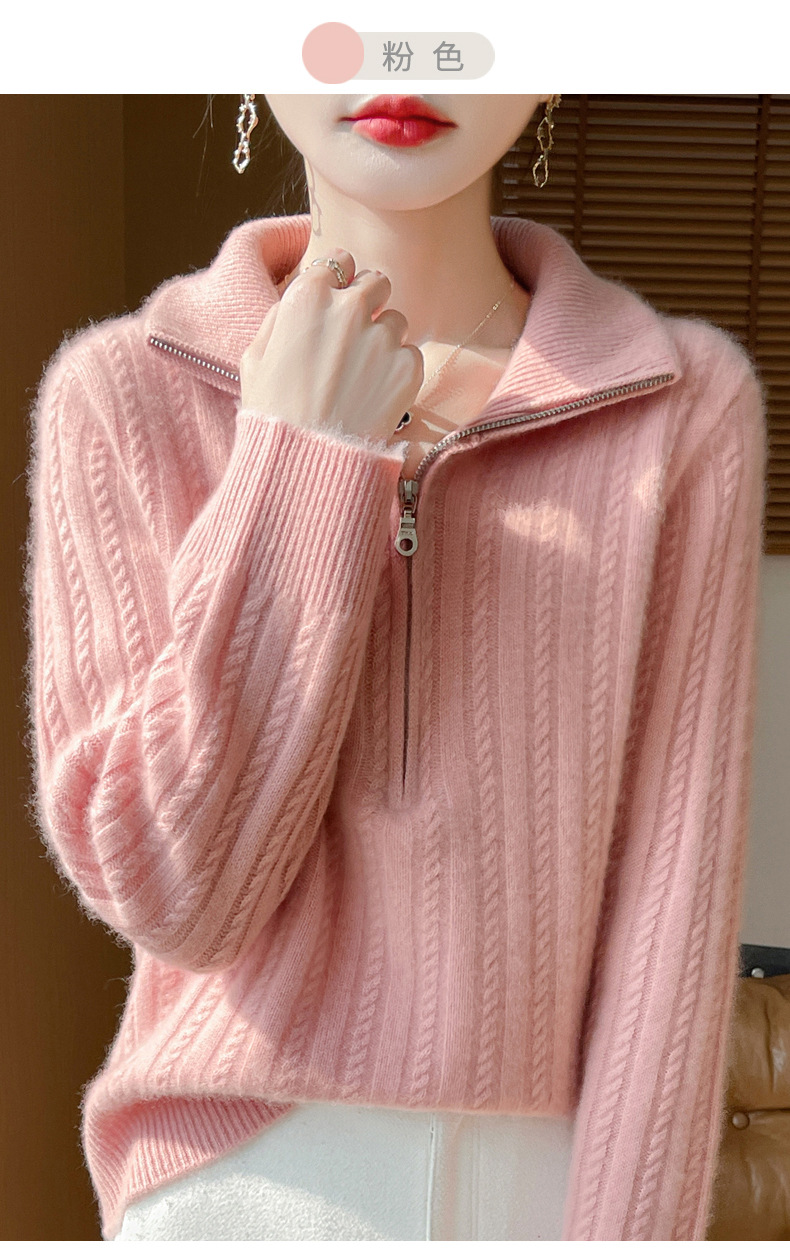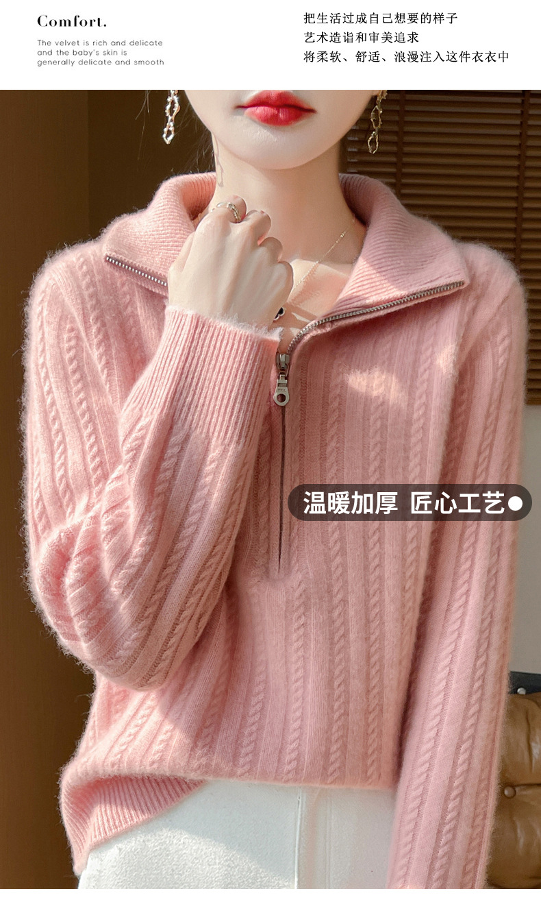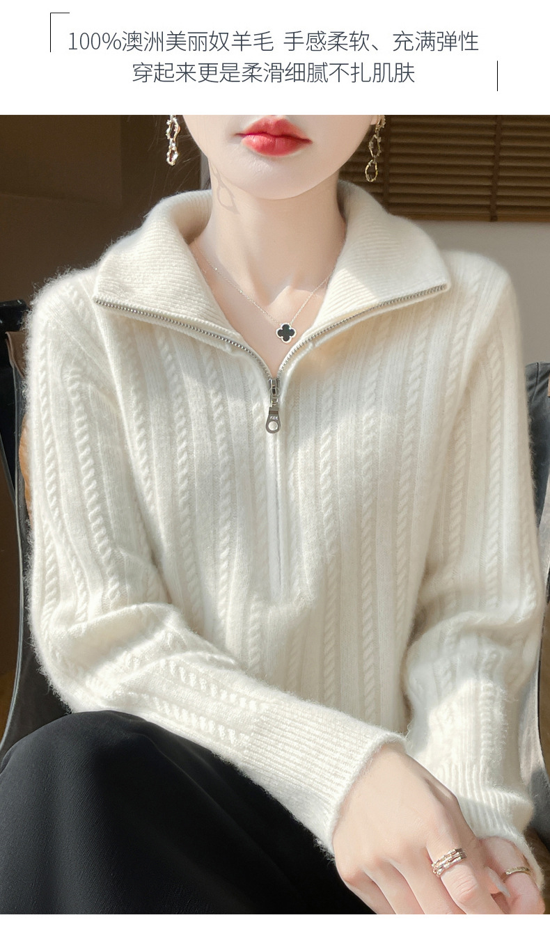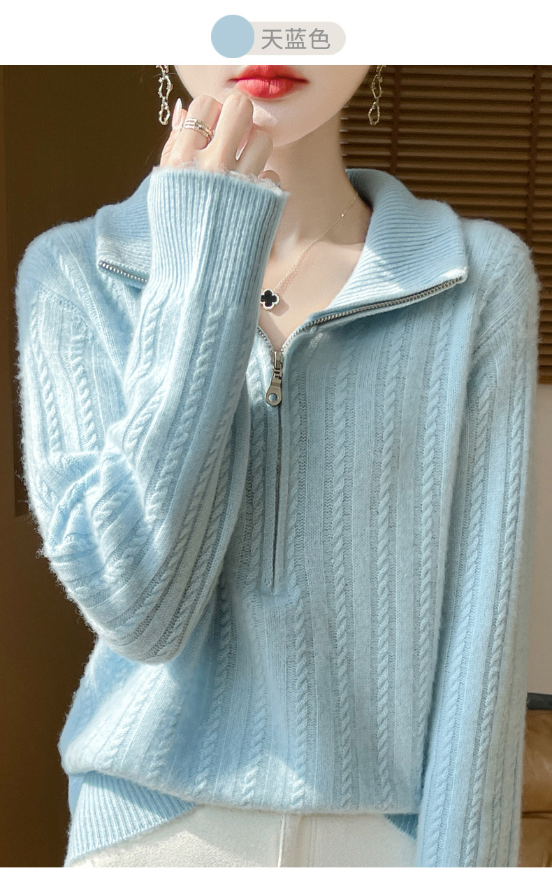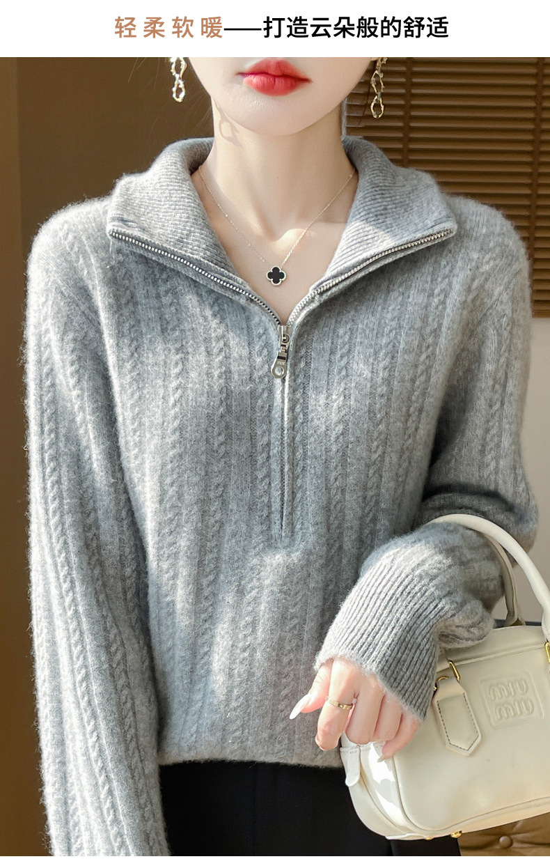 丁摩 秋冬新款翻领针织全羊毛衫女士半拉链扭花毛衣时尚气质长袖外套4ZF-367