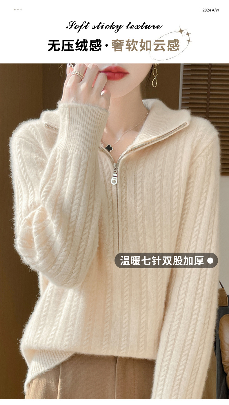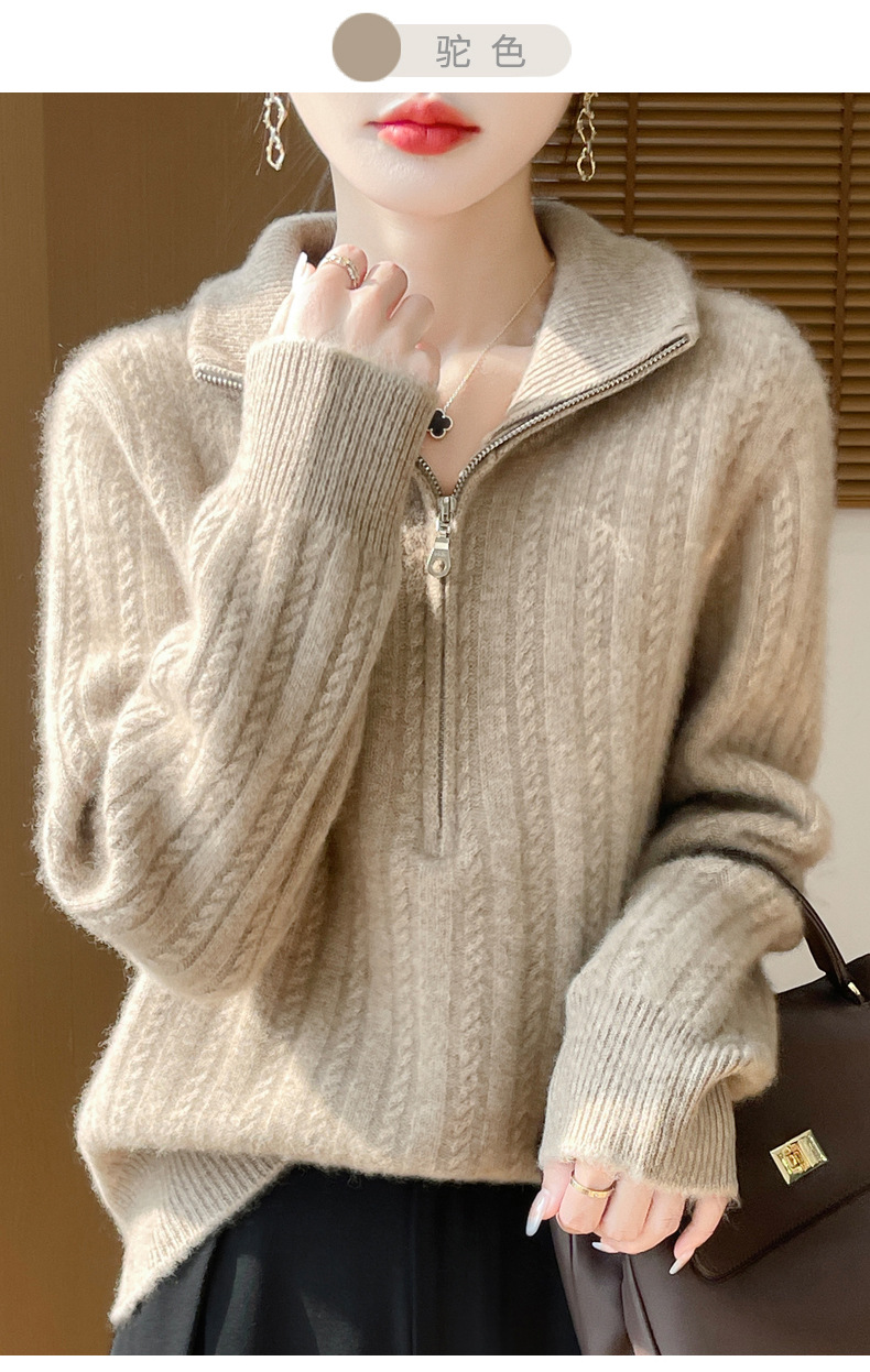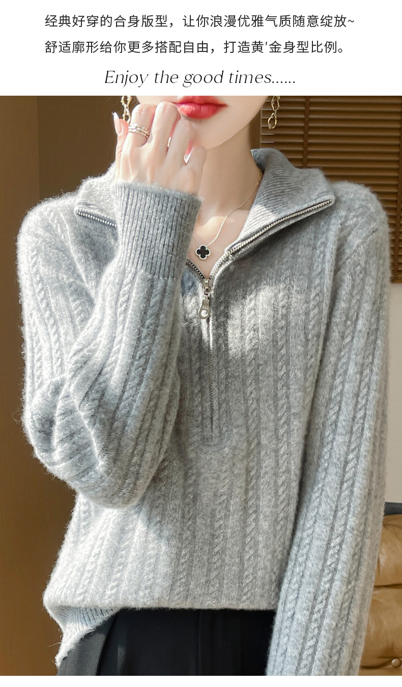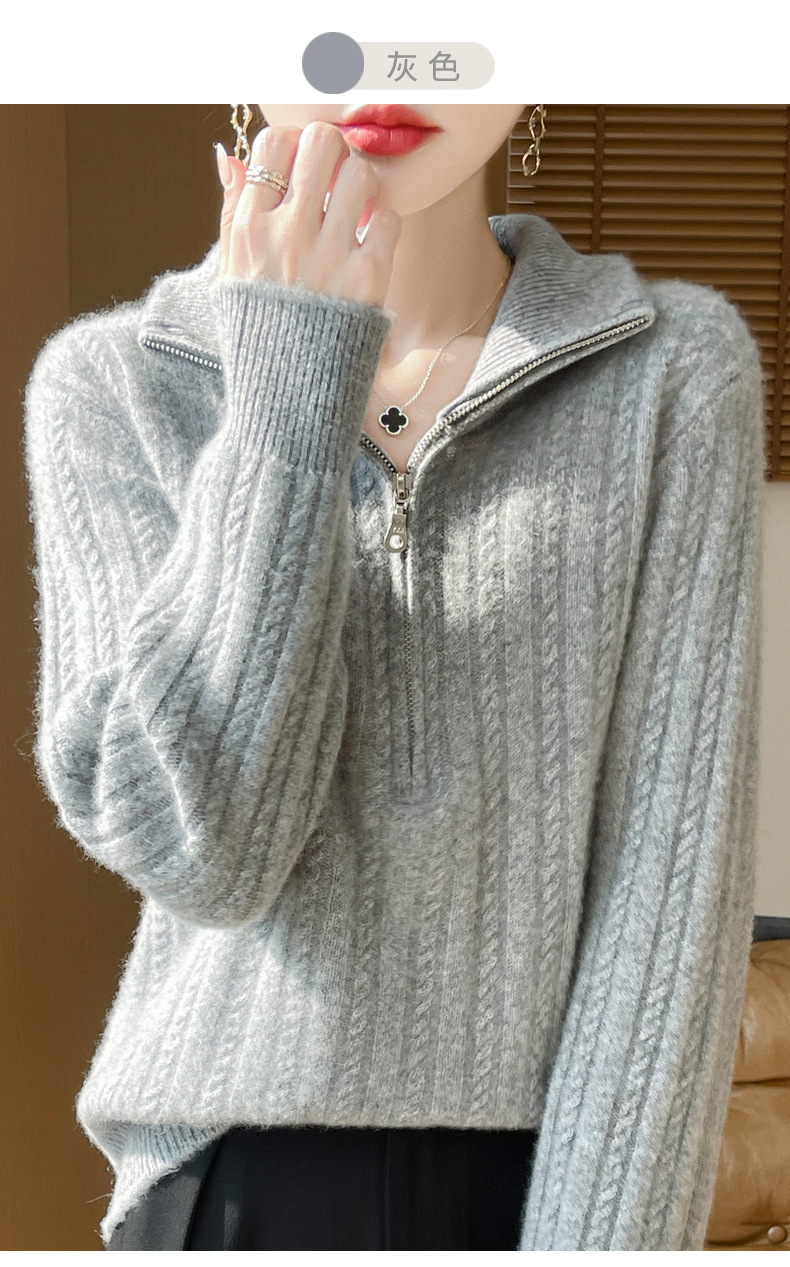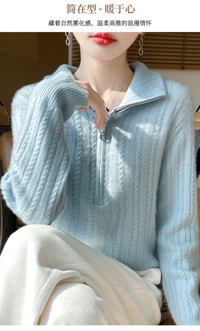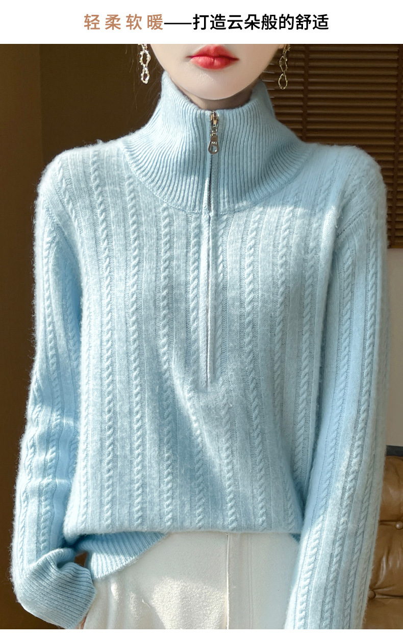 丁摩 秋冬新款翻领针织全羊毛衫女士半拉链扭花毛衣时尚气质长袖外套4ZF-367