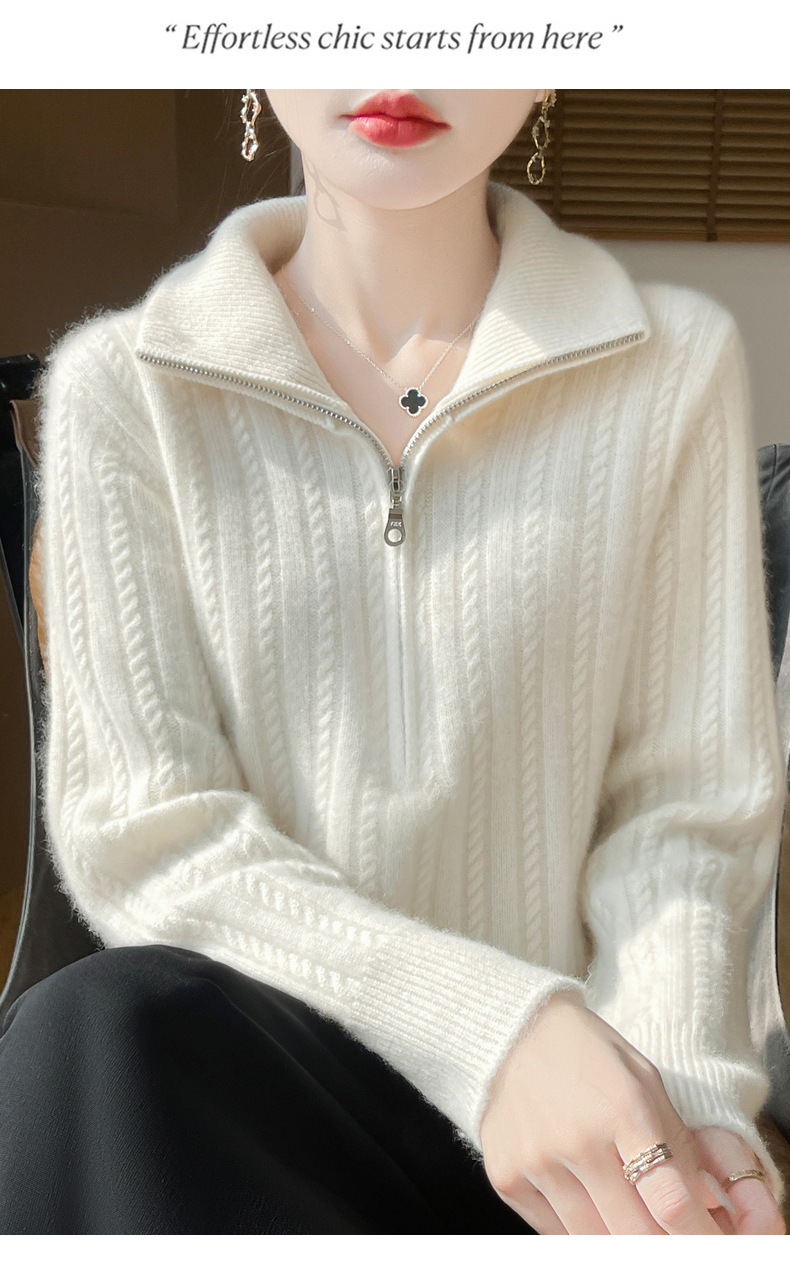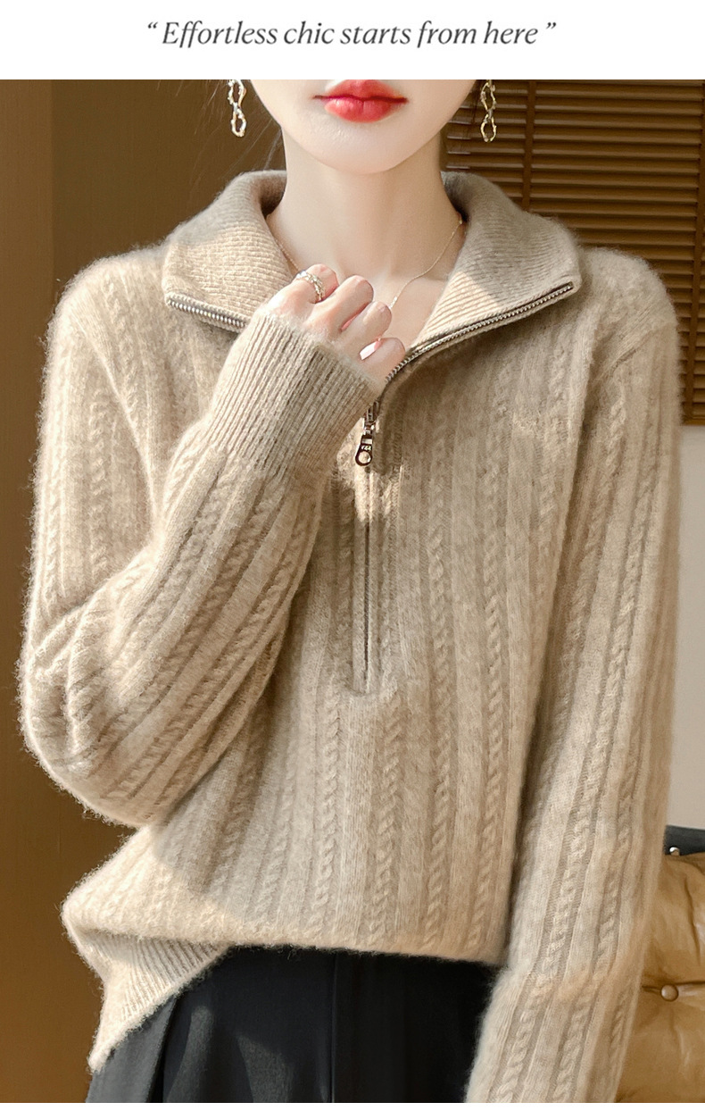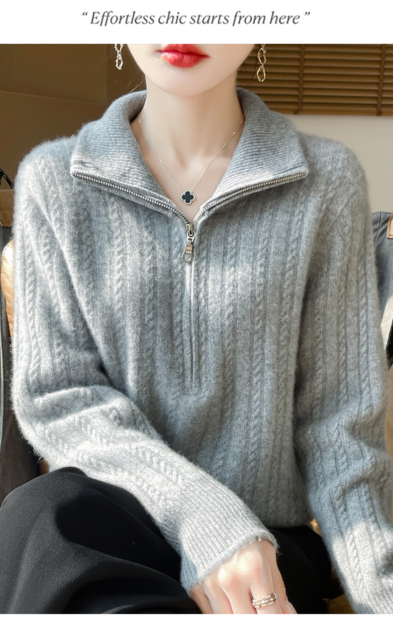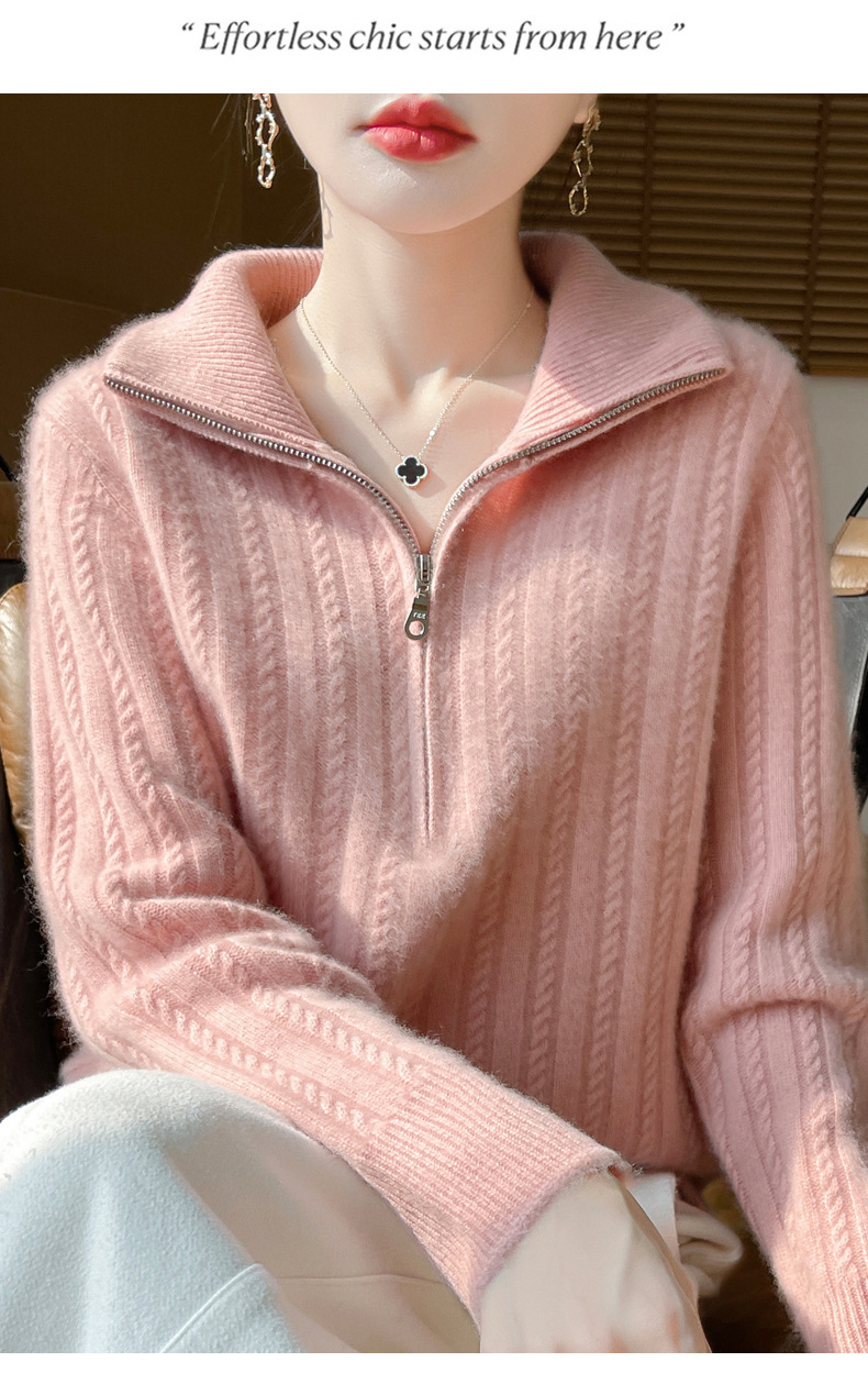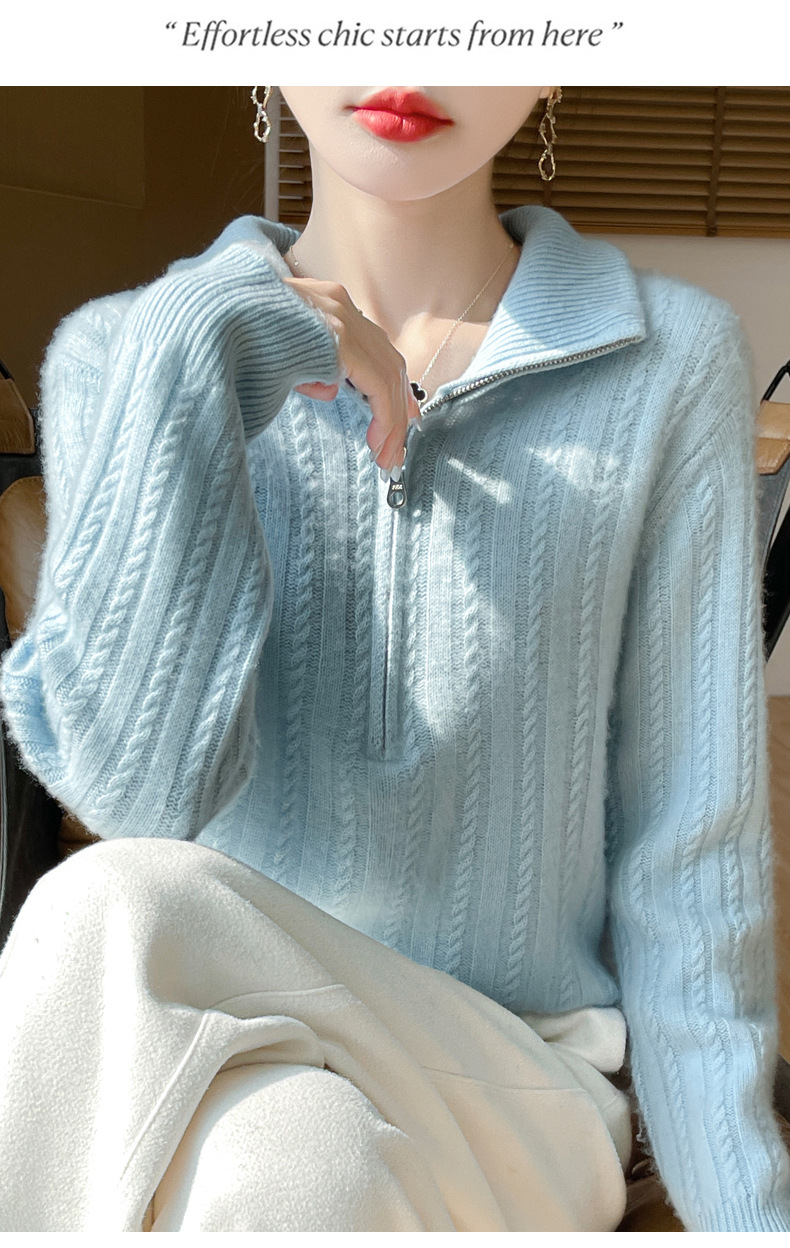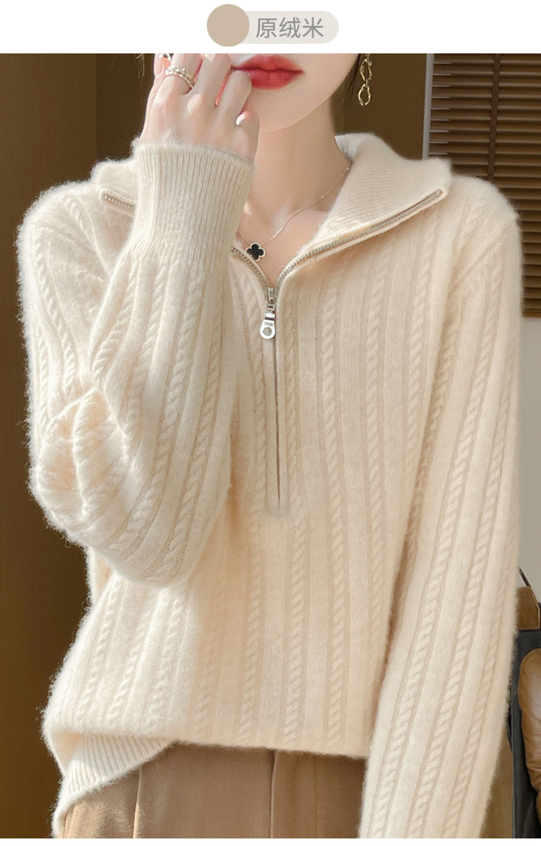 丁摩 秋冬新款翻领针织全羊毛衫女士半拉链扭花毛衣时尚气质长袖外套4ZF-367