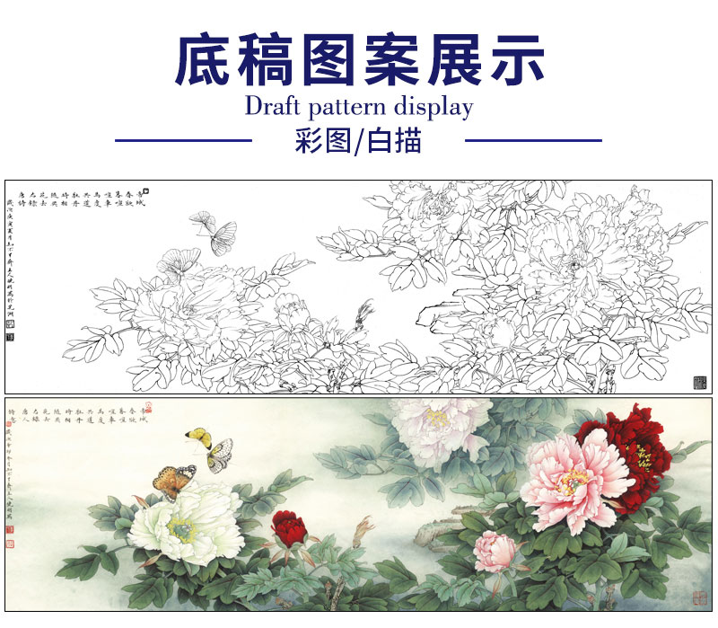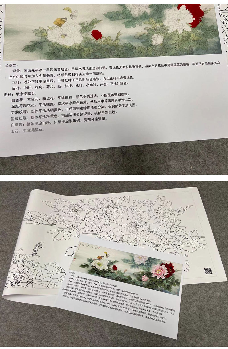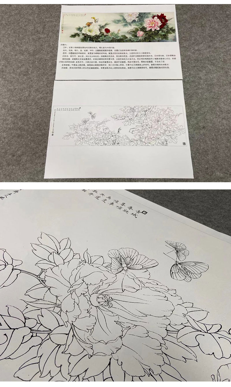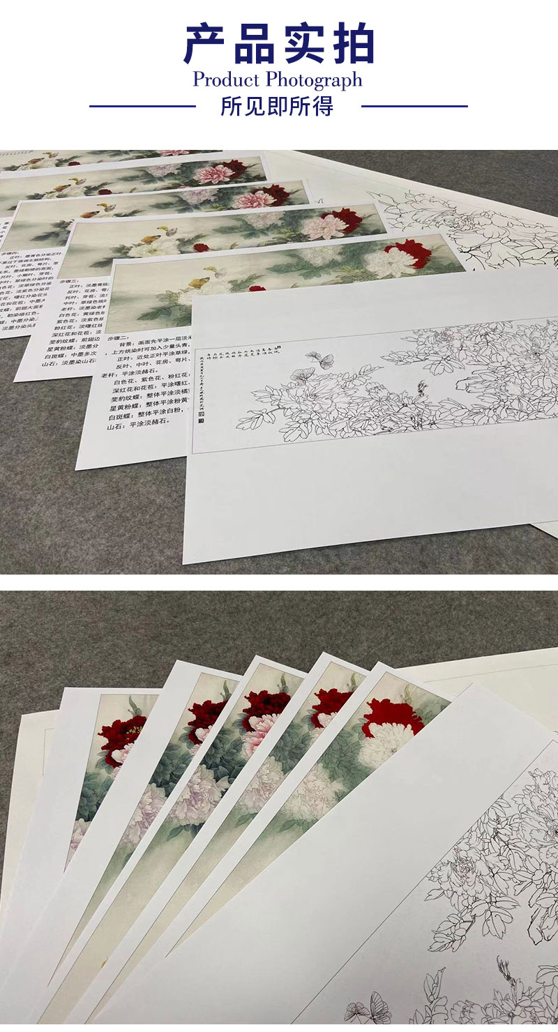 【有步骤、大彩图】李晓明横幅工笔画白描底稿《名花倾国》牡丹花初学者临摹花鸟线稿KD40