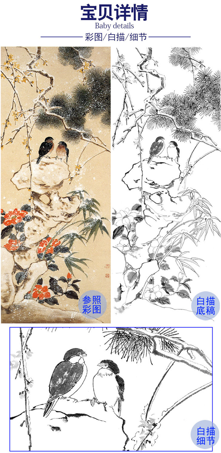 陈之佛竖幅工笔花鸟白描底稿-《岁寒三友》-多种白描尺寸可选-QA38