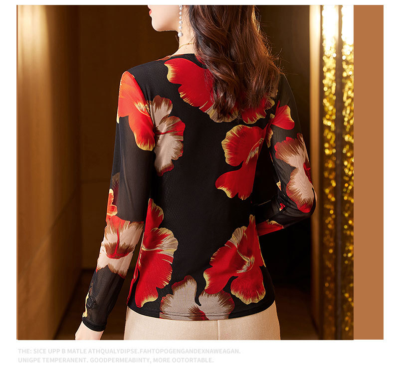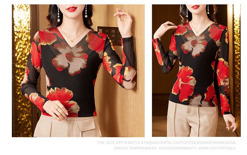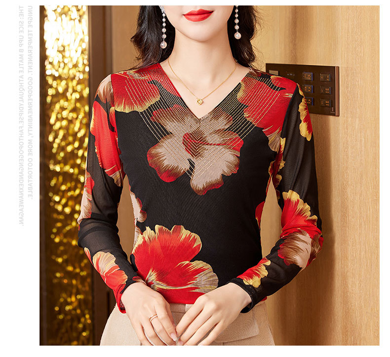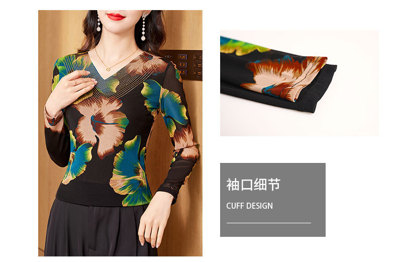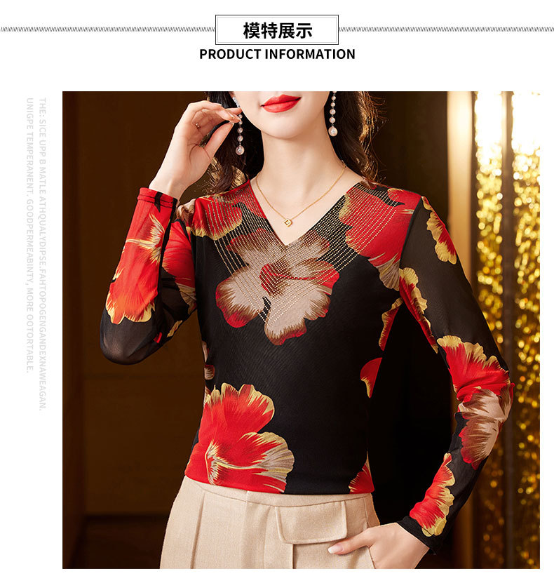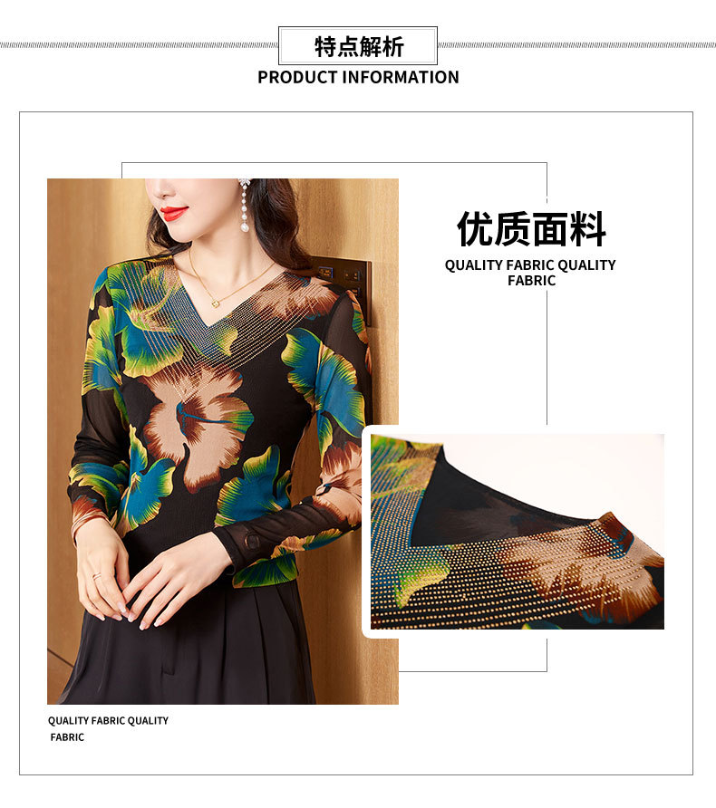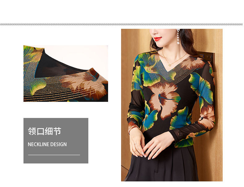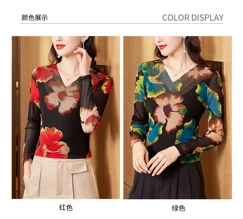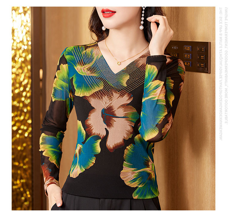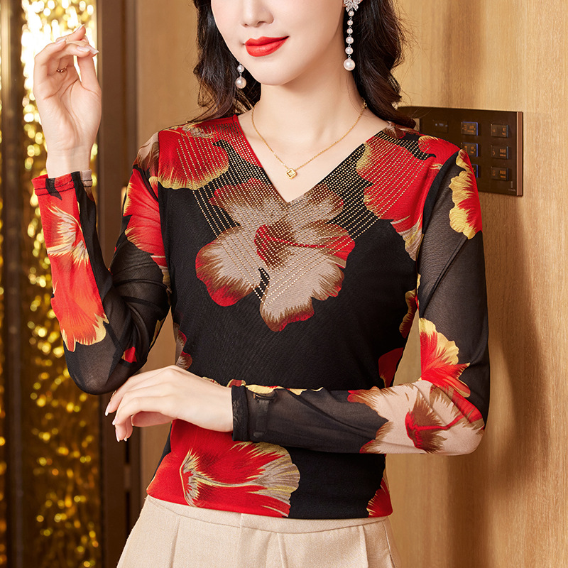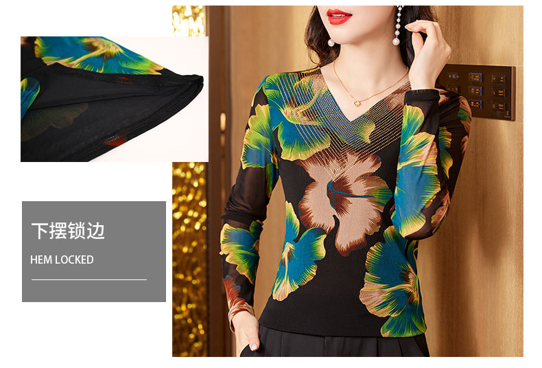 KQL-426H3253秋季新款时尚洋气V领烫钻网纱气质显瘦长袖百搭小衫打底衫女