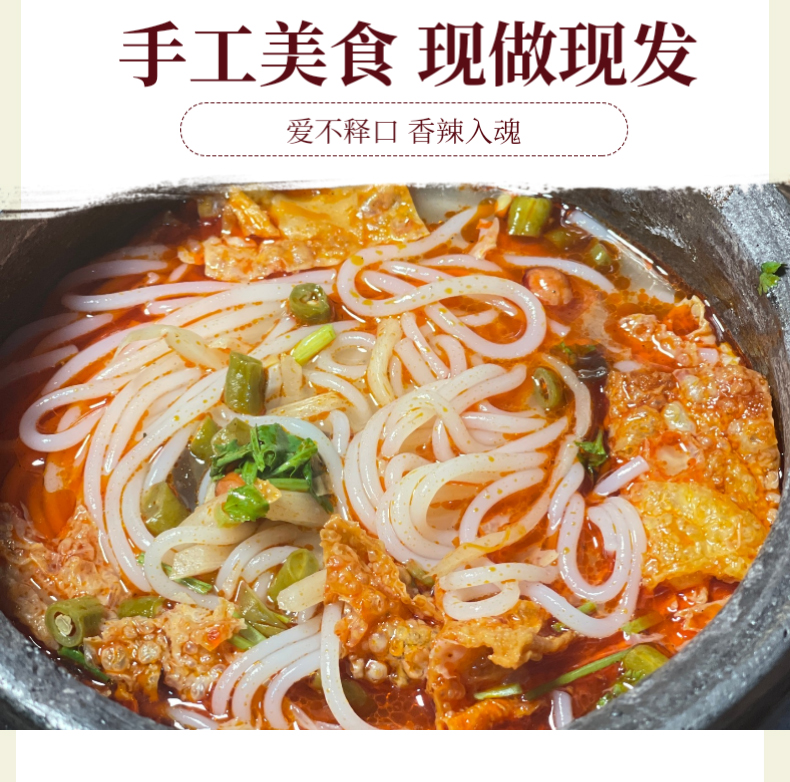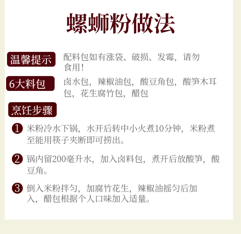 【食用方法】冷水入锅中小火煮10分钟左右至米粉能用筷子夹断即可,捞出备用,锅里加入200毫升水,水开加入卤水包,酸豆角,酸笋包,辣椒油包,倒入米粉,腐竹花生包,醋包根据口味加入。