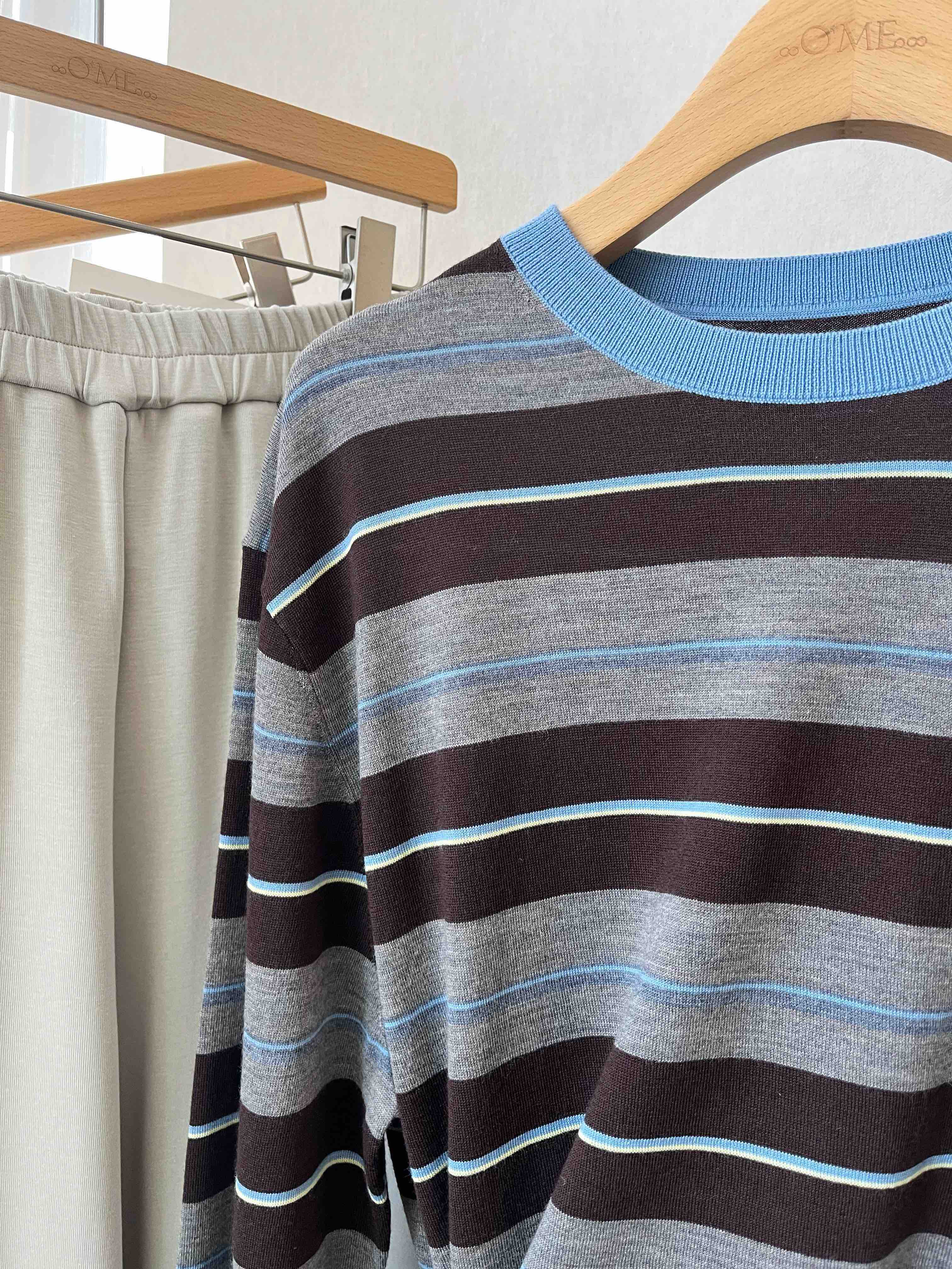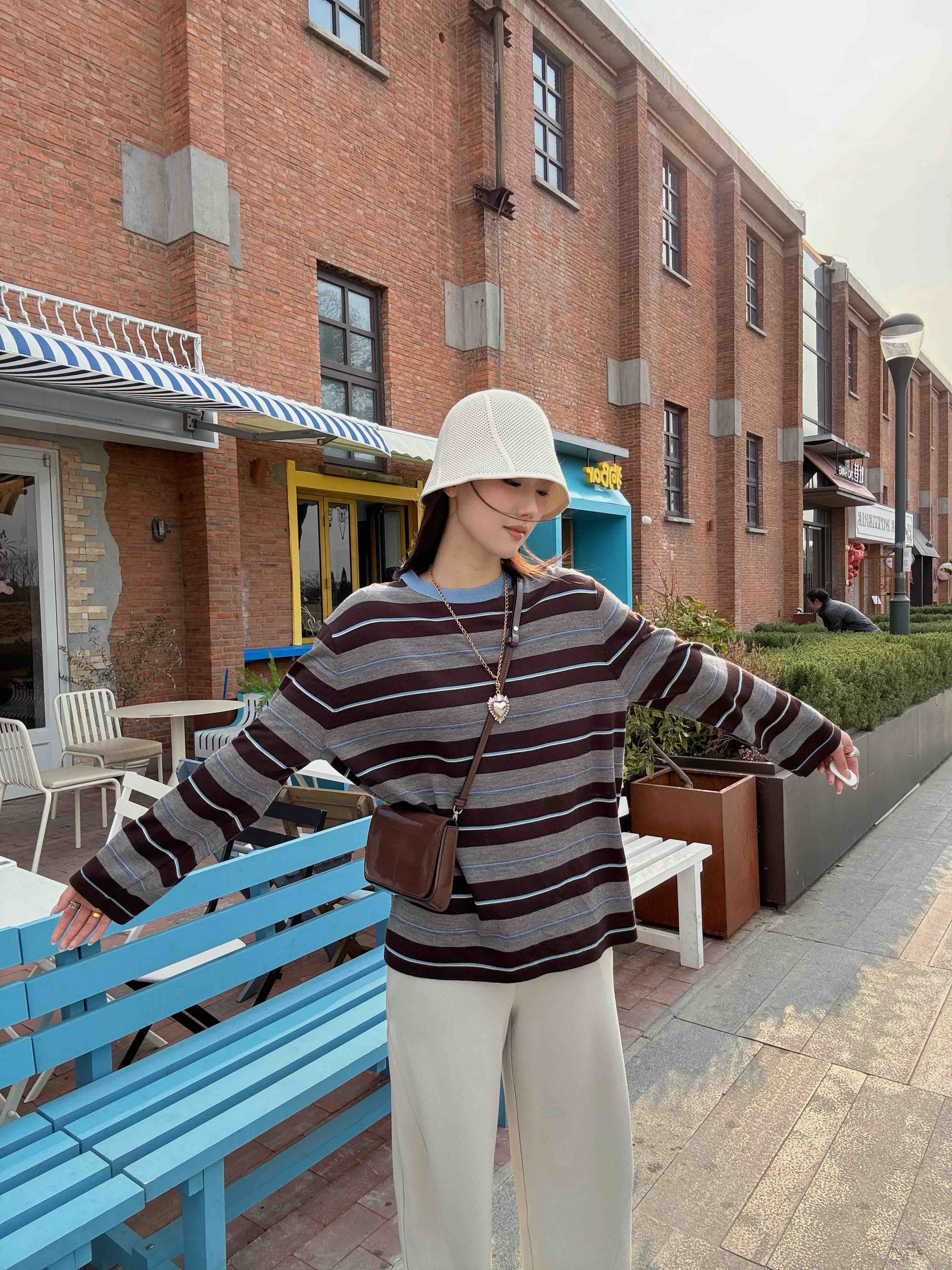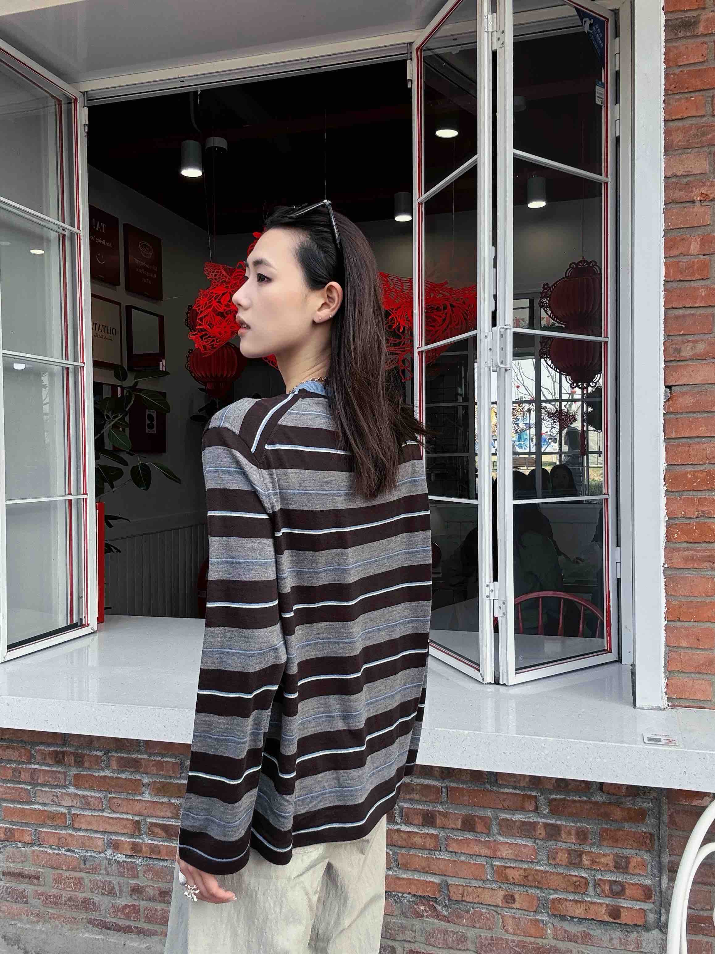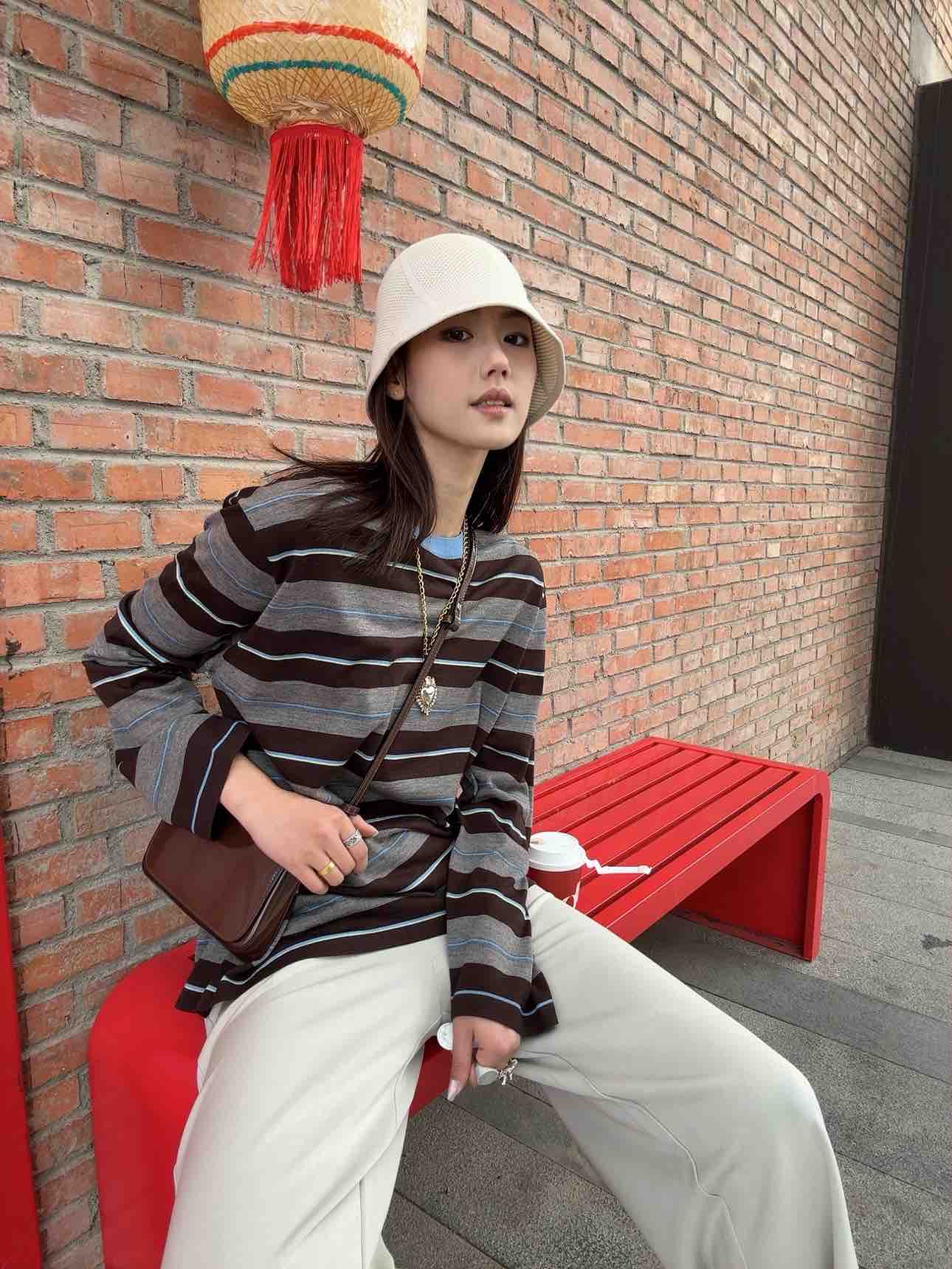 “这件条纹衫把慵懒和精致平衡得刚刚好——天蓝领口是灵魂,咖灰拼色是底气,宽松版型是心机!”