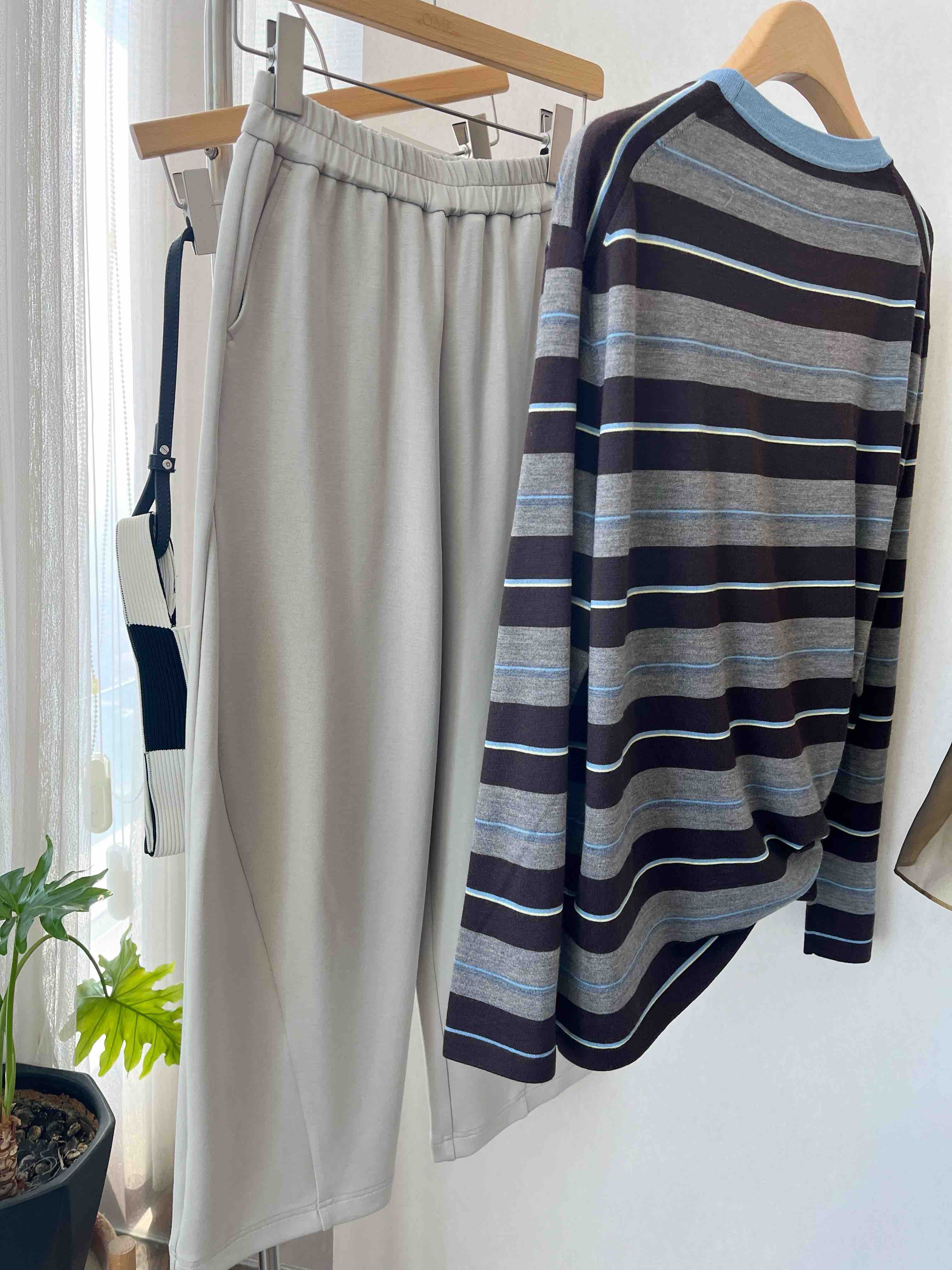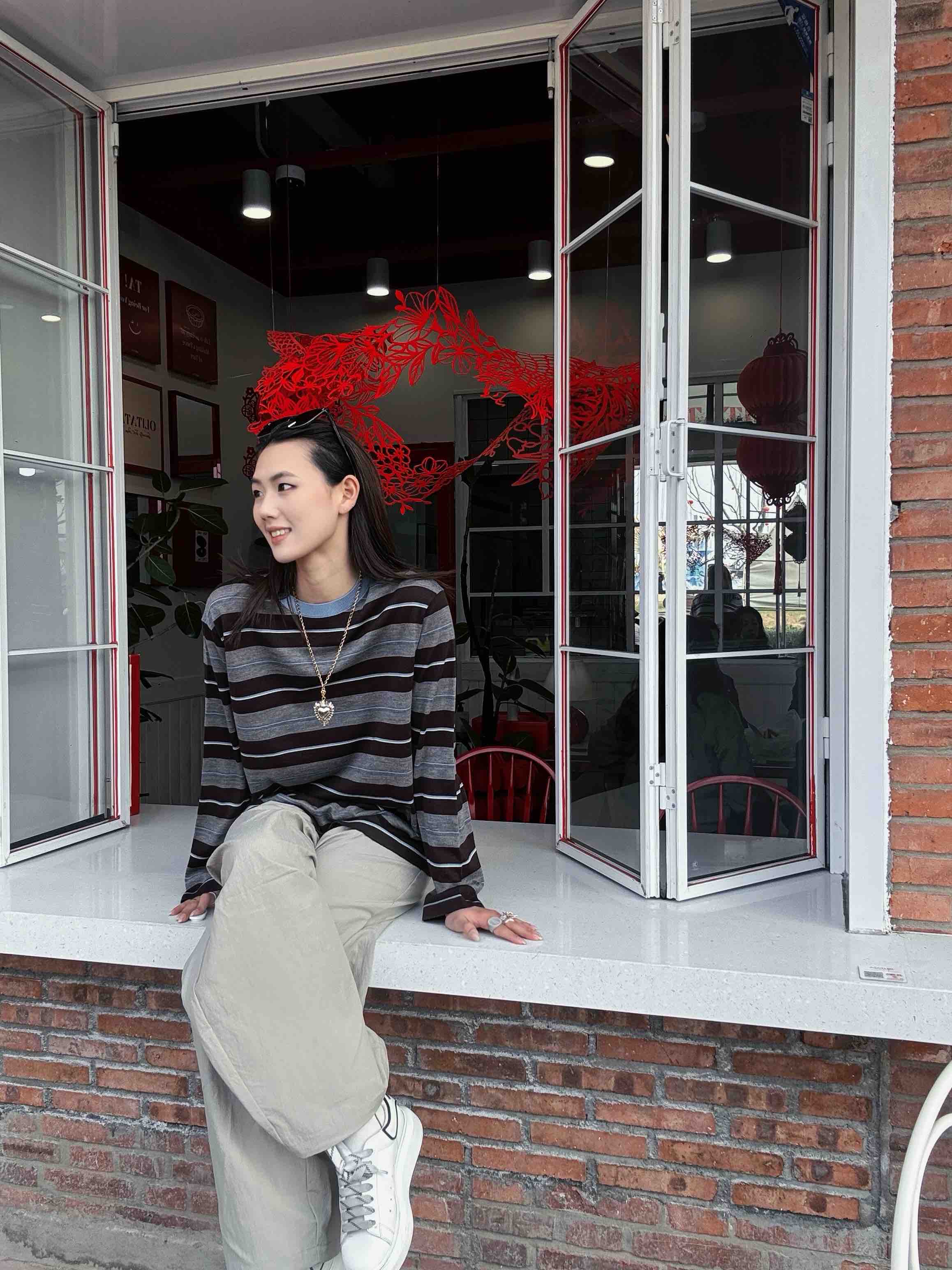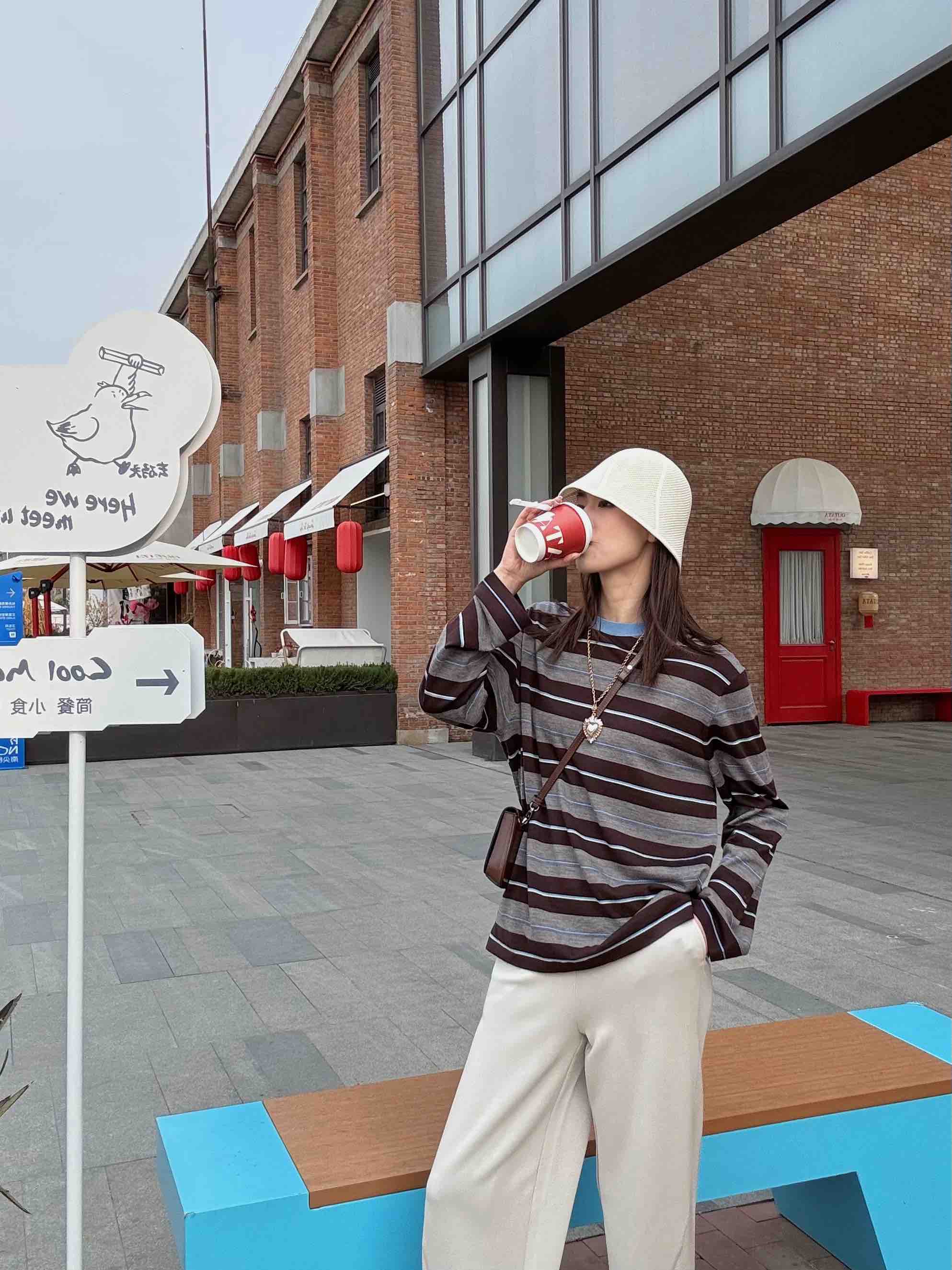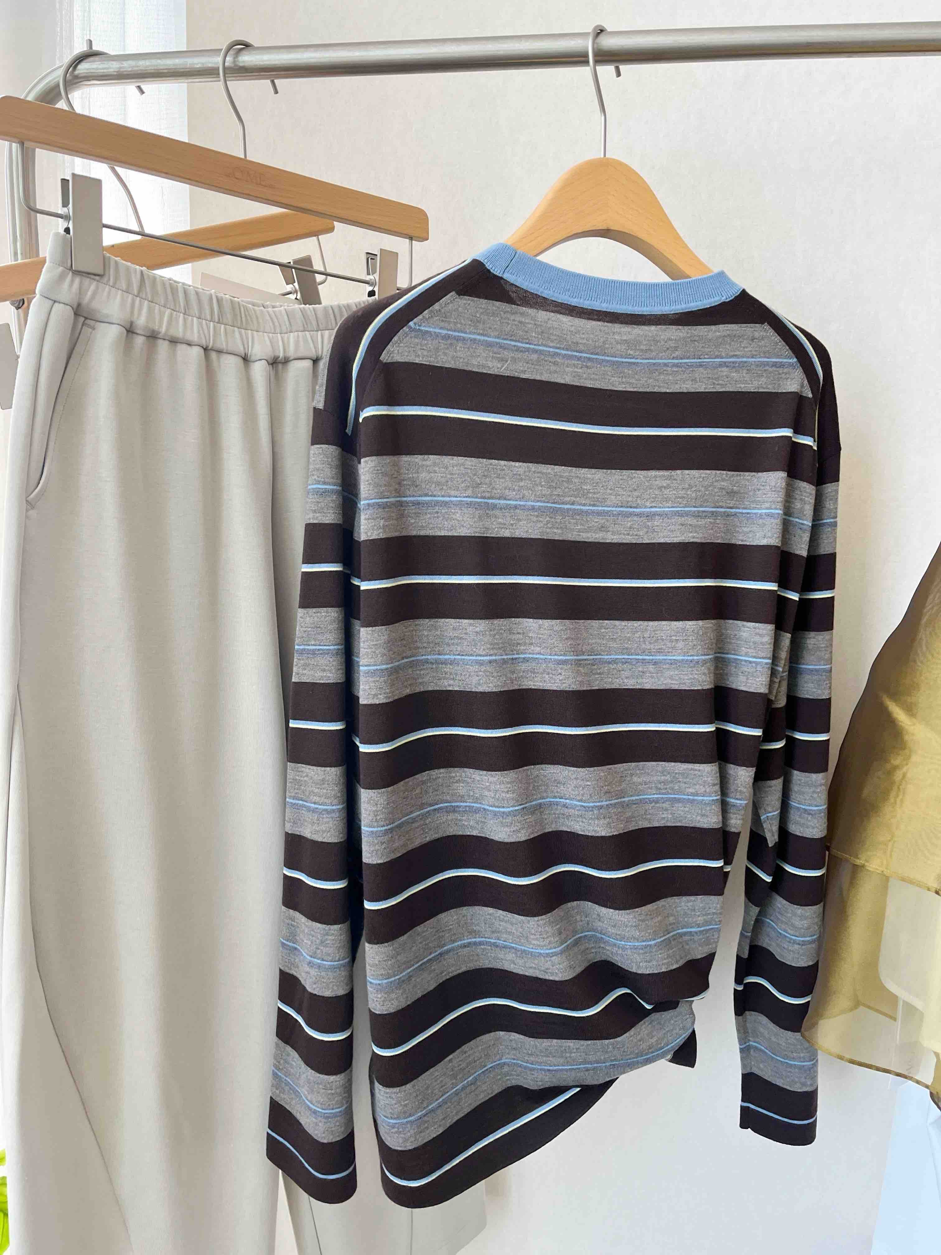 “这件条纹衫把慵懒和精致平衡得刚刚好——天蓝领口是灵魂,咖灰拼色是底气,宽松版型是心机!”