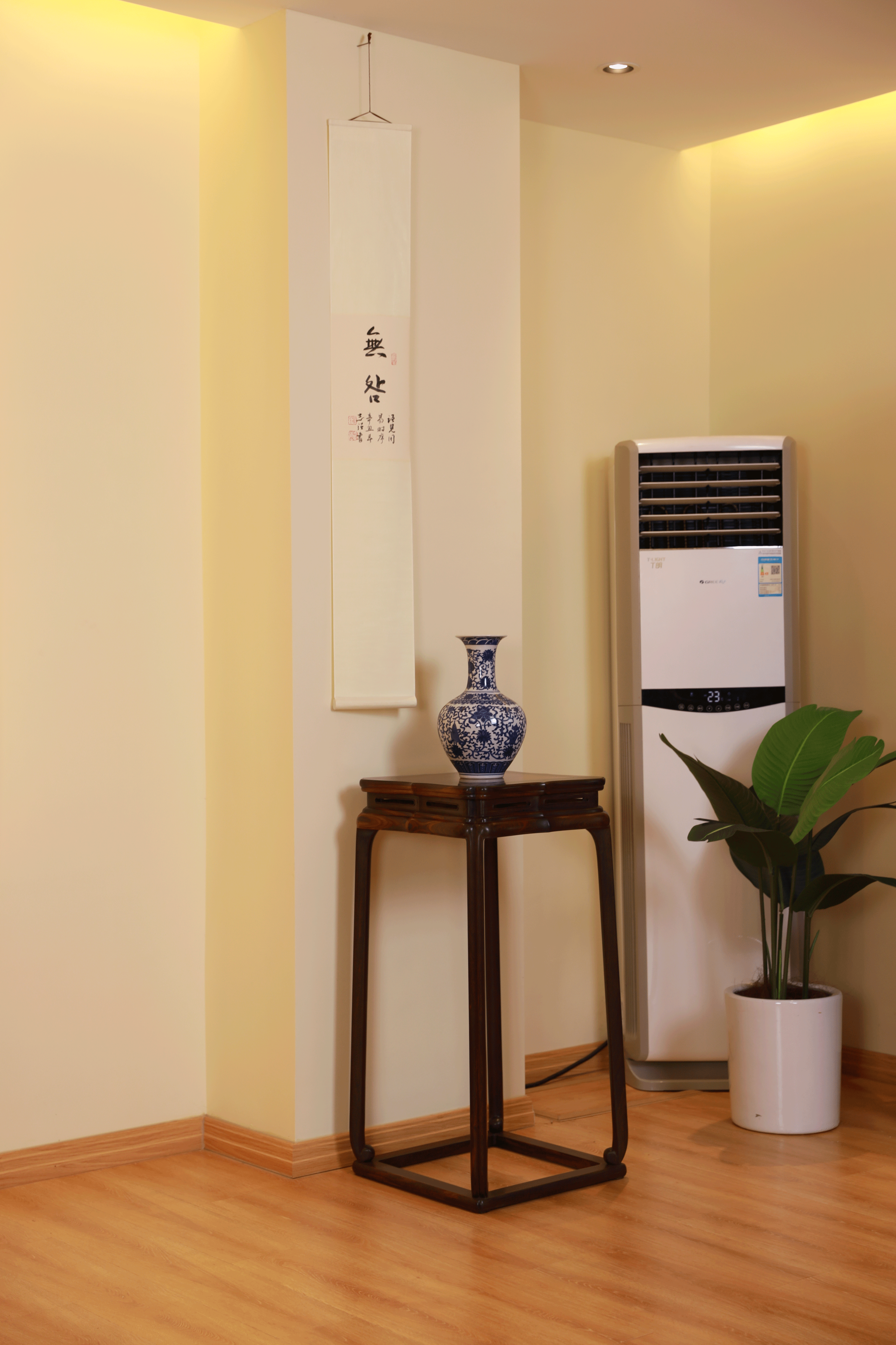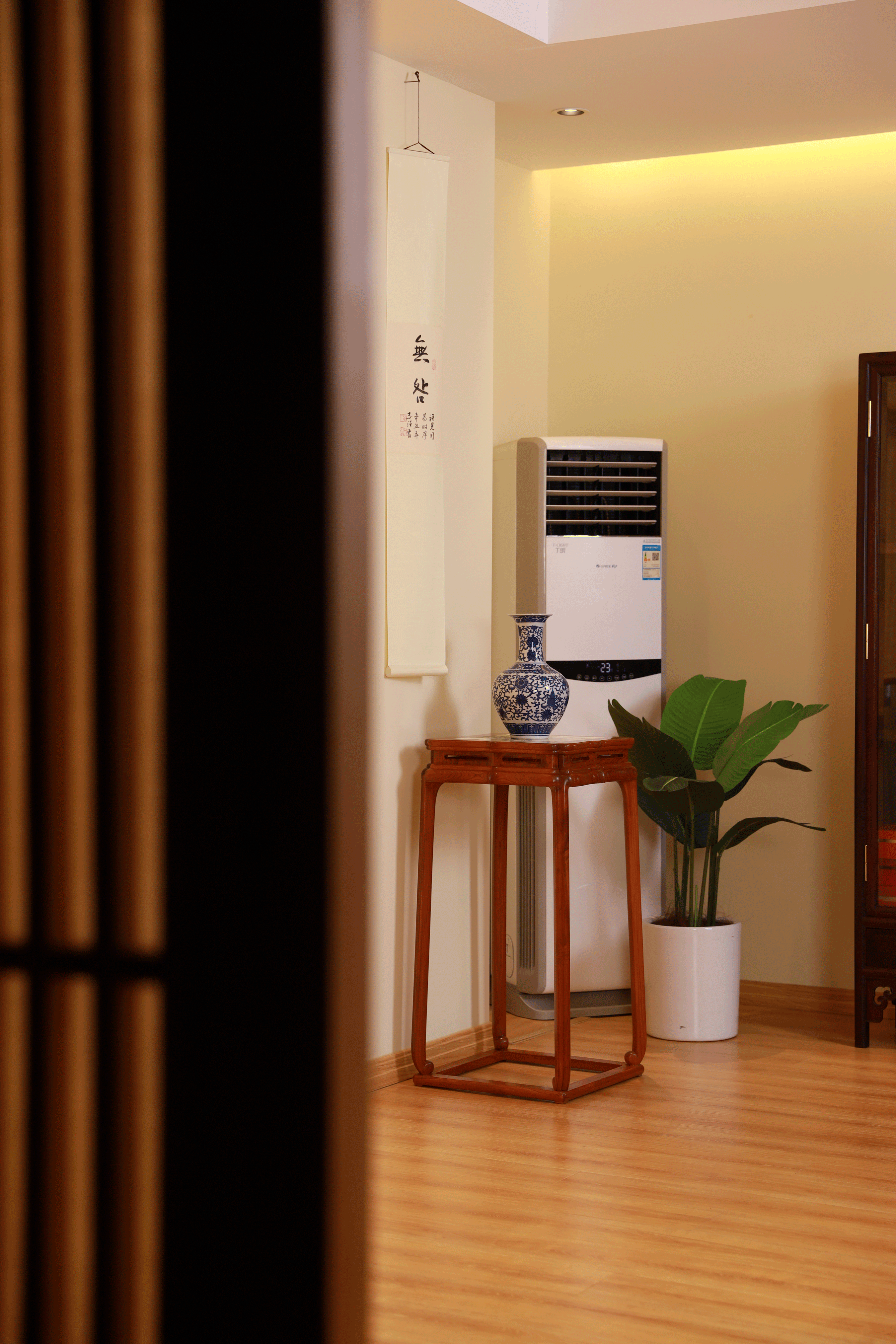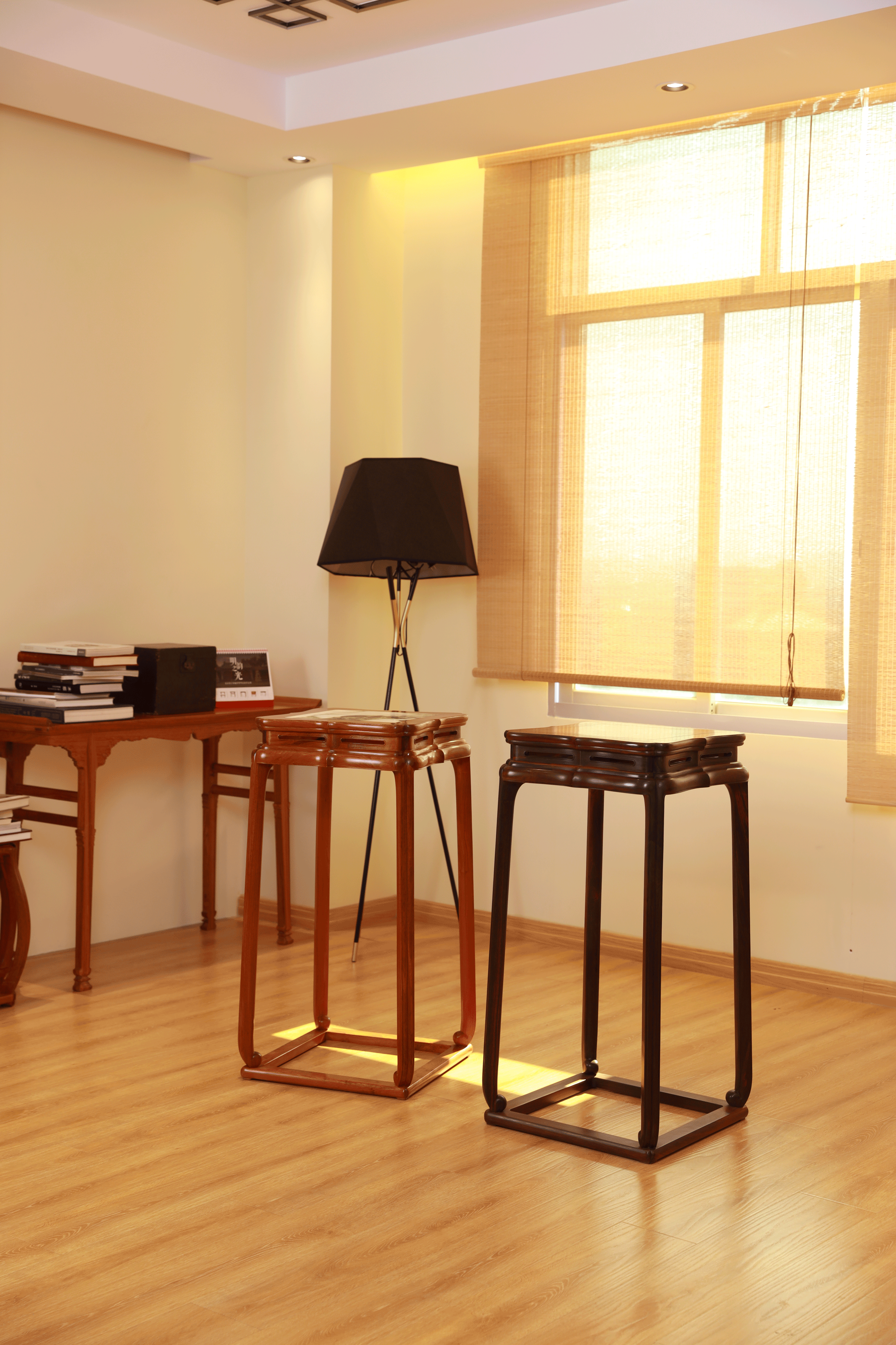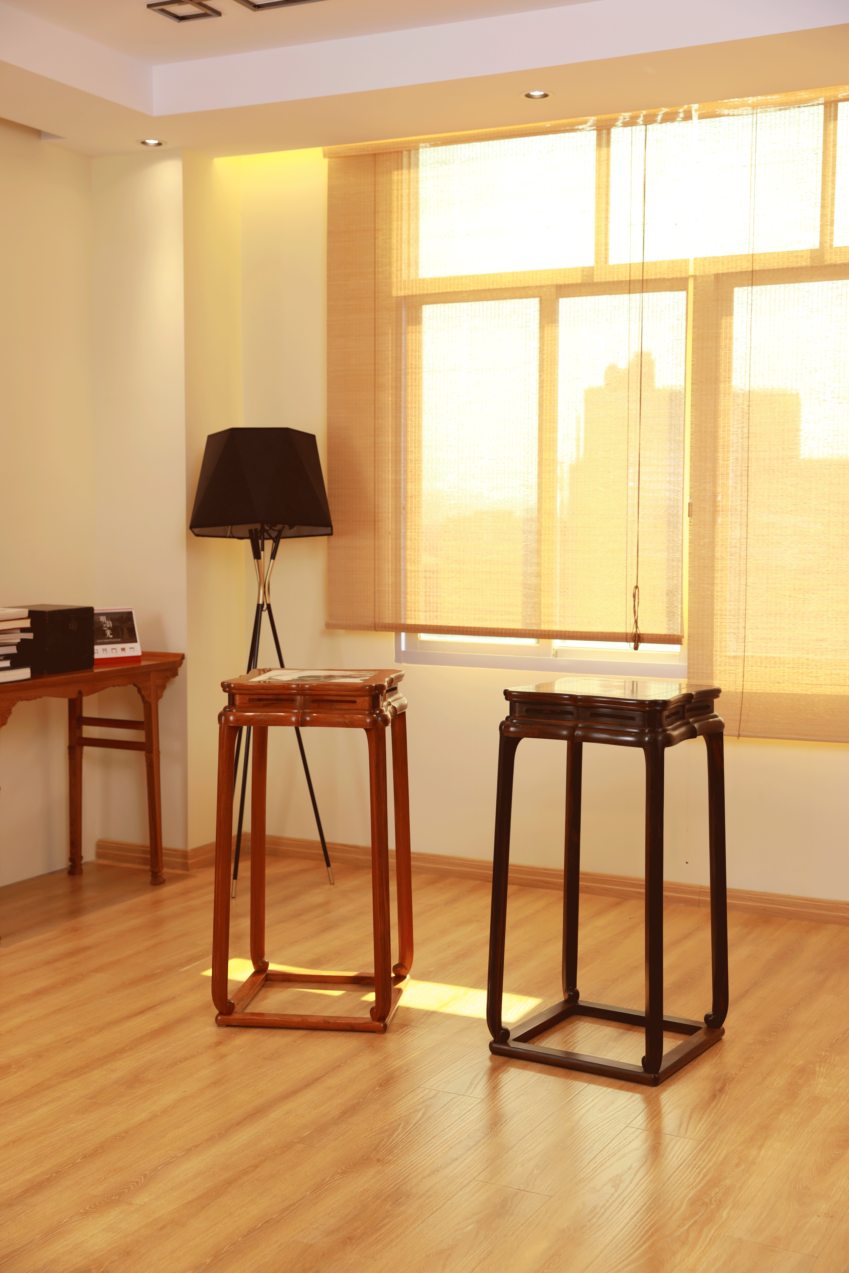 几腿内侧可见上端较为粗硕,起承重支柱作用,近足端渐细长,获得宽敞的视觉感。整器造型较为素朴,事繁之处尽用于四面边线的营造。安氏在书中断言其并非香几或架几,而是放置灯笼或烛台的照明类承具,今可做花架或空间陈设之用。