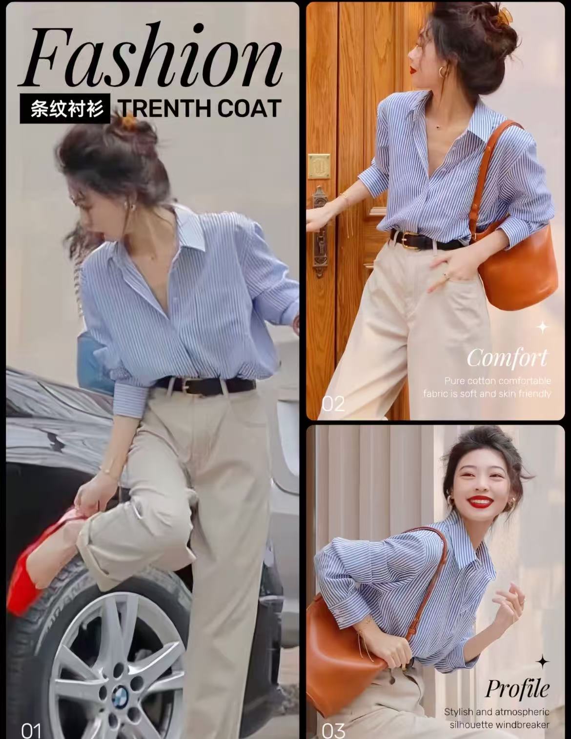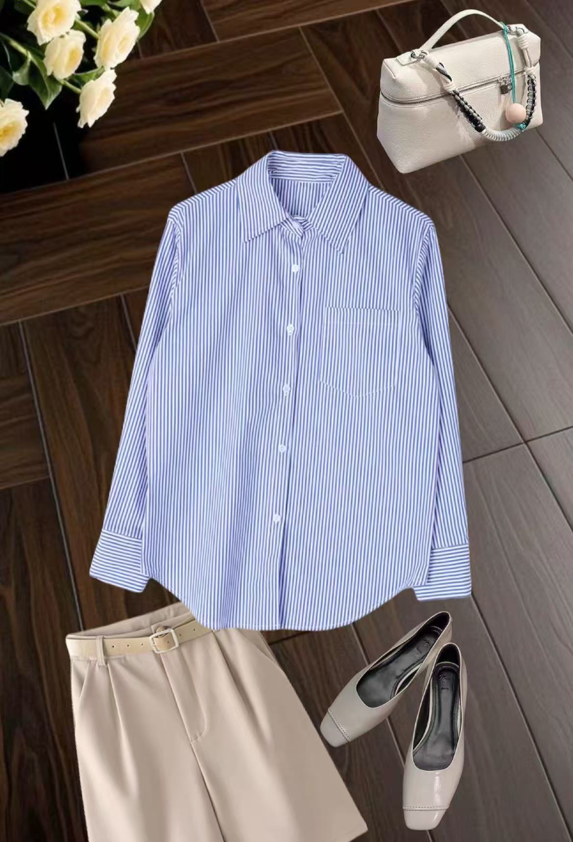 【秋上新】吉妮品牌 042蓝色口袋条纹衬衫-喜出