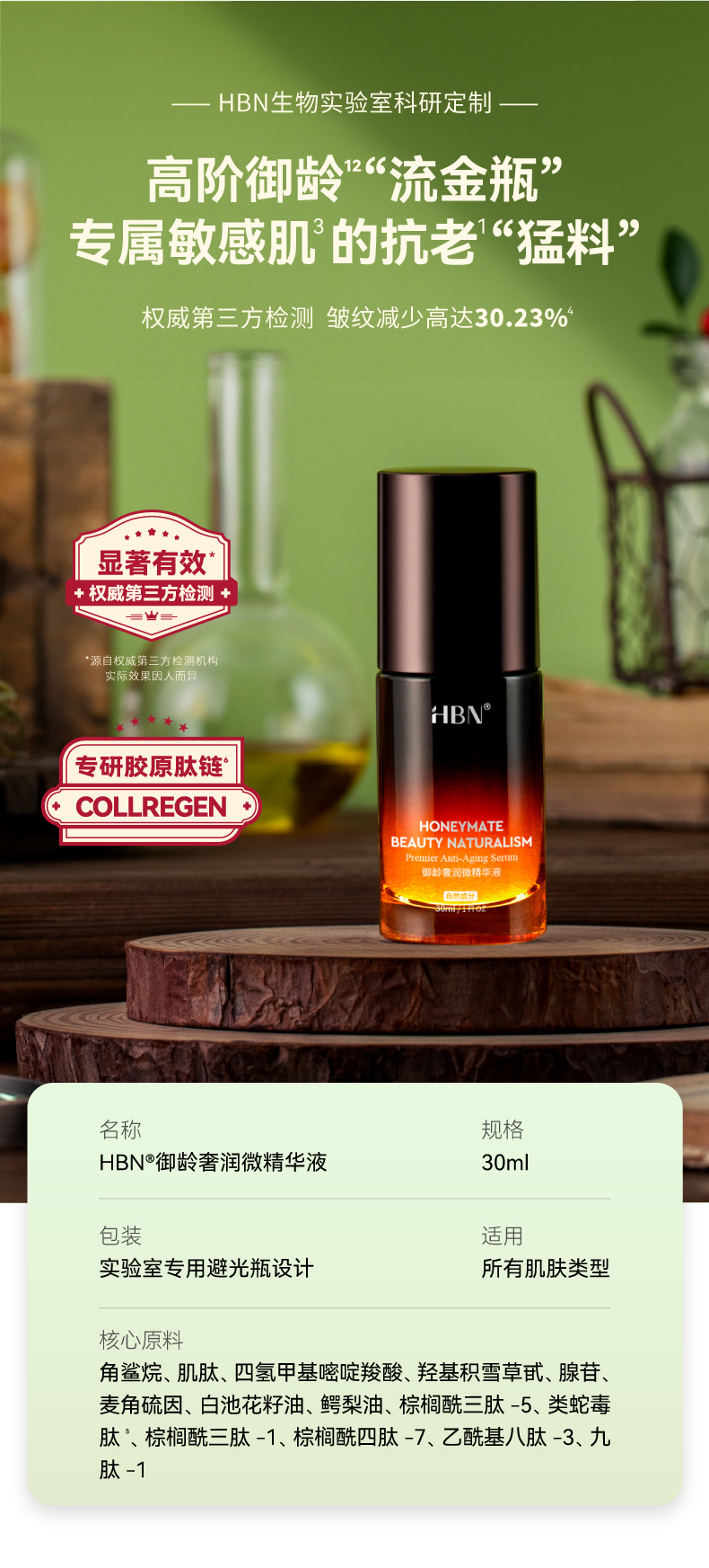 2025【流金瓶精华】HBN 御龄润微精华液 高浓度胜肽 专属敏感肌的抗老精华