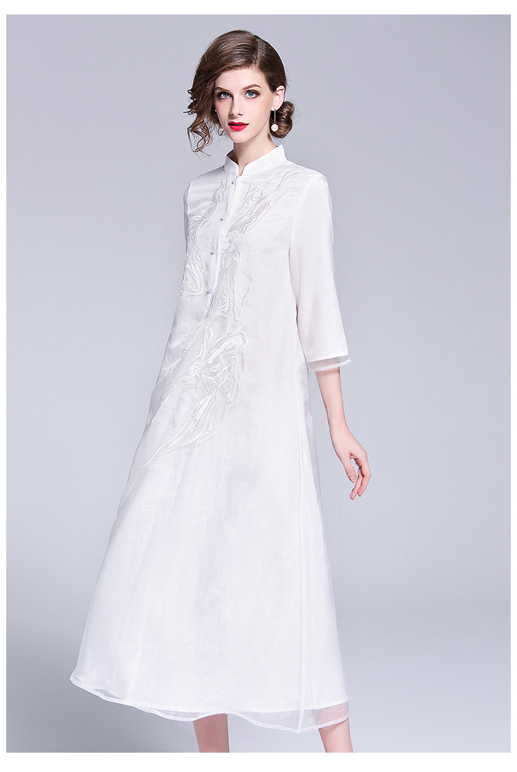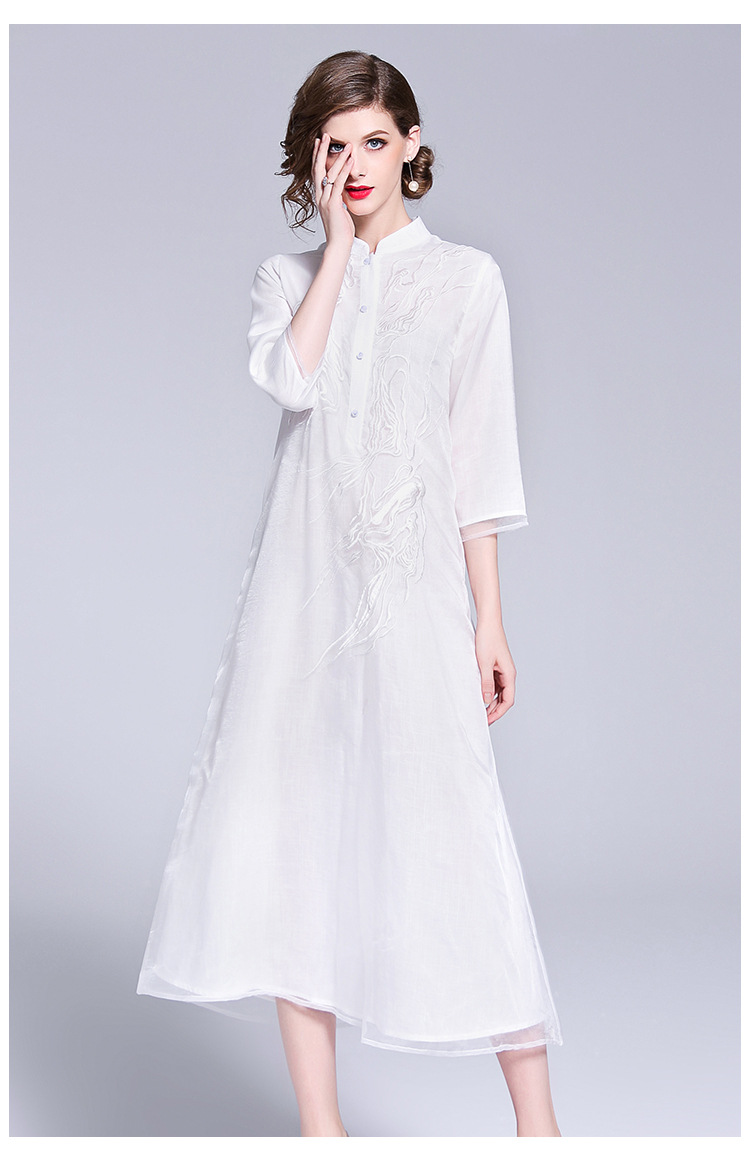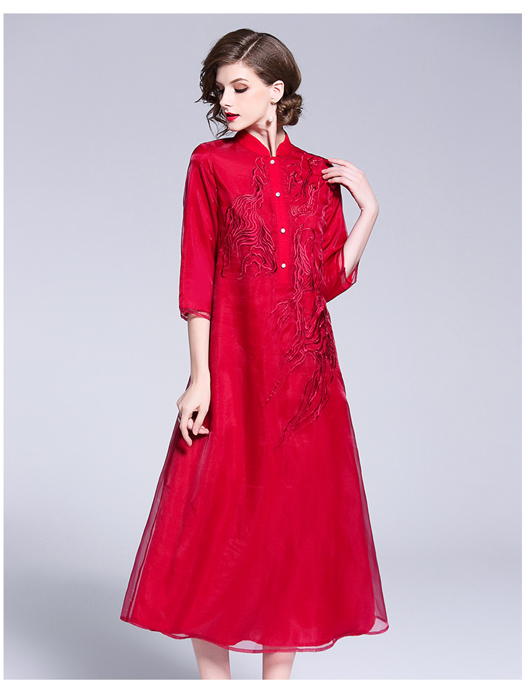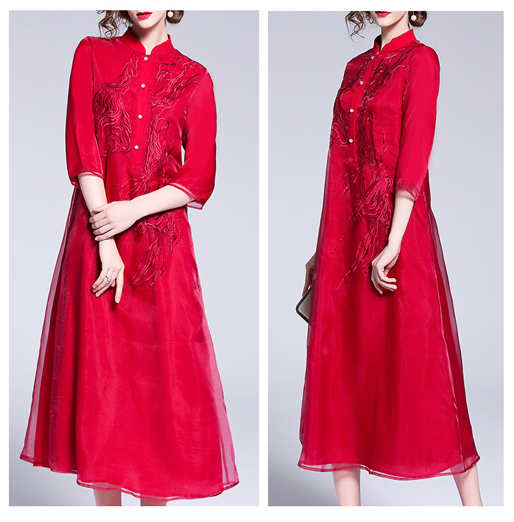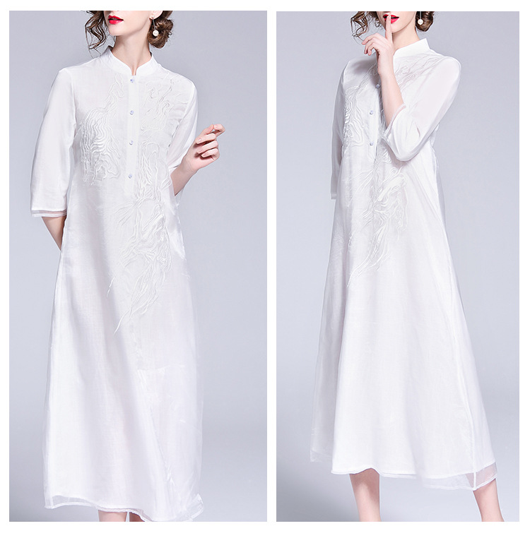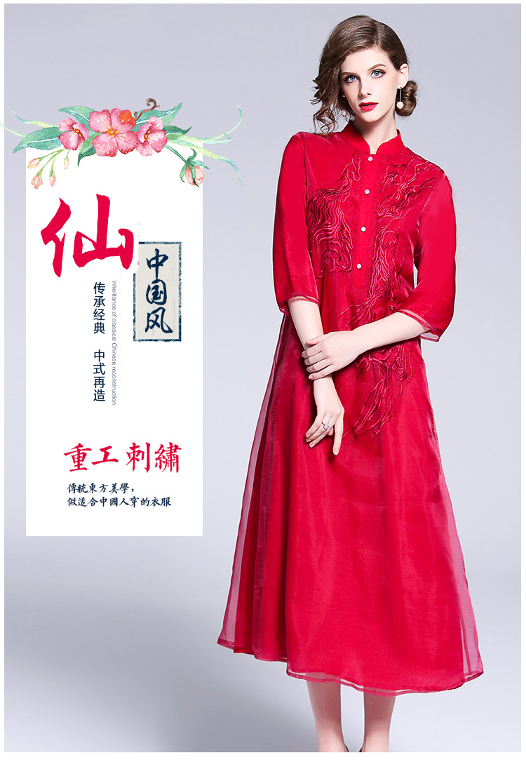 中式复古欧根纱茶服刺绣改良旗袍中长款连衣裙 YFN18156